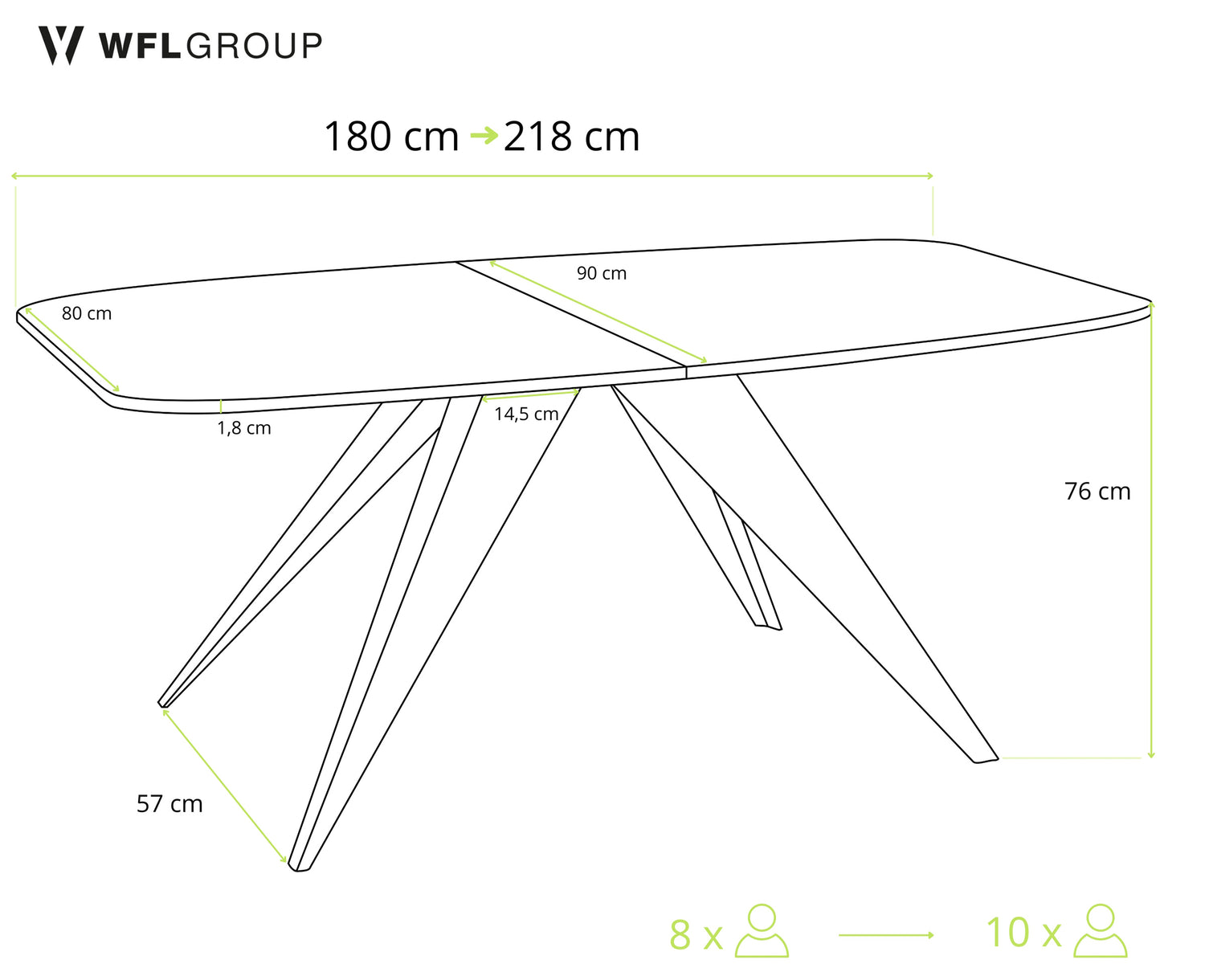 •Breite: 180 cm, Länge: 90 cm, Höhe: 76 cm (erweiterbar auf 220 cm)