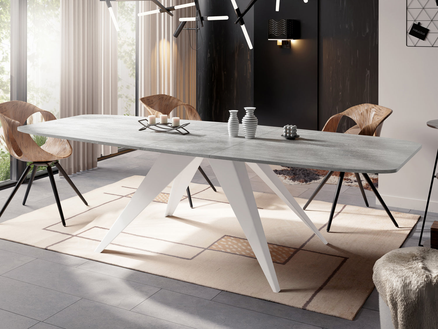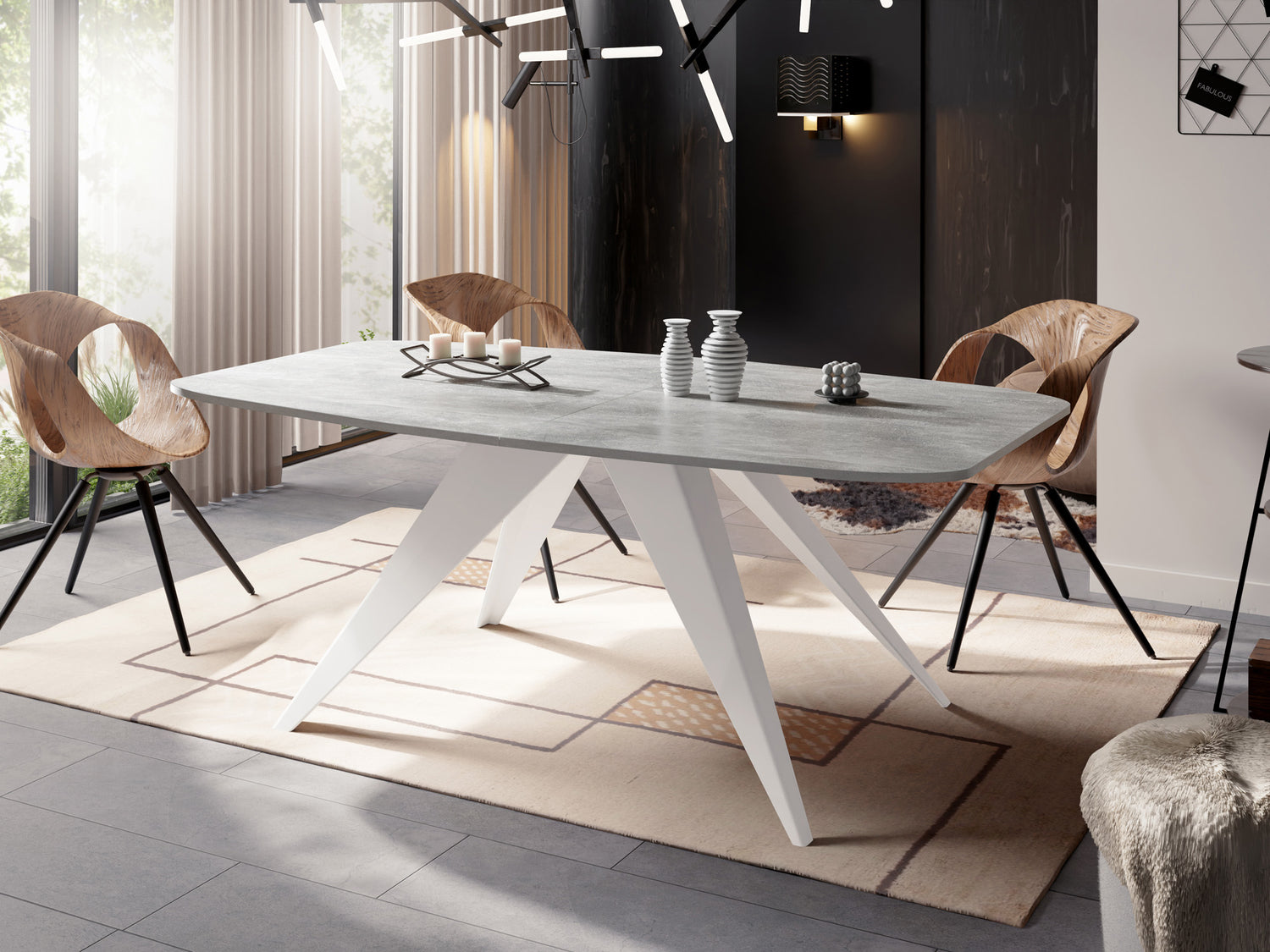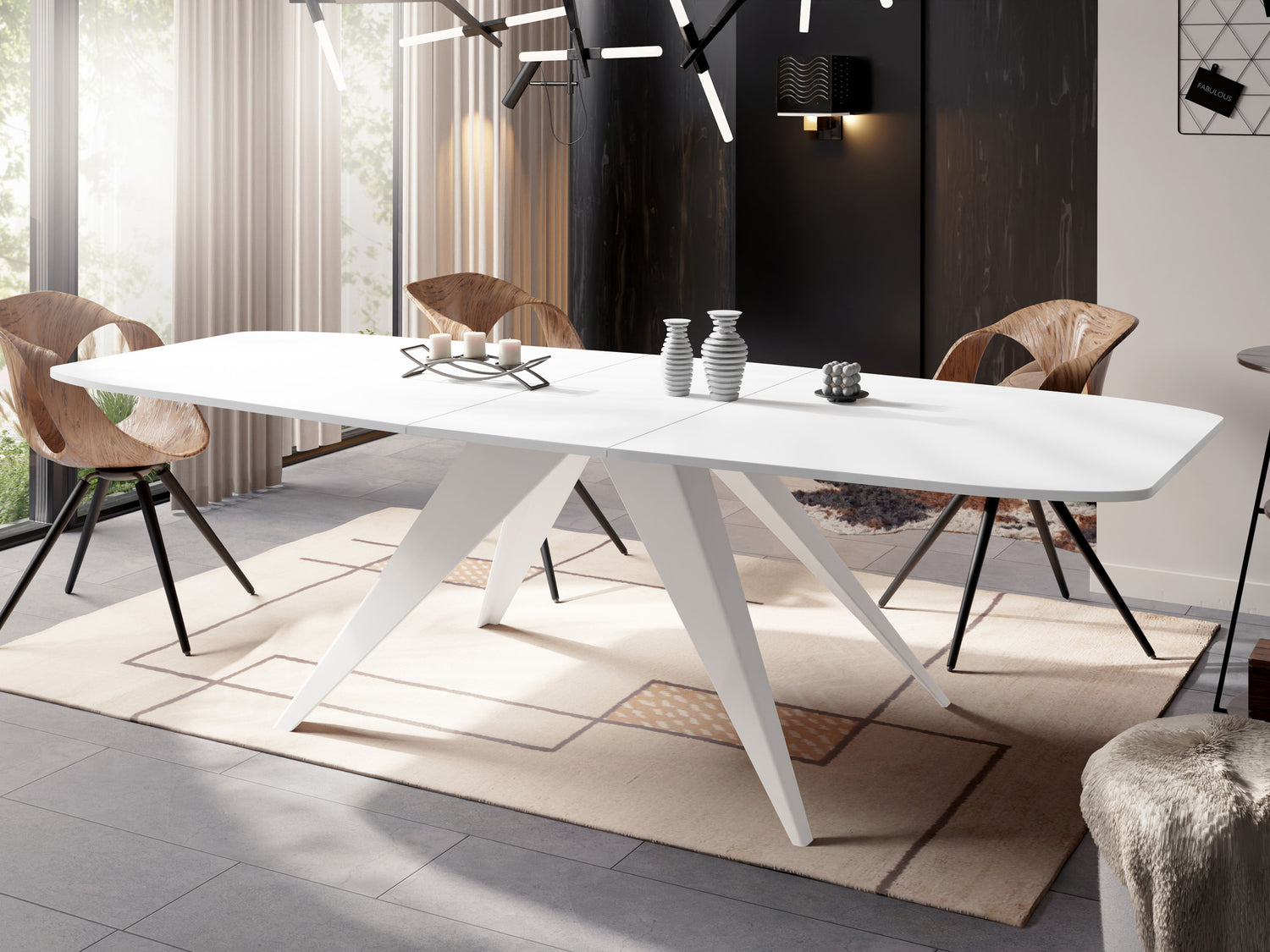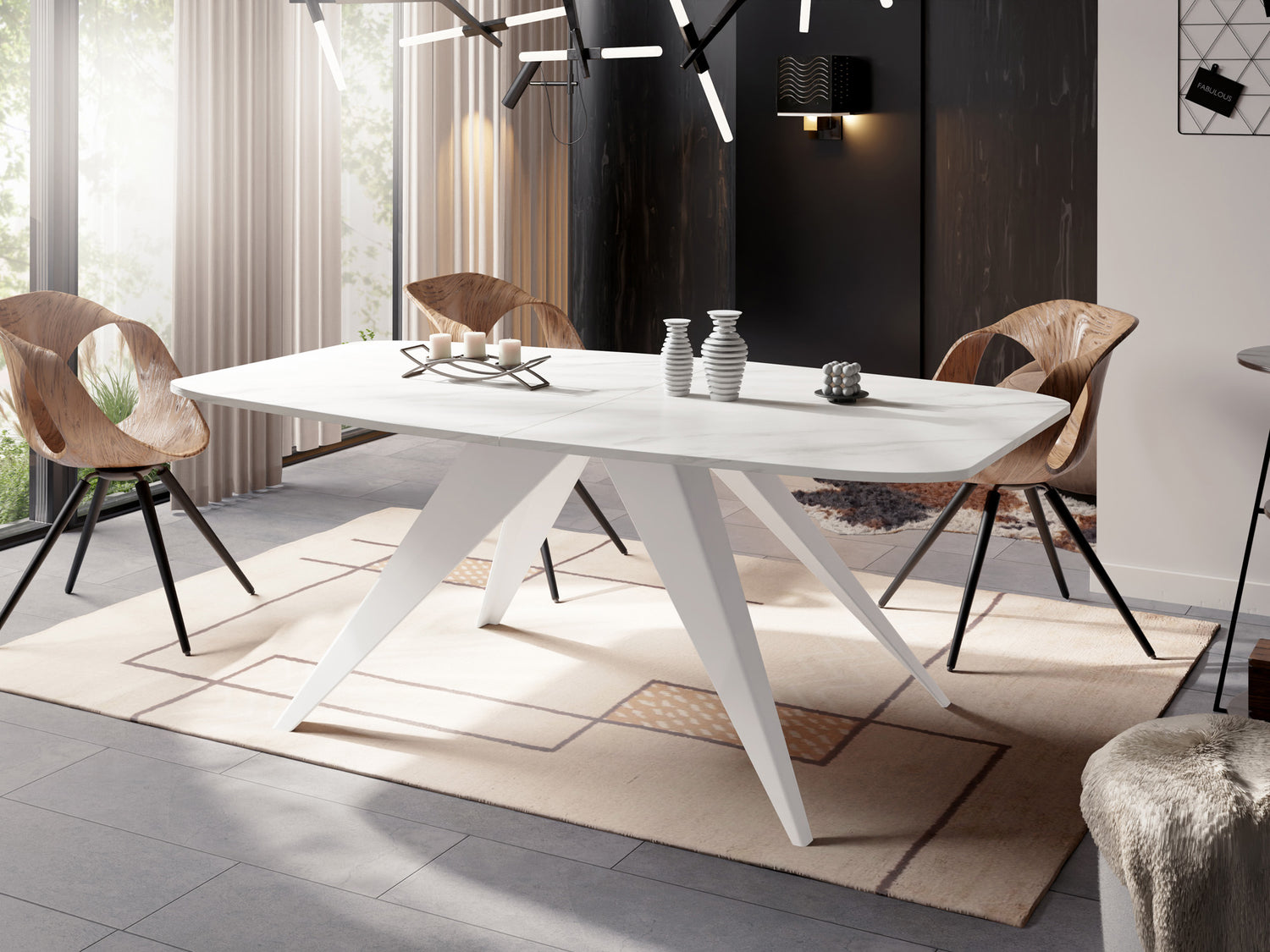 Eleganz und Funktionalität in einem Der Fatina Esstisch kombiniert modernes Design mit praktischer Erweiterbarkeit. Die rechteckige Tischplatte und das markante, geometrische Gestell in stilvollem Weiß verleihen ihm einen einzigartigen, zeitgemäßen Look, der sich perfekt in moderne Wohnräume einfügt.