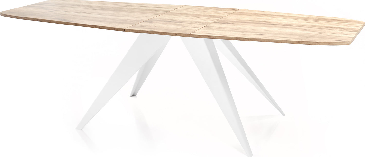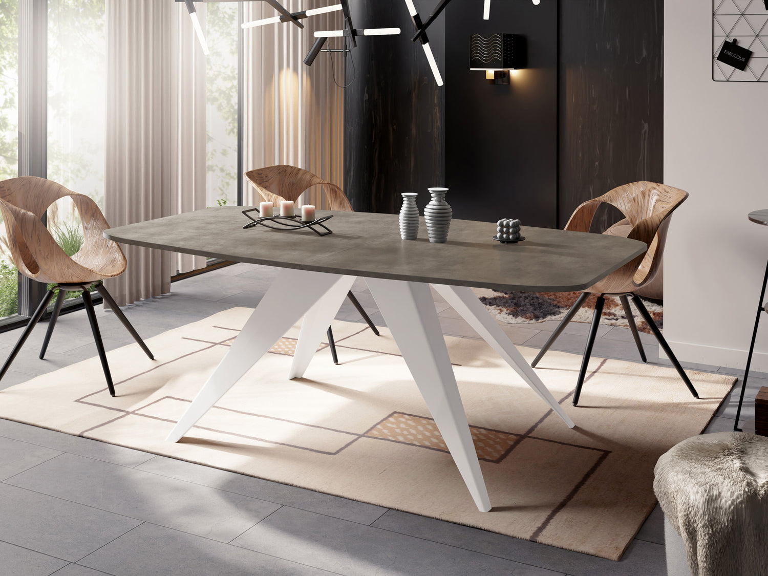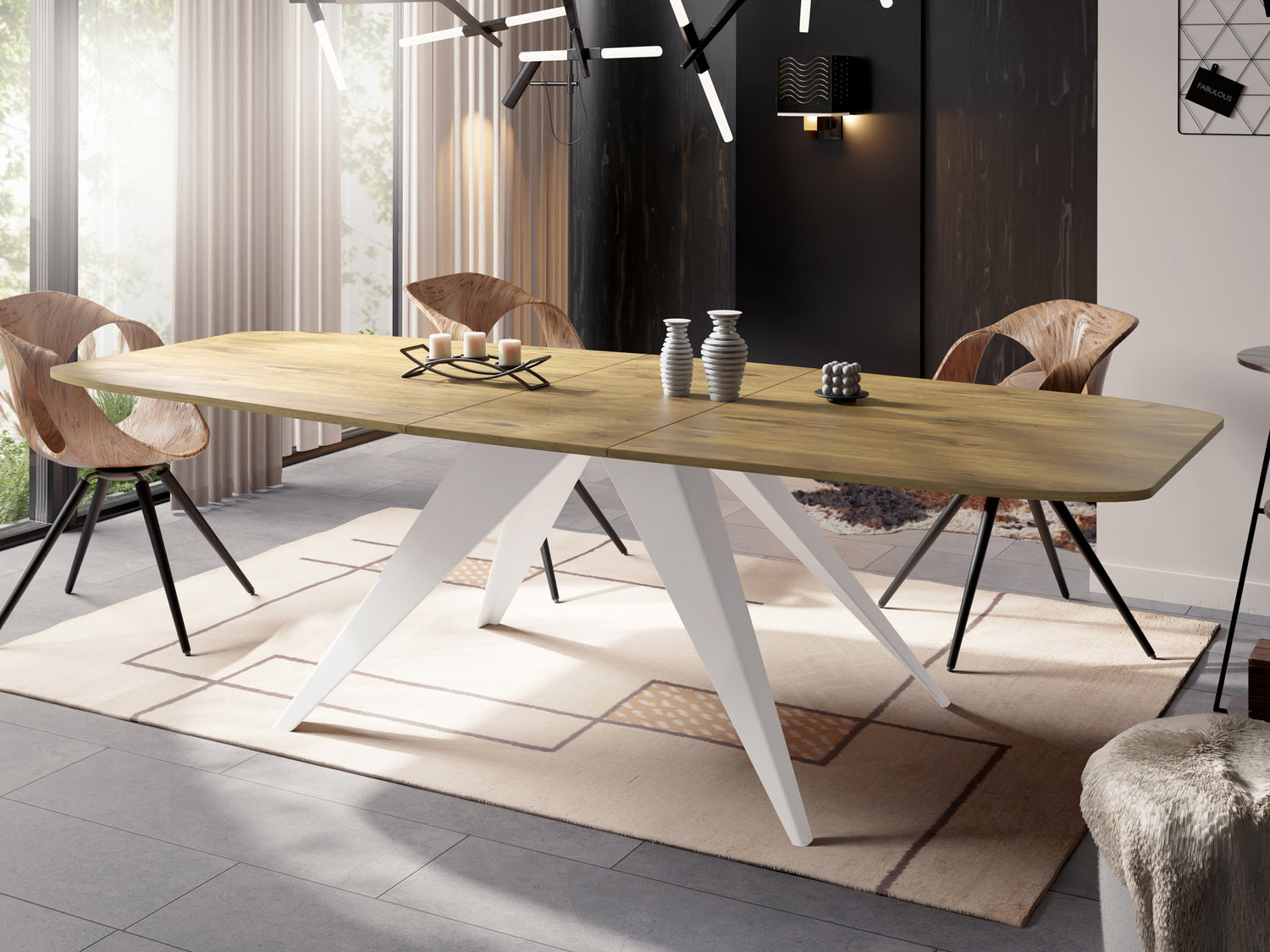 Eleganz und Funktionalität in einem Der Fatina Esstisch kombiniert modernes Design mit praktischer Erweiterbarkeit. Die rechteckige Tischplatte und das markante, geometrische Gestell in stilvollem Weiß verleihen ihm einen einzigartigen, zeitgemäßen Look, der sich perfekt in moderne Wohnräume einfügt.