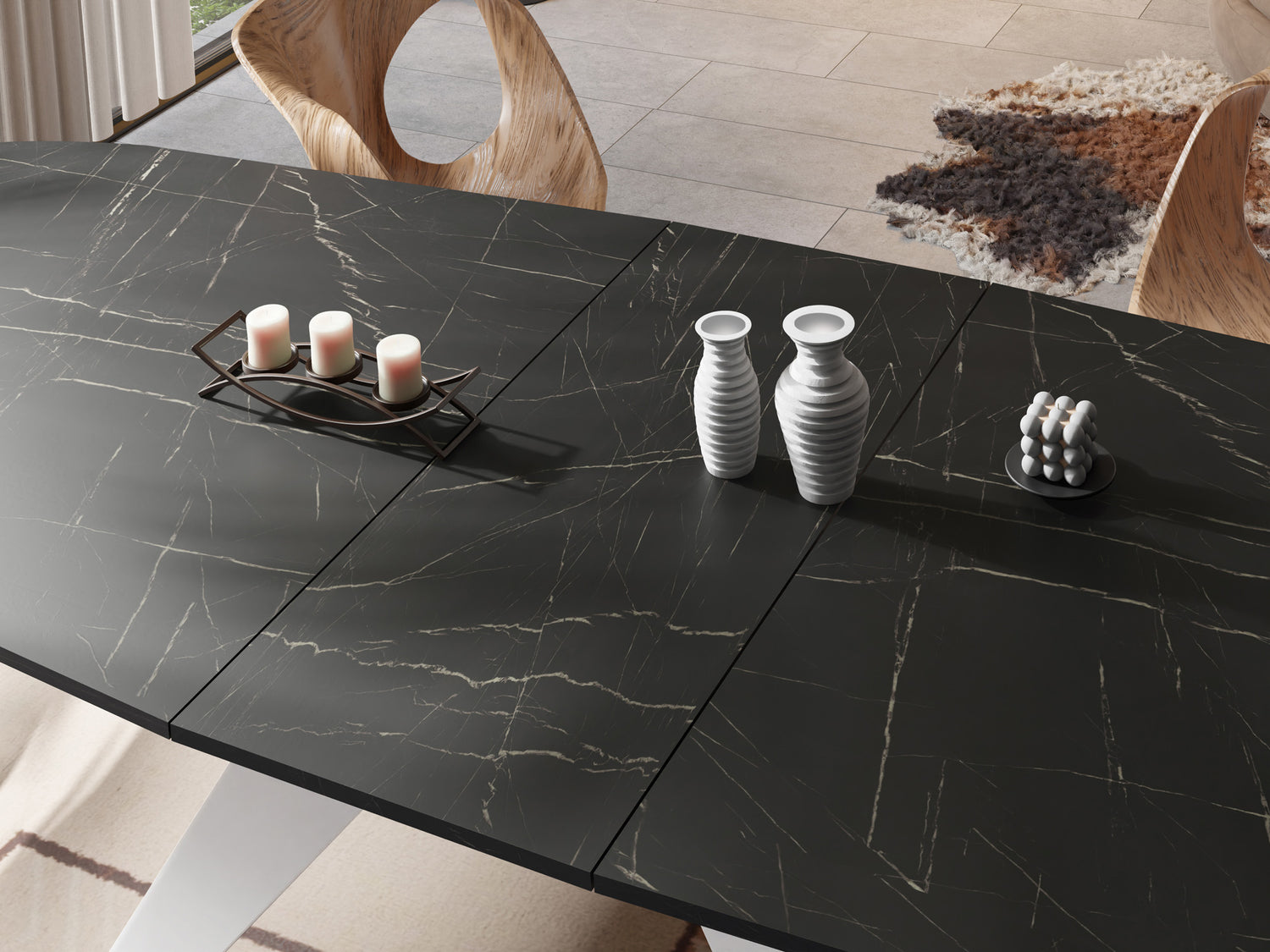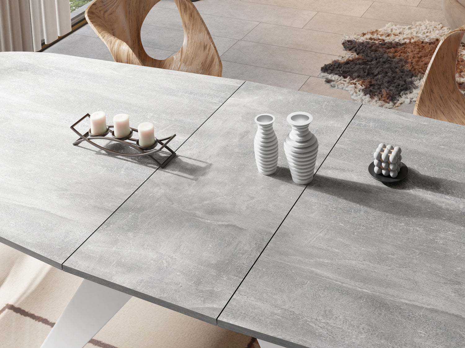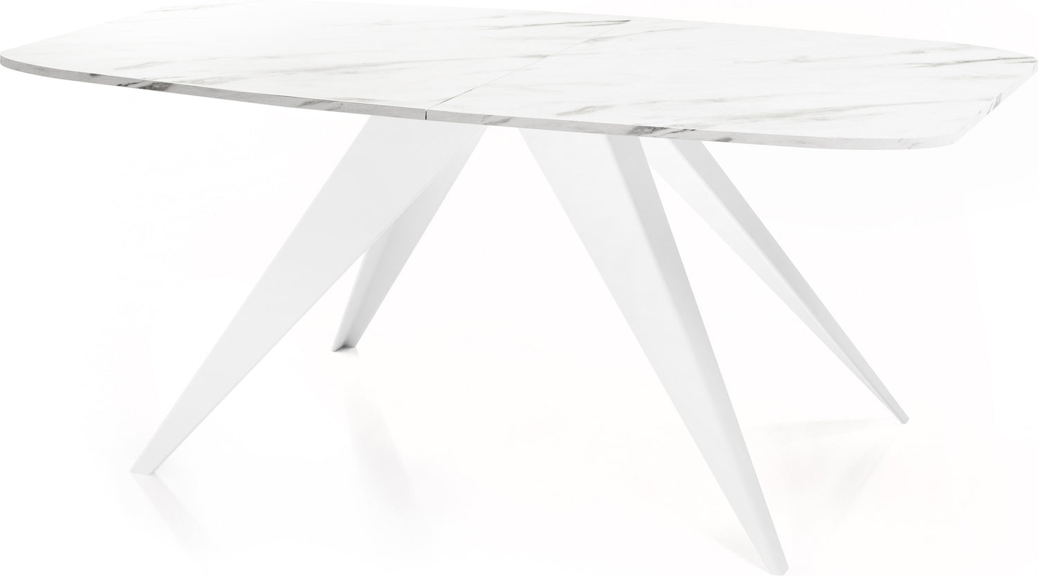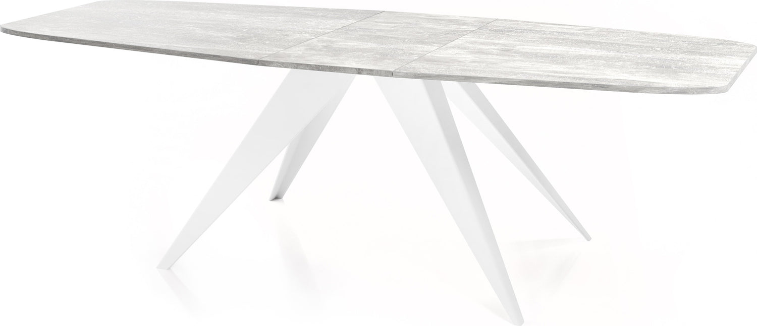 Eleganz und Funktionalität in einem Der Fatina Esstisch kombiniert modernes Design mit praktischer Erweiterbarkeit. Die rechteckige Tischplatte und das markante, geometrische Gestell in stilvollem Weiß verleihen ihm einen einzigartigen, zeitgemäßen Look, der sich perfekt in moderne Wohnräume einfügt.