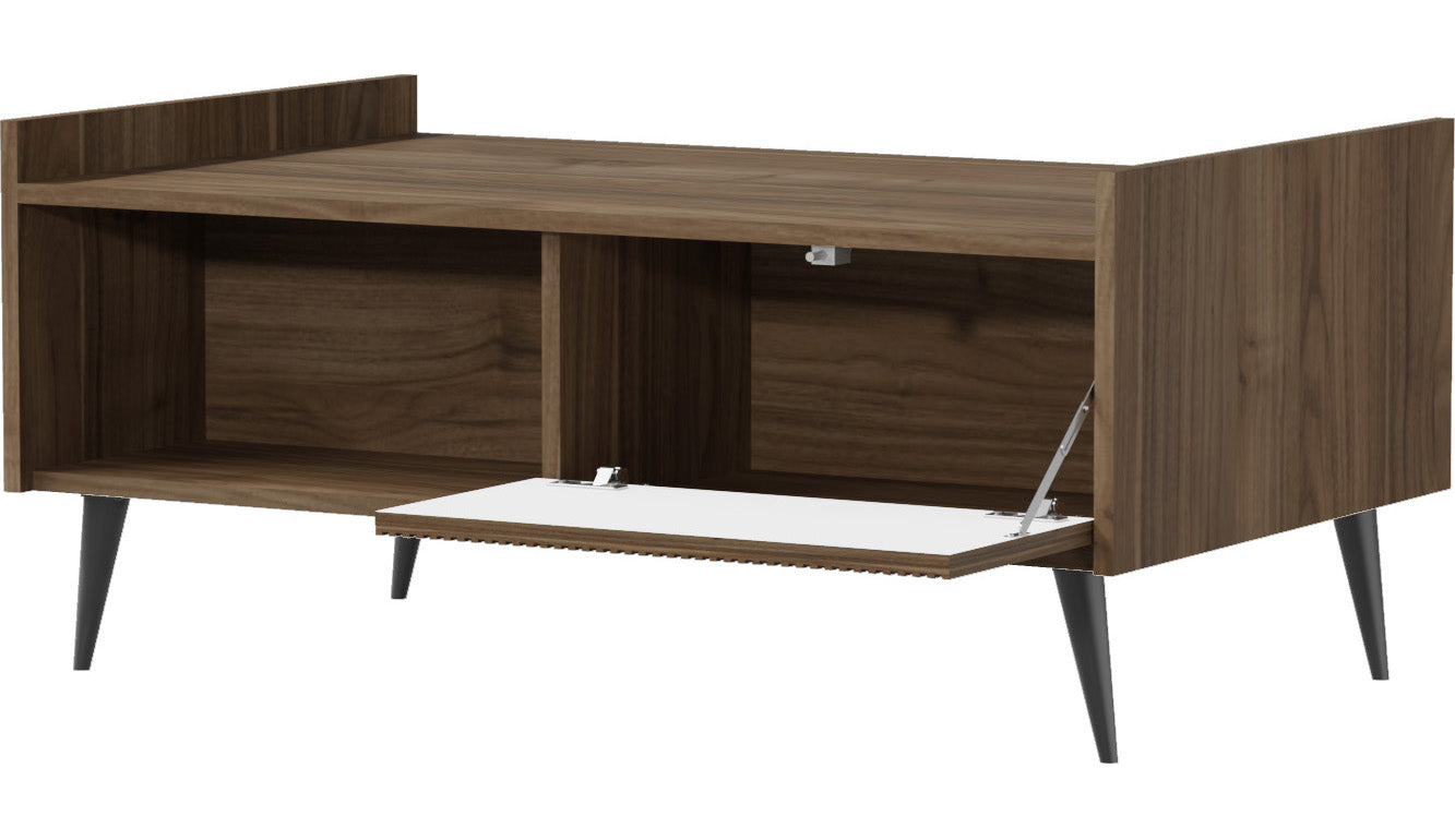 Rillen-Details, klare Linien und 15 cm hohe Metallfüße verleihen dem Couchtisch eine moderne Industrial-Skandi-Optik. Zwei Trendfarben – warmes Walnuss-Braun und sanftes Beige-Cashmere – fügen sich harmonisch in minimalistische und skandinavische Wohnbereiche ein.