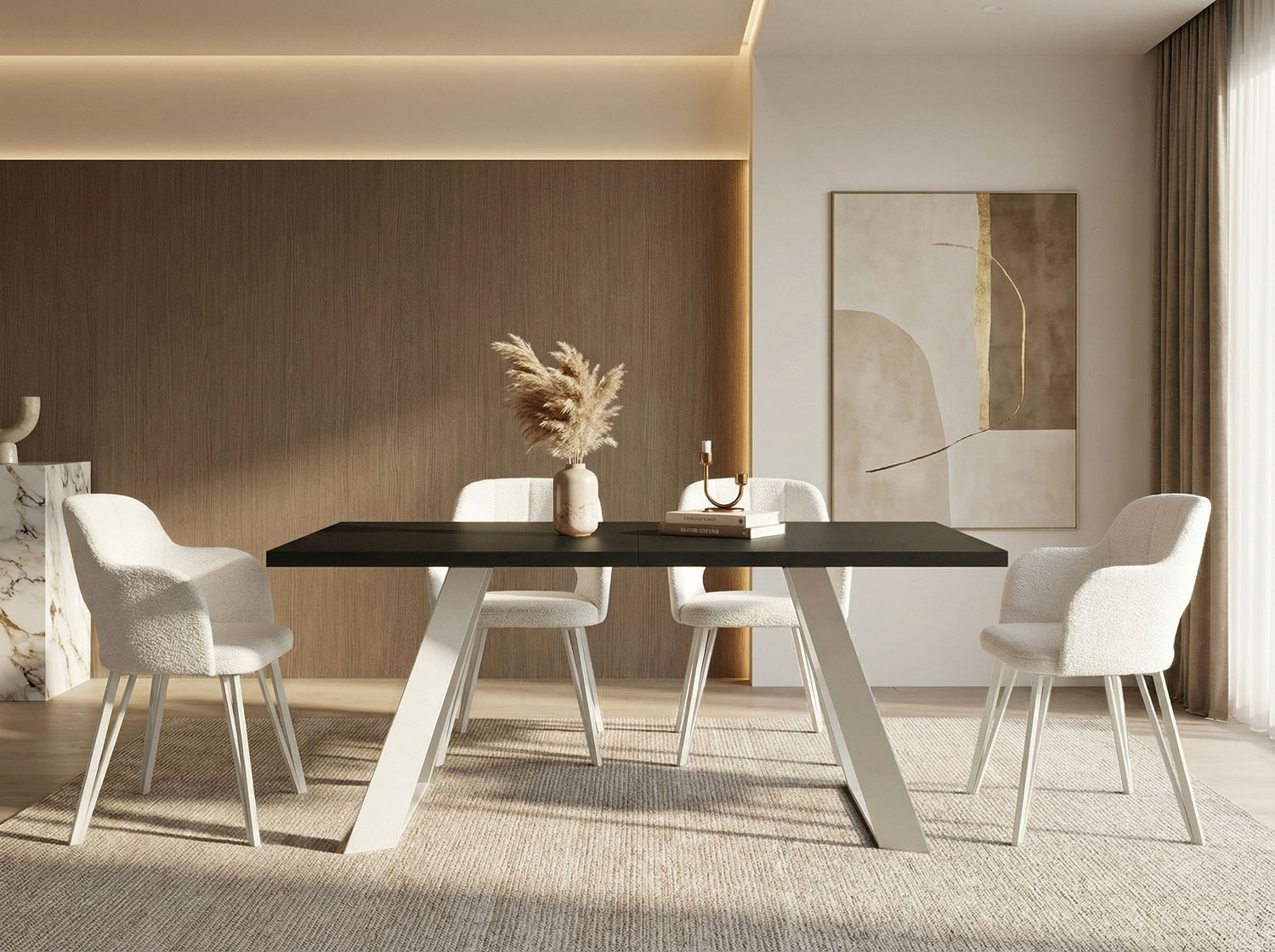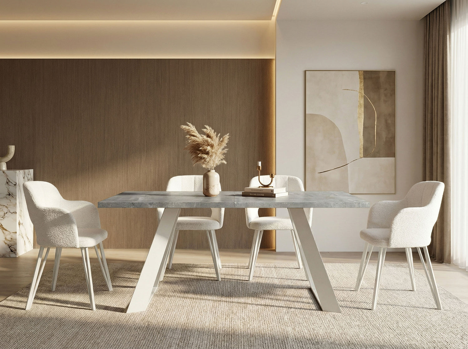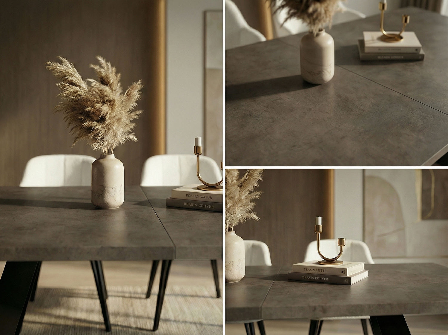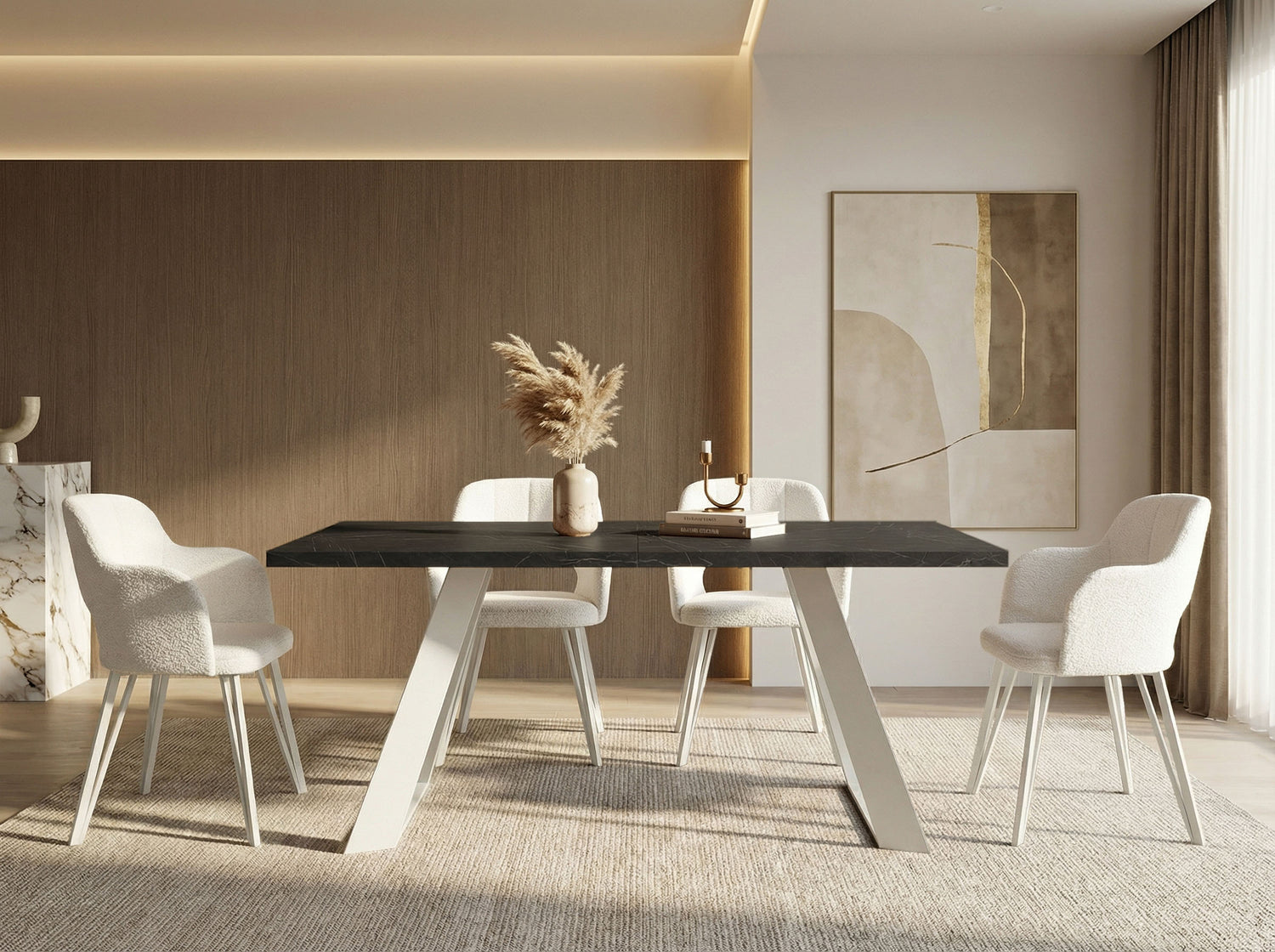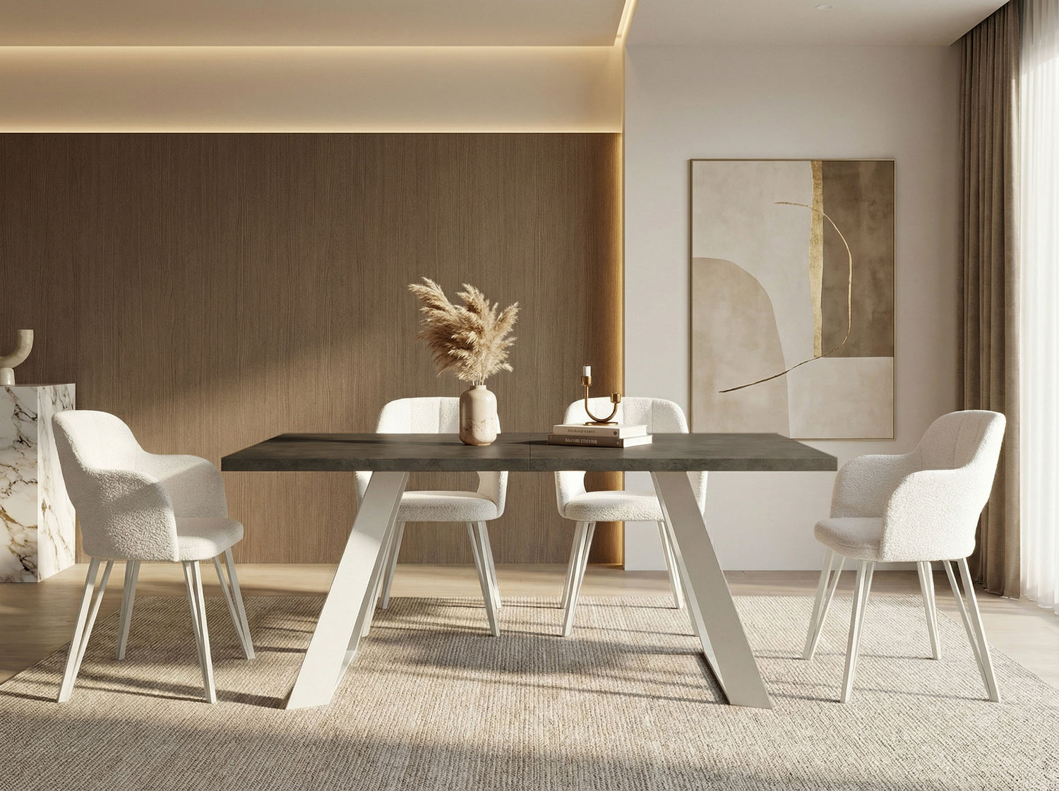 VIELFÄLTIGE OBERFLÄCHEN – Wählen Sie aus verschiedenen Tischplattenoptionen, darunter Holzdekore, Marmoroptik oder Beton. Jede Oberfläche ist strapazierfähig und verleiht Ihrem Esszimmer Eleganz