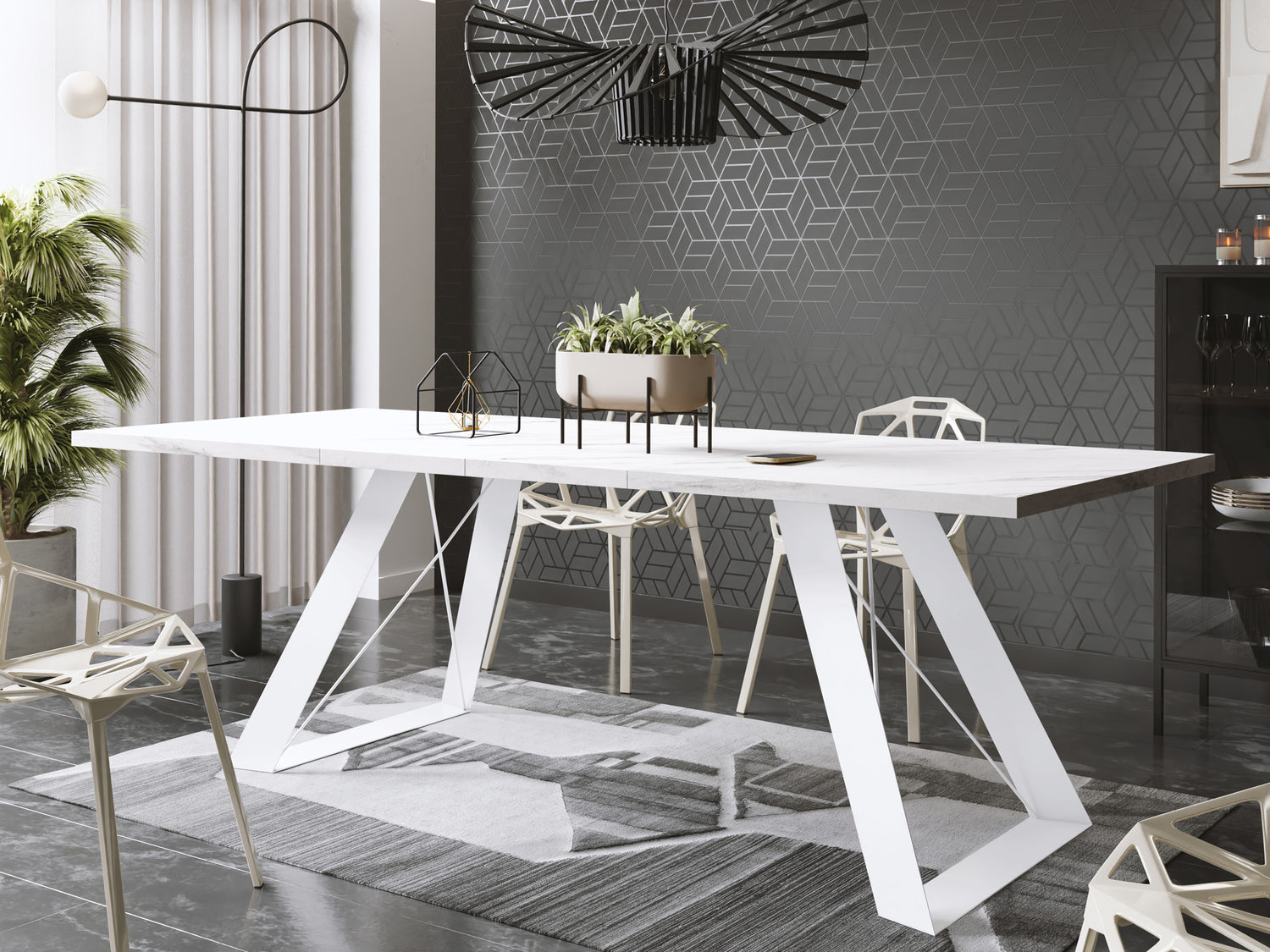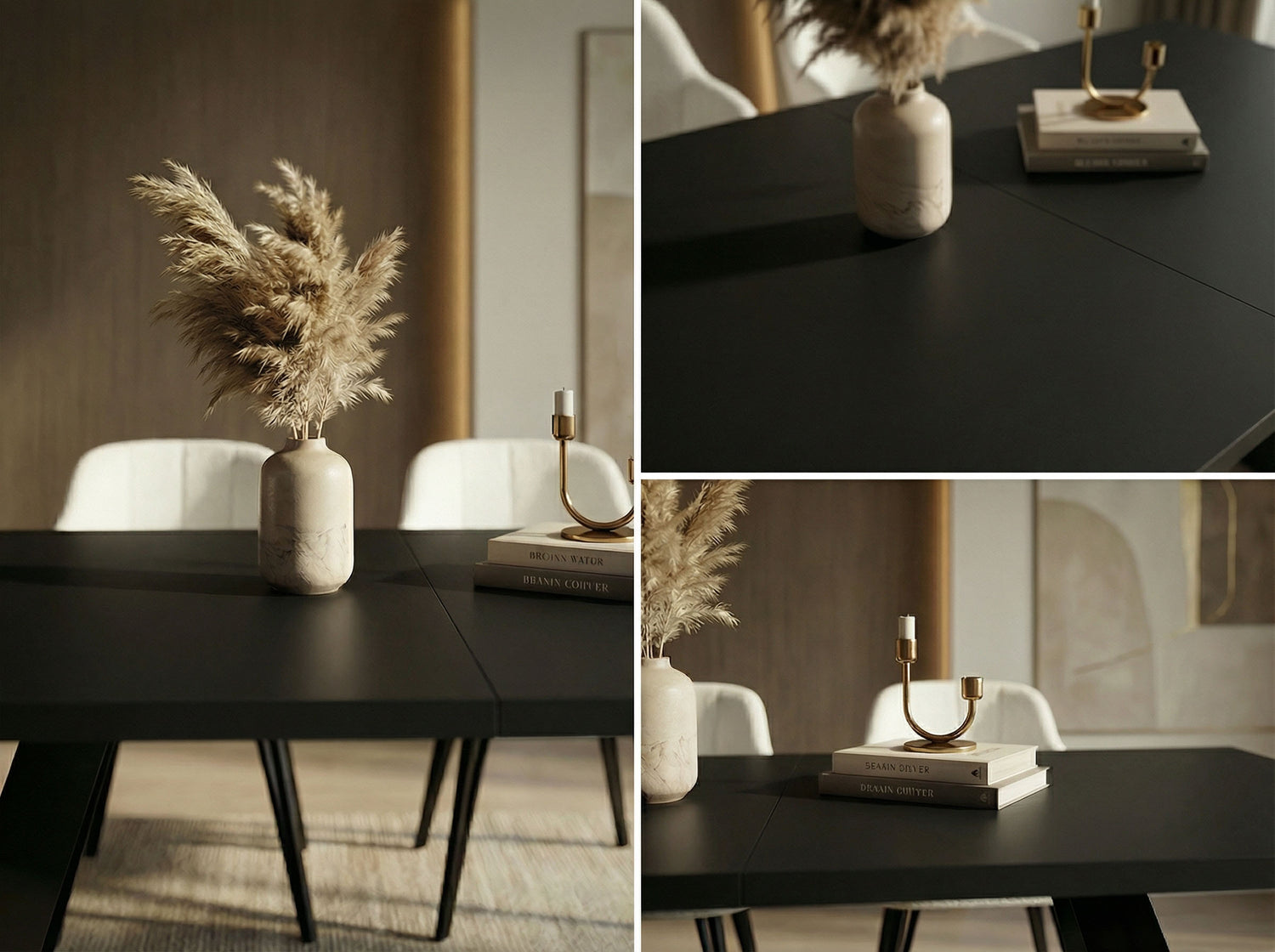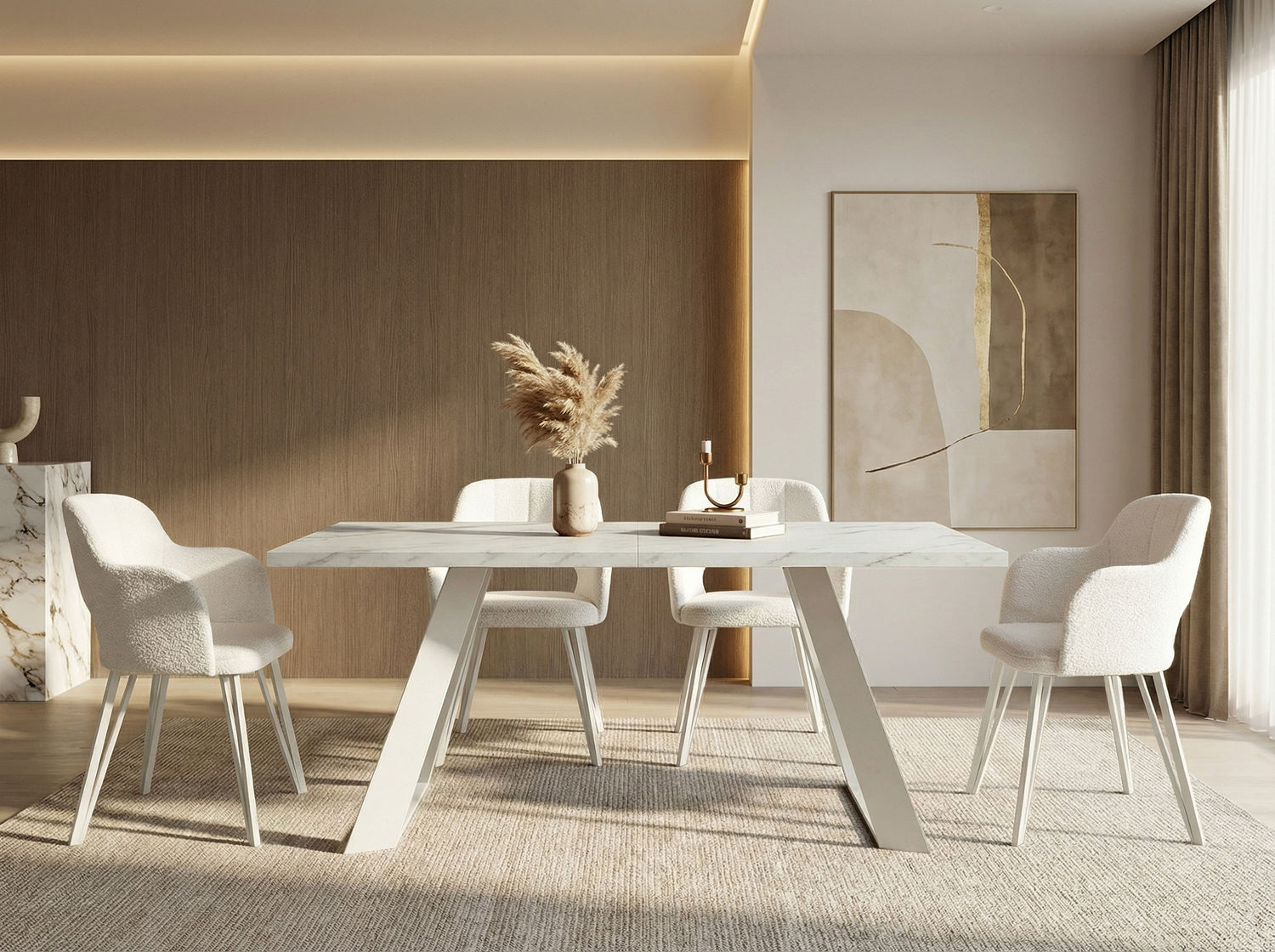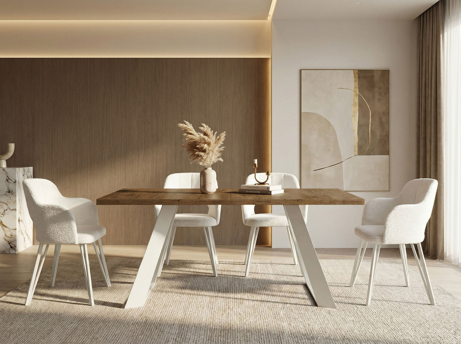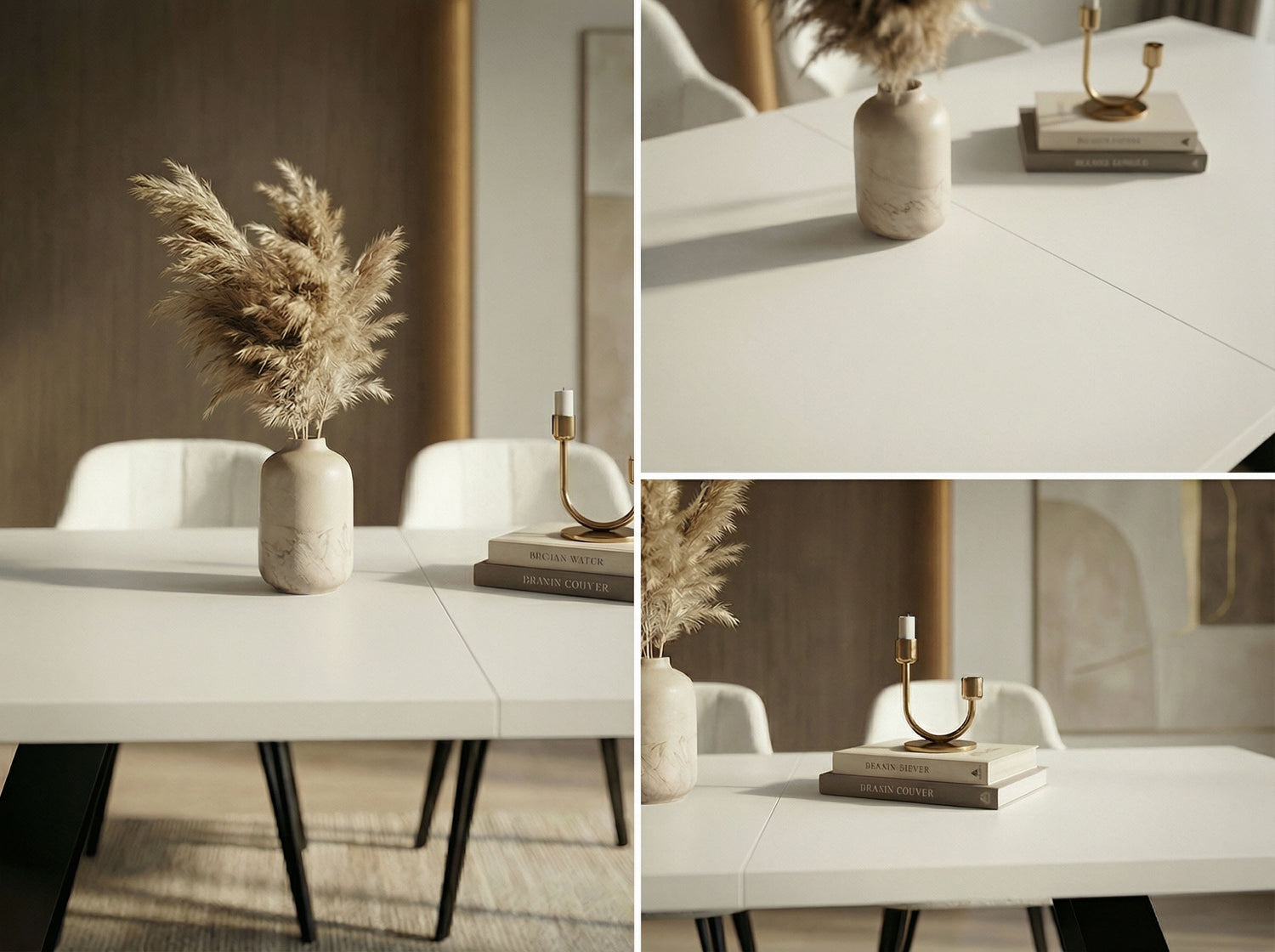VIELFÄLTIGE OBERFLÄCHEN – Wählen Sie aus verschiedenen Tischplattenoptionen, darunter Holzdekore, Marmoroptik oder Beton. Jede Oberfläche ist strapazierfähig und verleiht Ihrem Esszimmer Eleganz