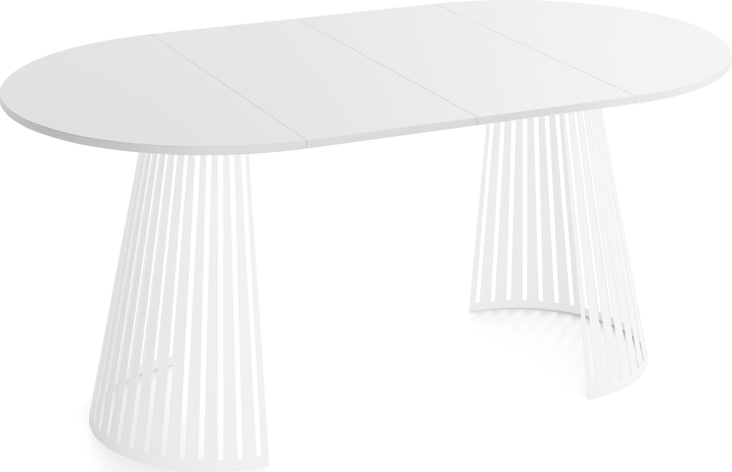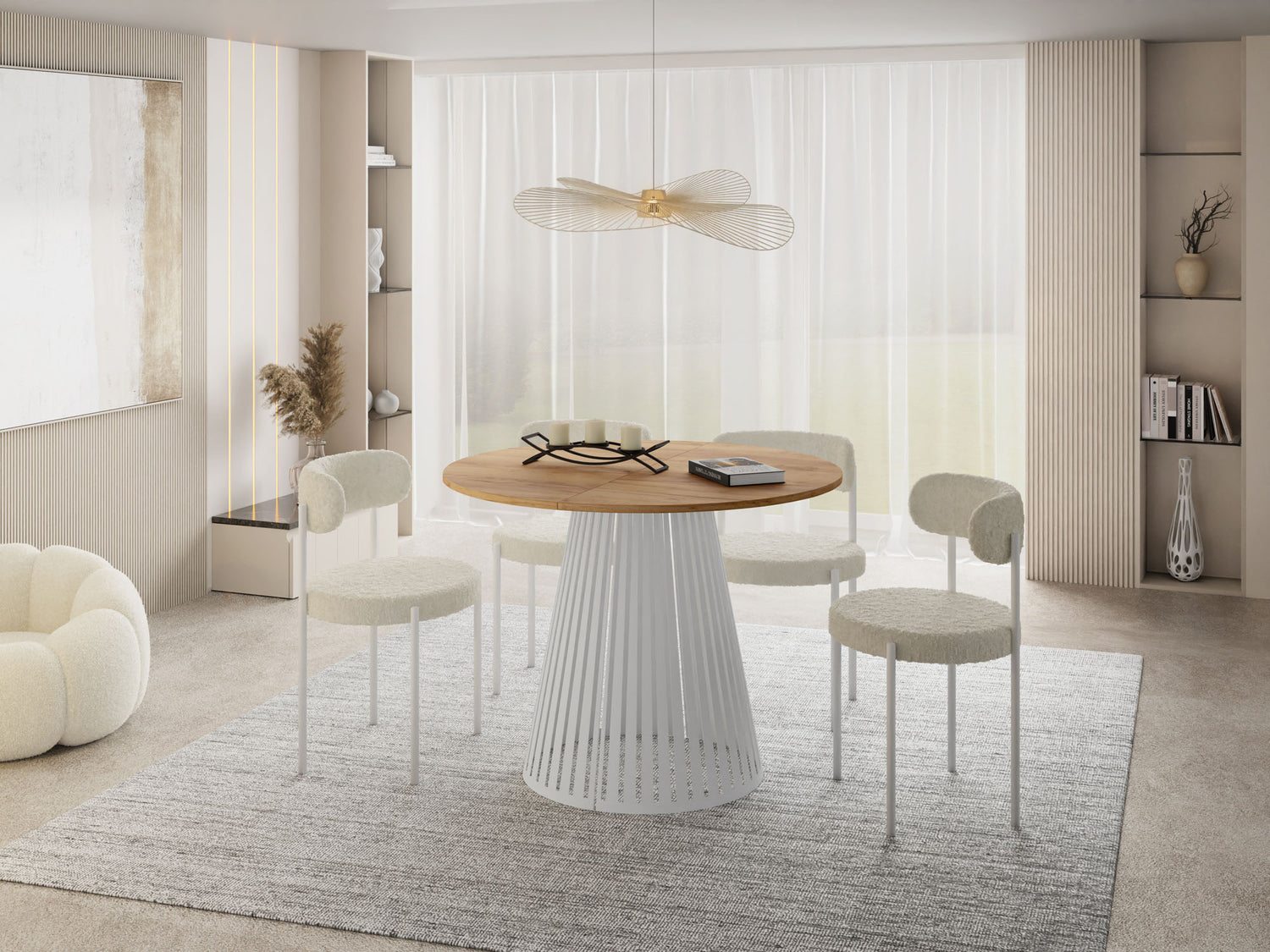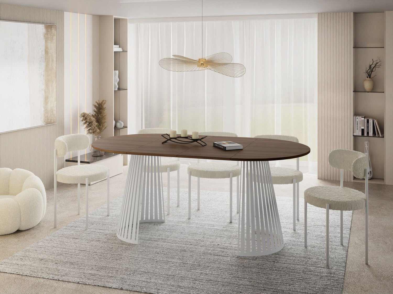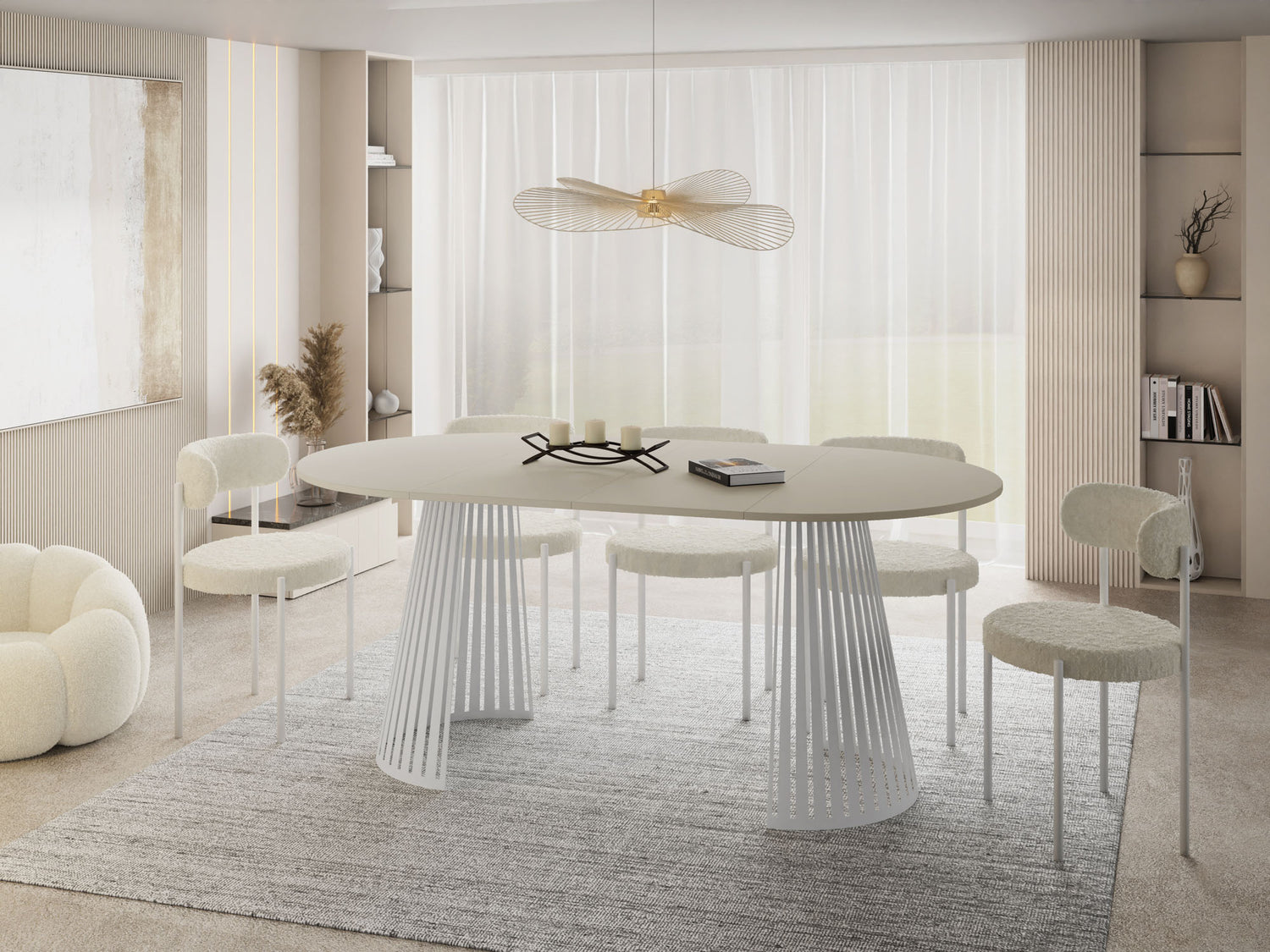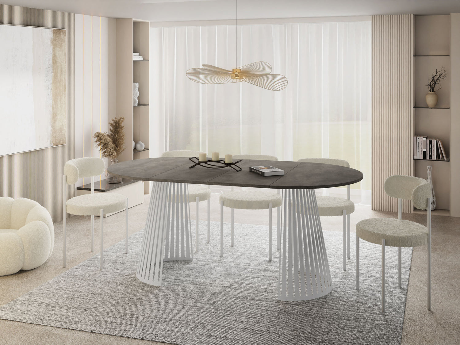 Der Esstisch Naro kombiniert zeitgemäßes Design mit praktischer Erweiterbarkeit. Die runde Tischplatte lässt sich im Handumdrehen zu einer großzügigen ovalen Tafel ausziehen – perfekt für gesellige Abende. Das auffällige, skulpturale Gestell aus weißen Metallstreben verleiht dem Tisch eine moderne, architektonische Note und sorgt gleichzeitig für Stabilität und Beinfreiheit.