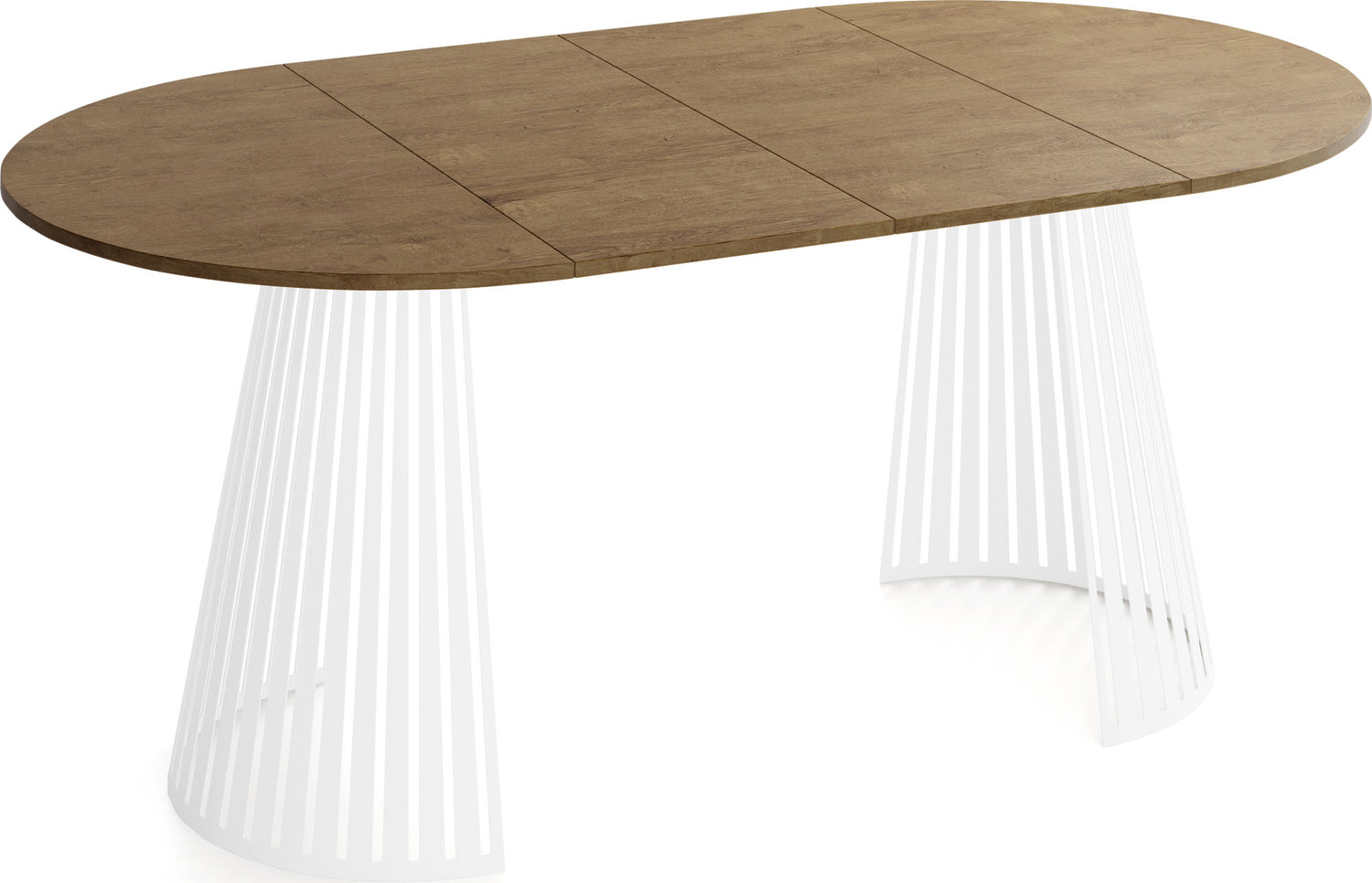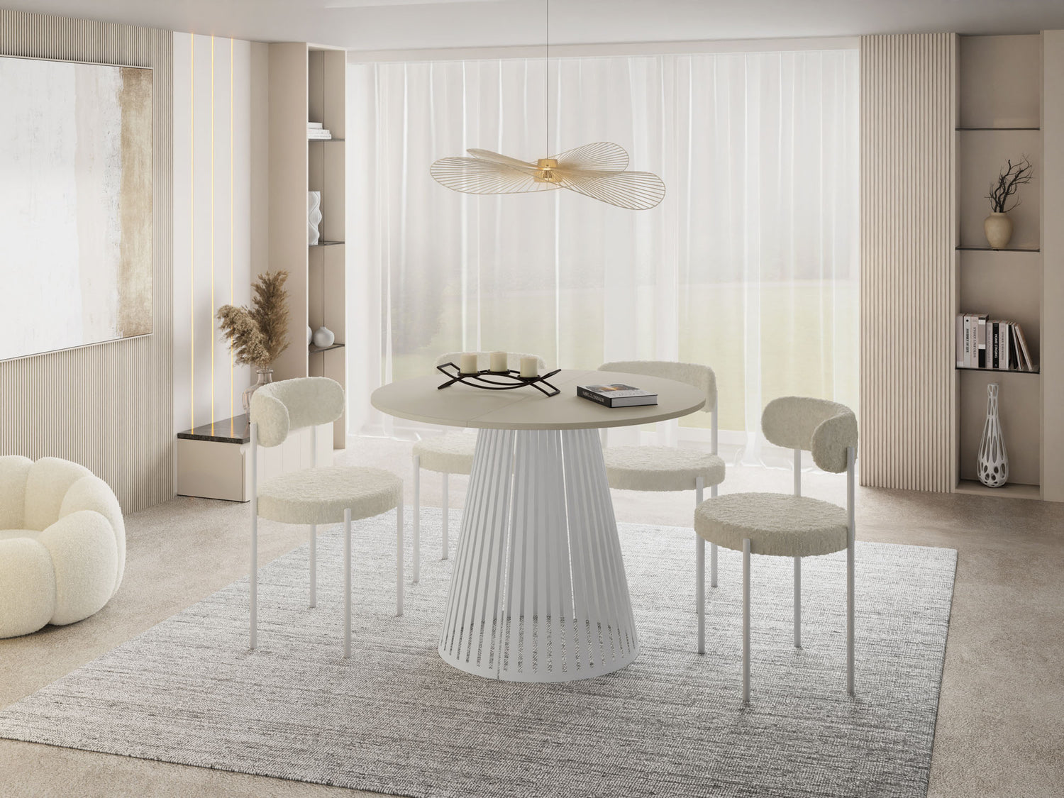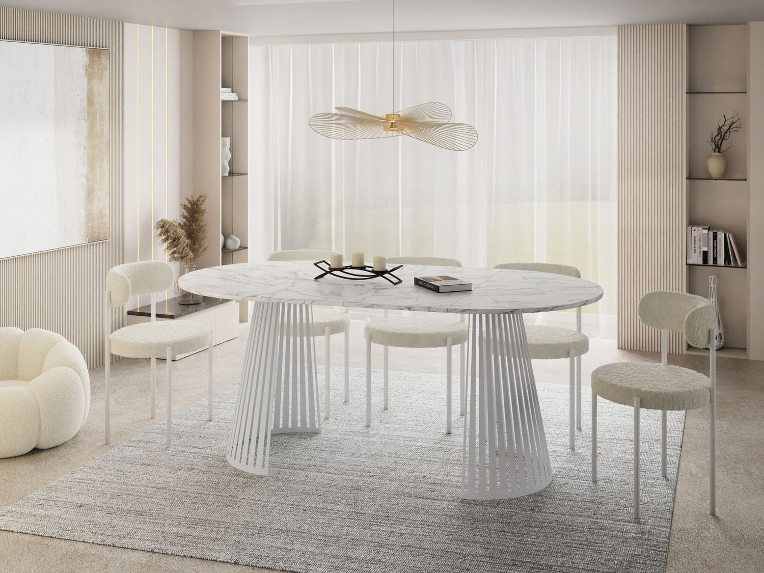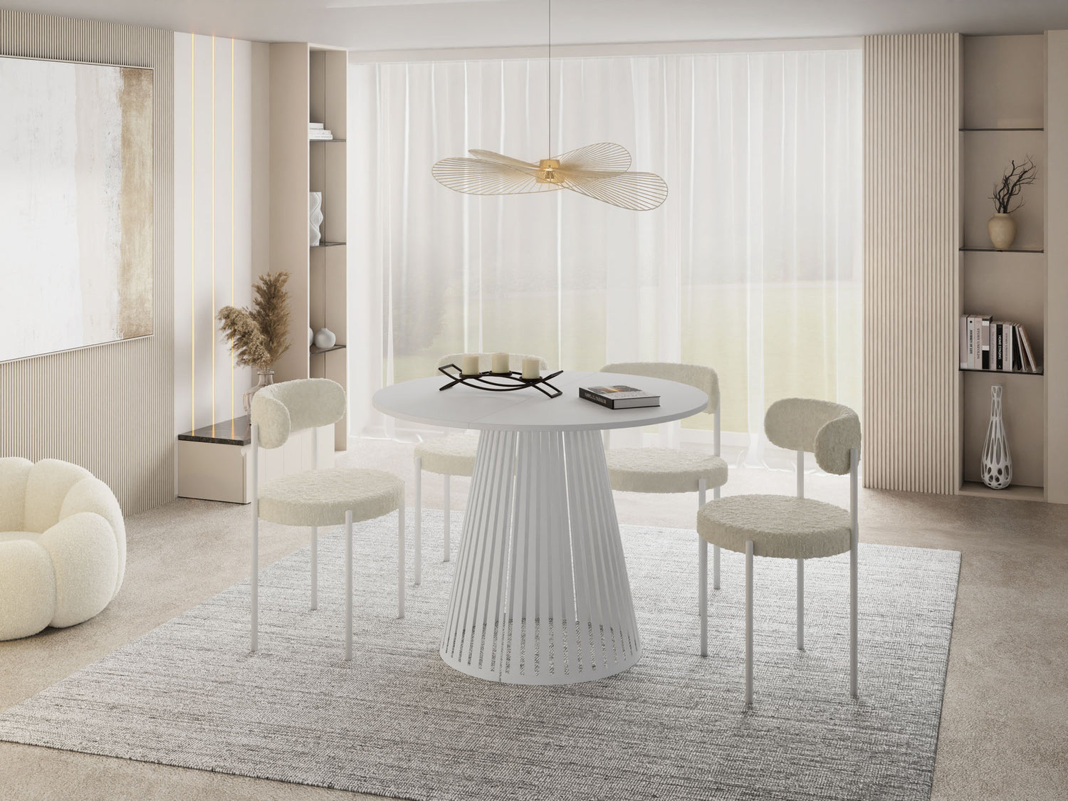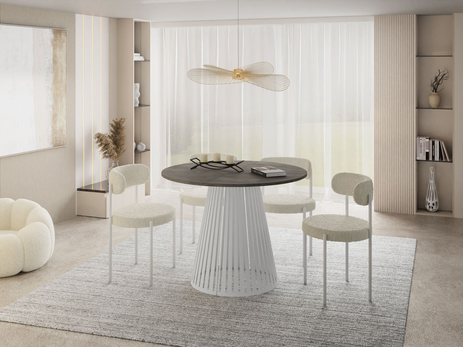 Der Esstisch Naro kombiniert zeitgemäßes Design mit praktischer Erweiterbarkeit. Die runde Tischplatte lässt sich im Handumdrehen zu einer großzügigen ovalen Tafel ausziehen – perfekt für gesellige Abende. Das auffällige, skulpturale Gestell aus weißen Metallstreben verleiht dem Tisch eine moderne, architektonische Note und sorgt gleichzeitig für Stabilität und Beinfreiheit.