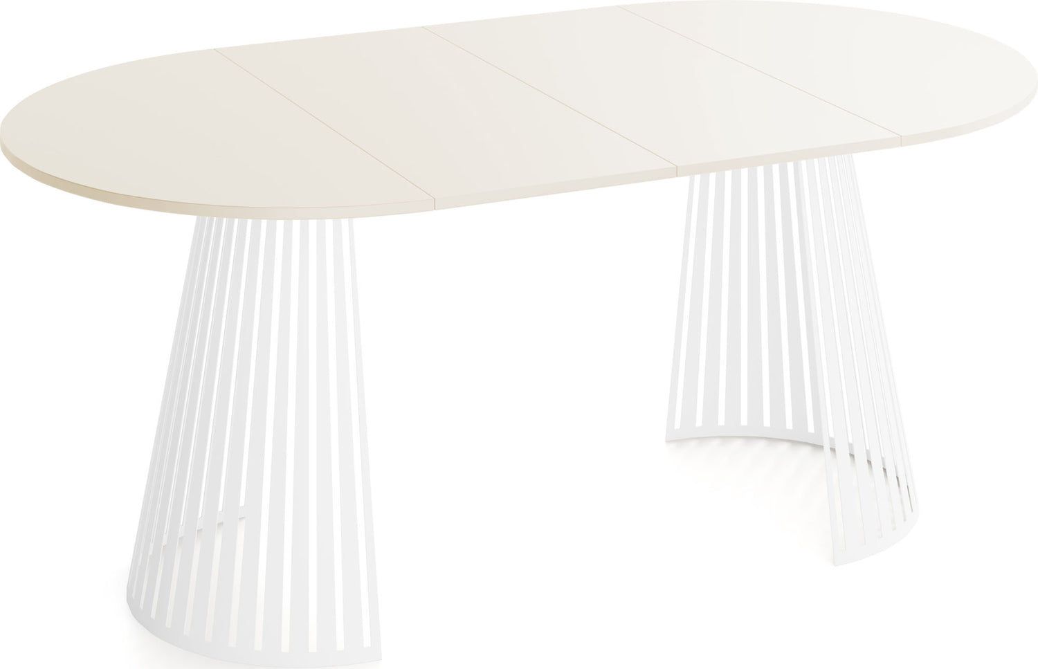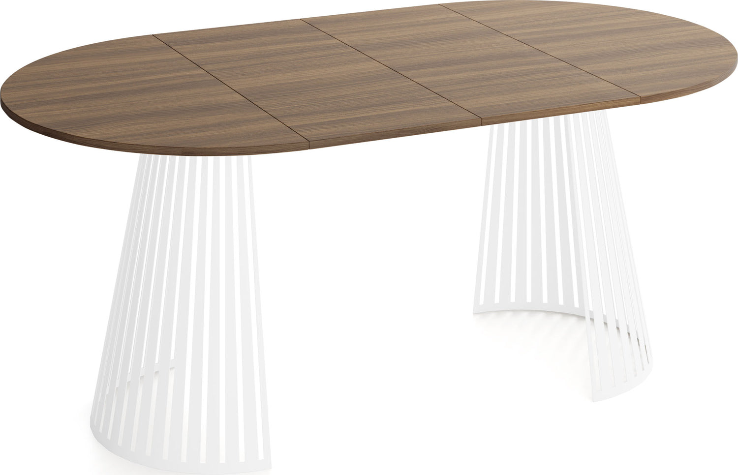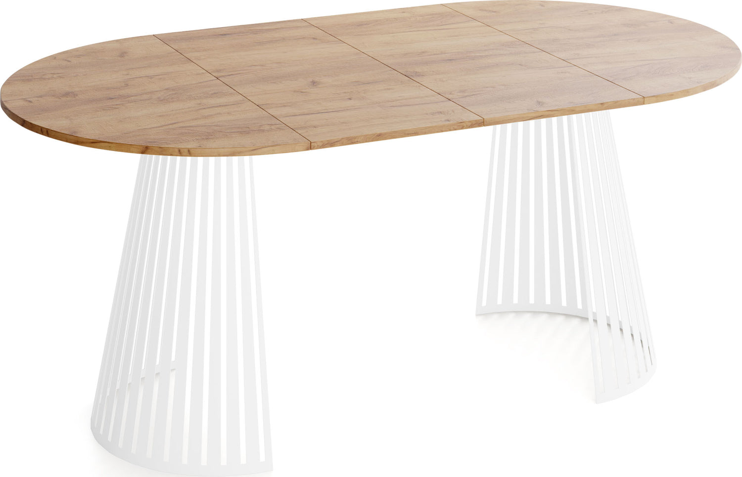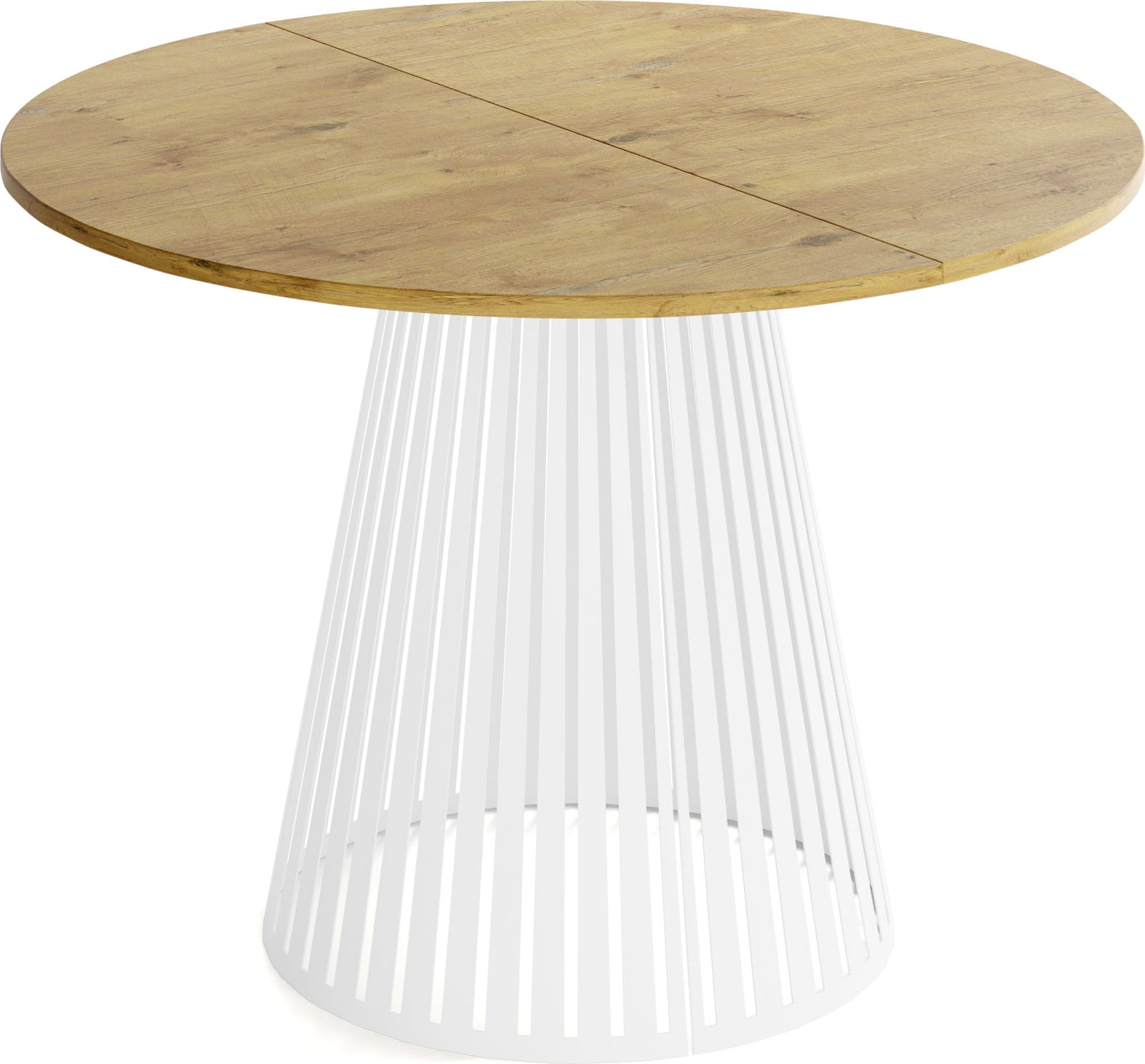 Der Esstisch Naro kombiniert zeitgemäßes Design mit praktischer Erweiterbarkeit. Die runde Tischplatte lässt sich im Handumdrehen zu einer großzügigen ovalen Tafel ausziehen – perfekt für gesellige Abende. Das auffällige, skulpturale Gestell aus weißen Metallstreben verleiht dem Tisch eine moderne, architektonische Note und sorgt gleichzeitig für Stabilität und Beinfreiheit.