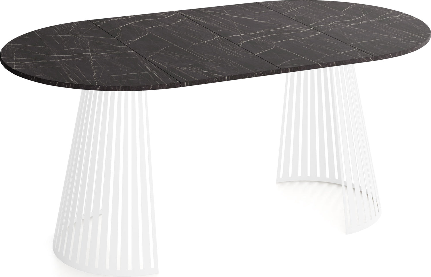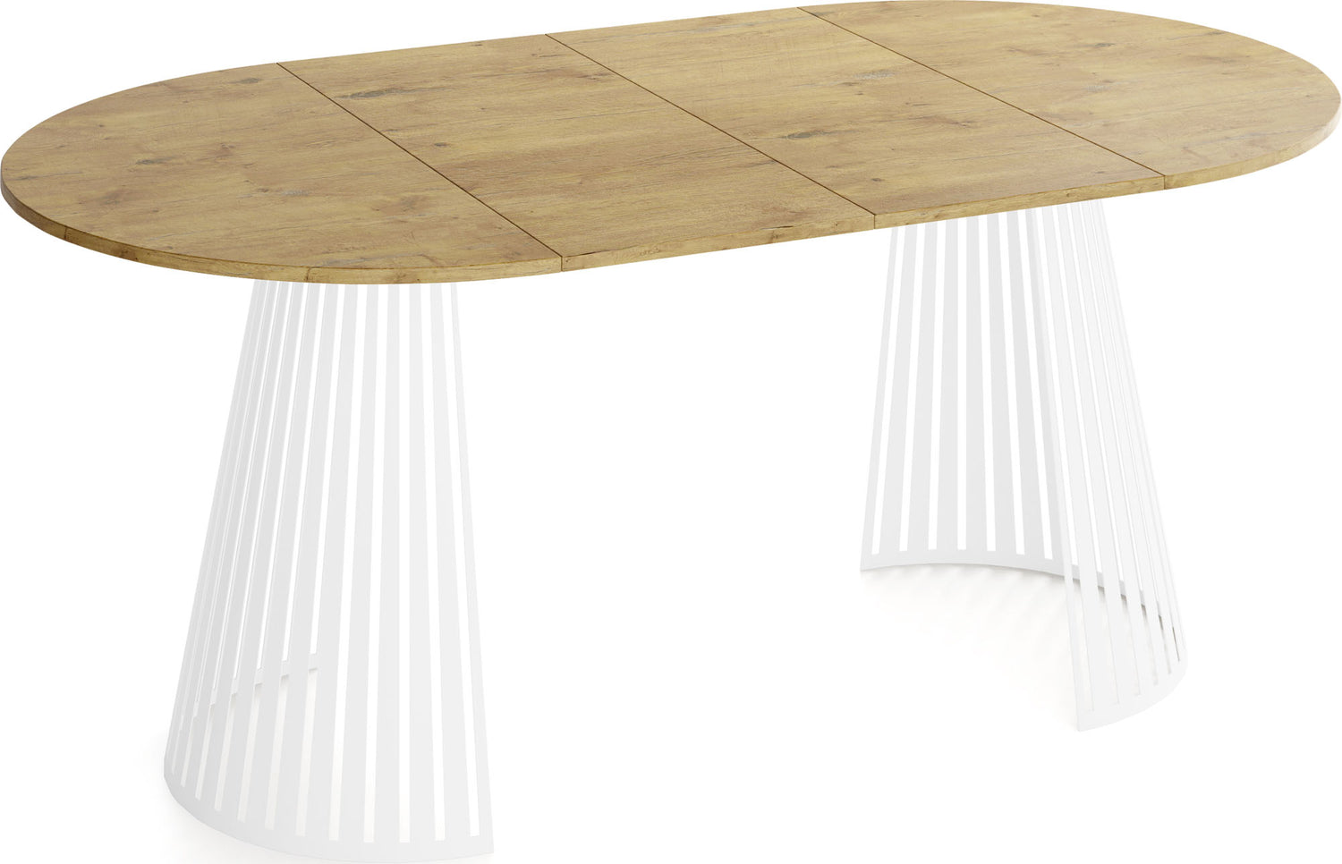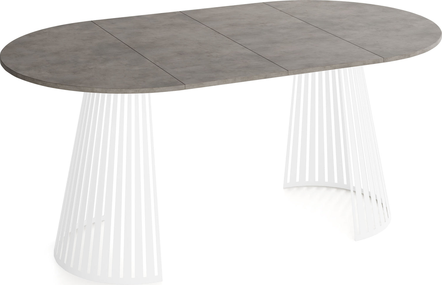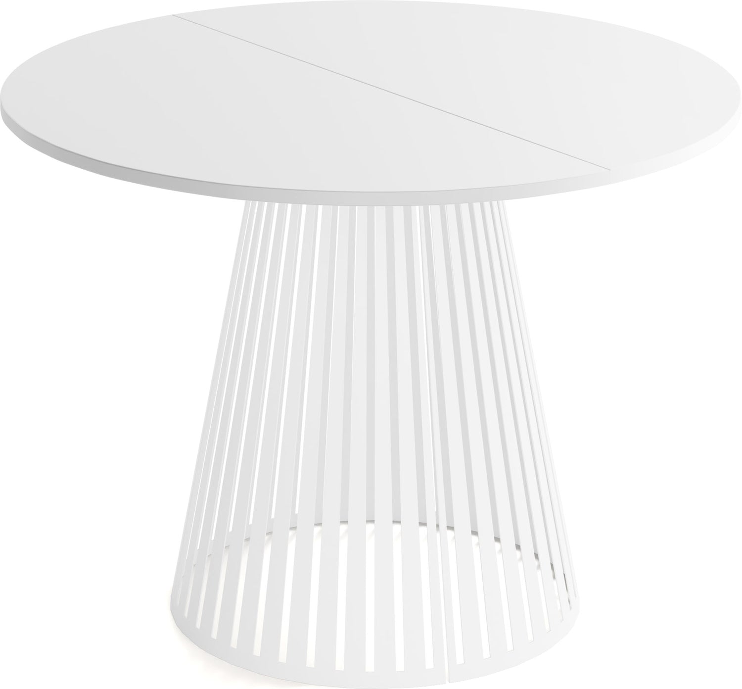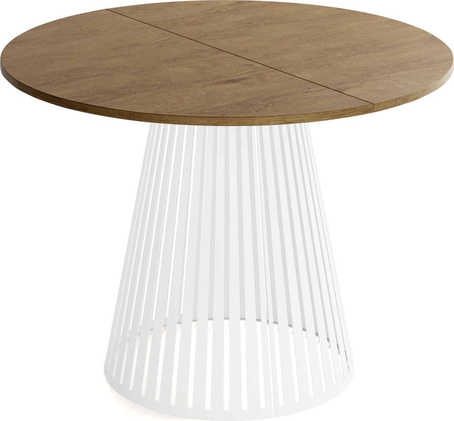 Der Esstisch Naro kombiniert zeitgemäßes Design mit praktischer Erweiterbarkeit. Die runde Tischplatte lässt sich im Handumdrehen zu einer großzügigen ovalen Tafel ausziehen – perfekt für gesellige Abende. Das auffällige, skulpturale Gestell aus weißen Metallstreben verleiht dem Tisch eine moderne, architektonische Note und sorgt gleichzeitig für Stabilität und Beinfreiheit.