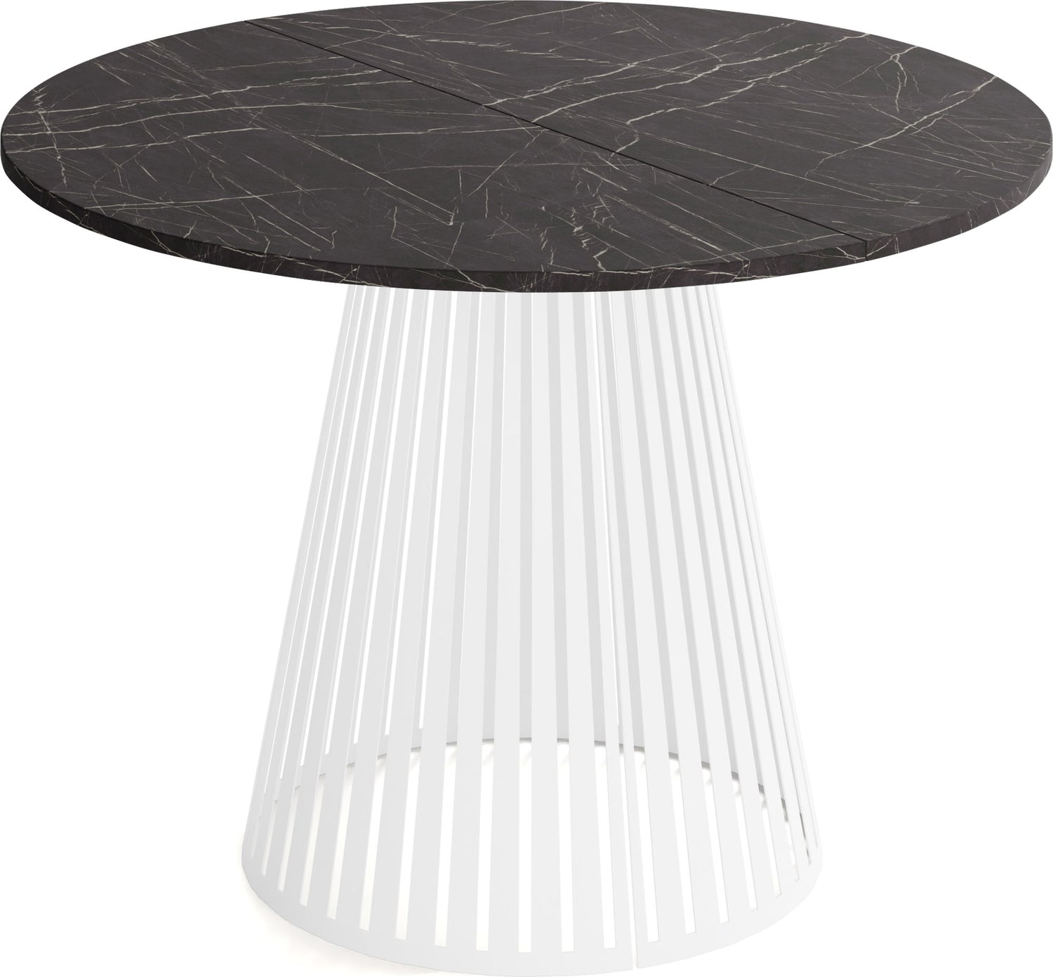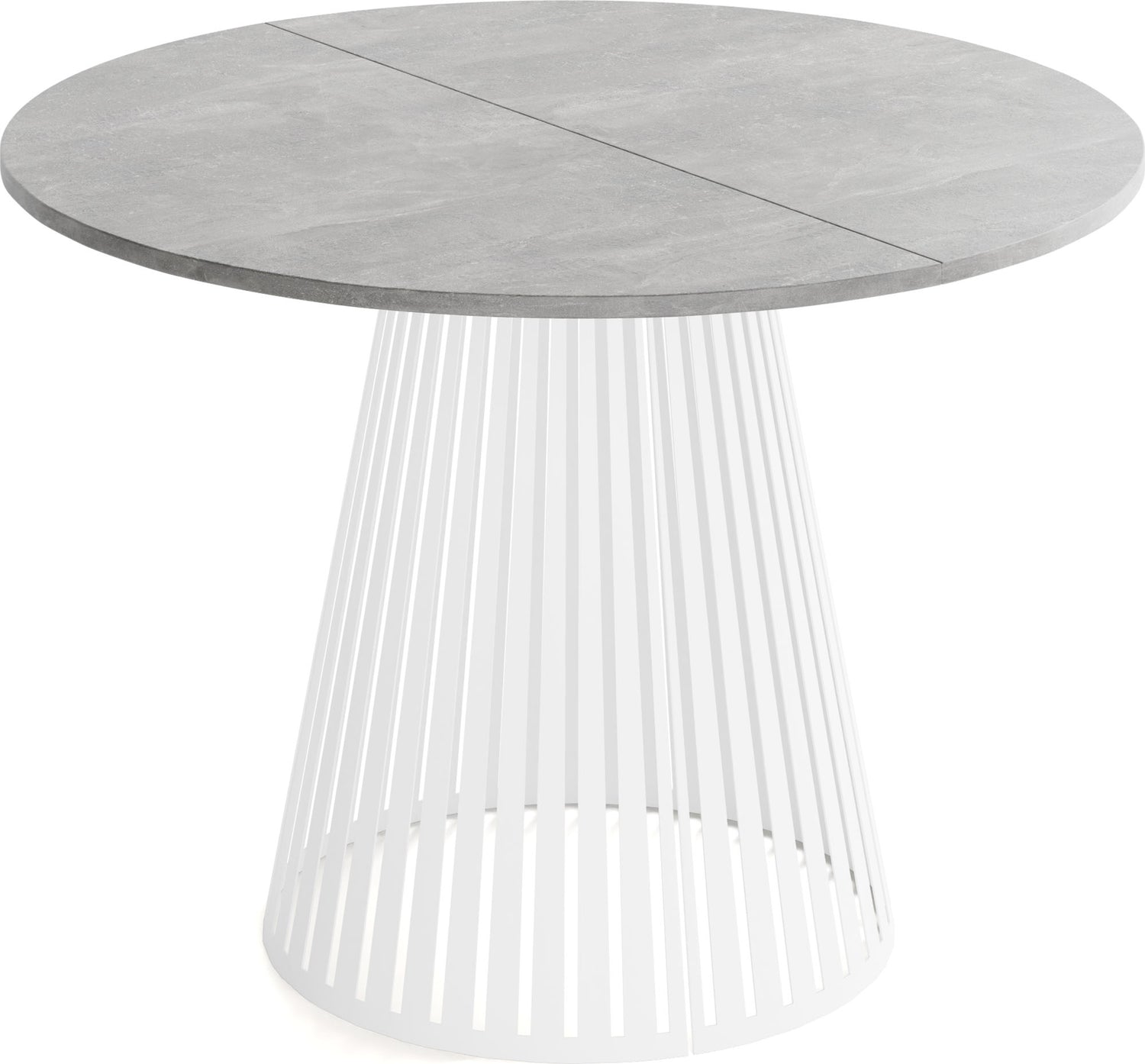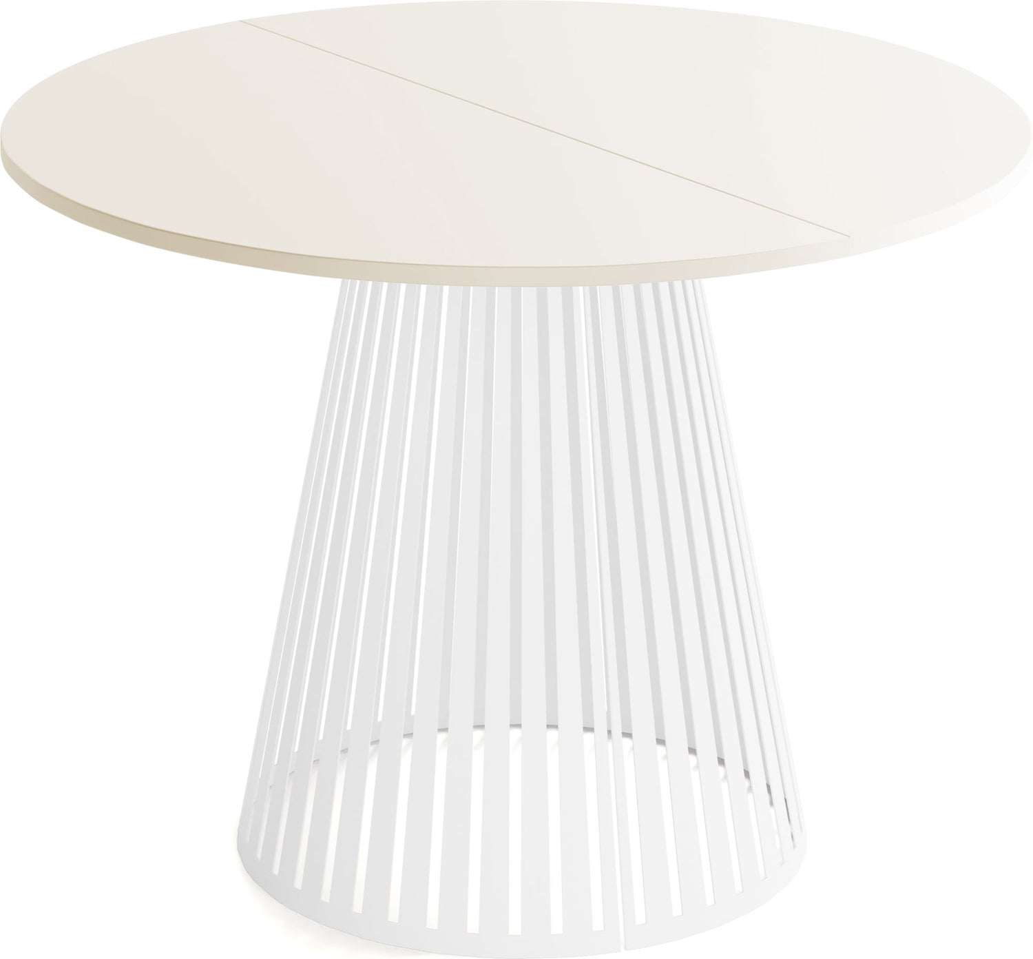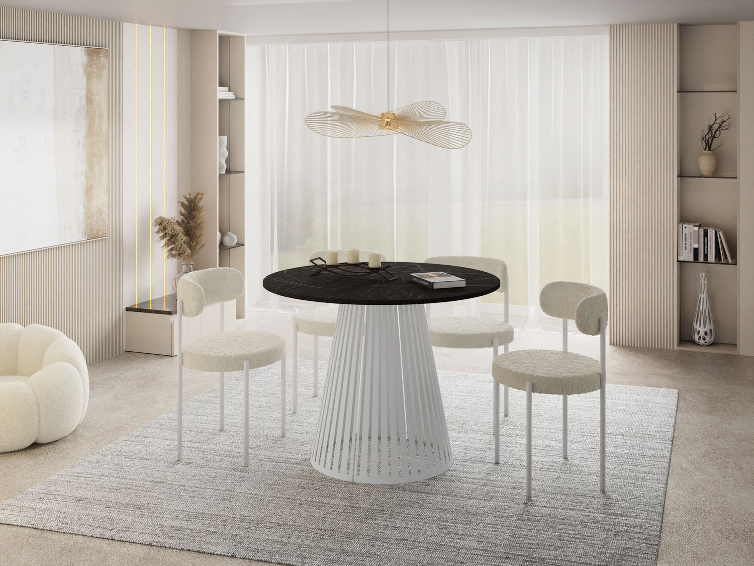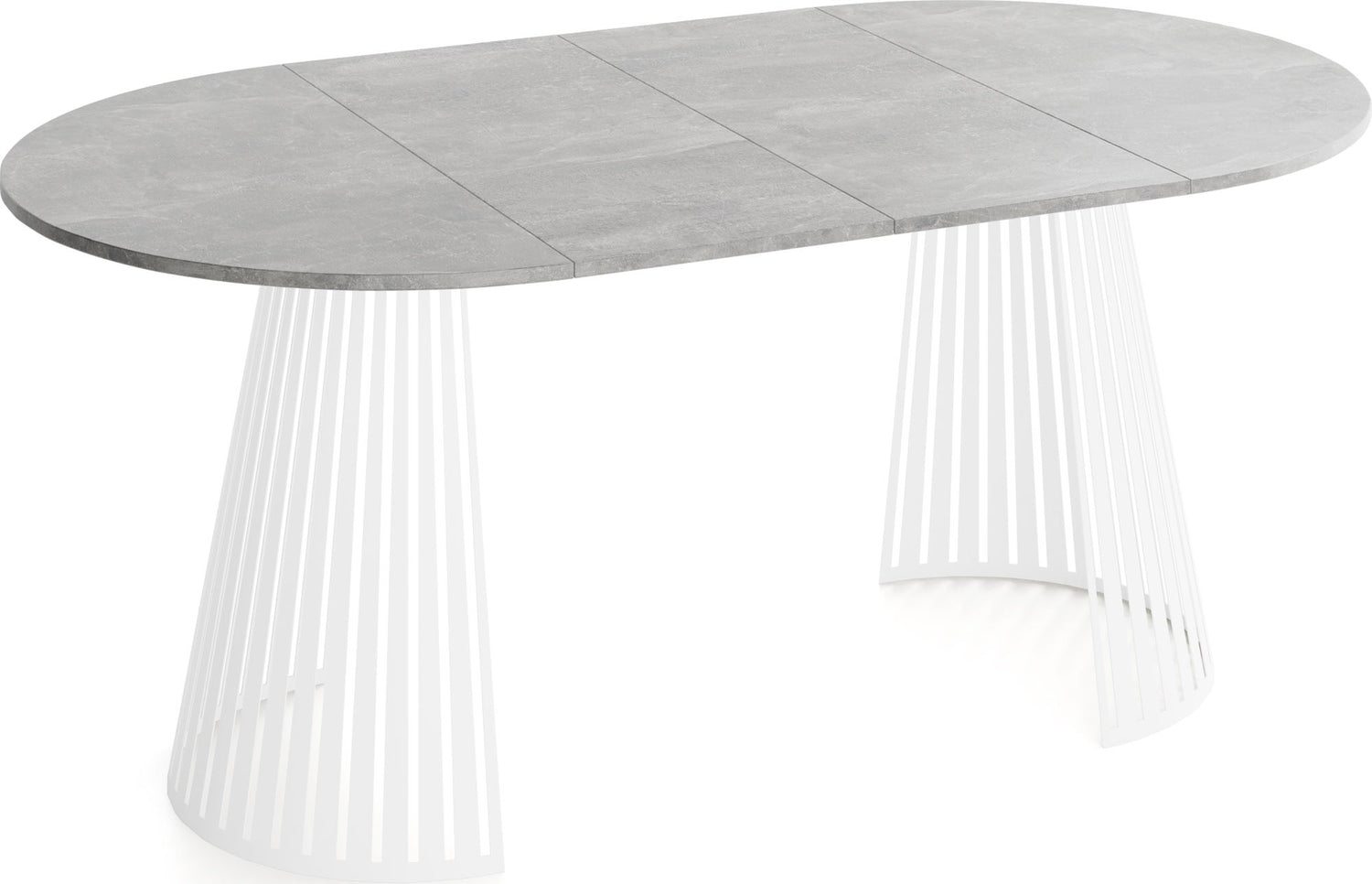 Der Esstisch Naro kombiniert zeitgemäßes Design mit praktischer Erweiterbarkeit. Die runde Tischplatte lässt sich im Handumdrehen zu einer großzügigen ovalen Tafel ausziehen – perfekt für gesellige Abende. Das auffällige, skulpturale Gestell aus weißen Metallstreben verleiht dem Tisch eine moderne, architektonische Note und sorgt gleichzeitig für Stabilität und Beinfreiheit.