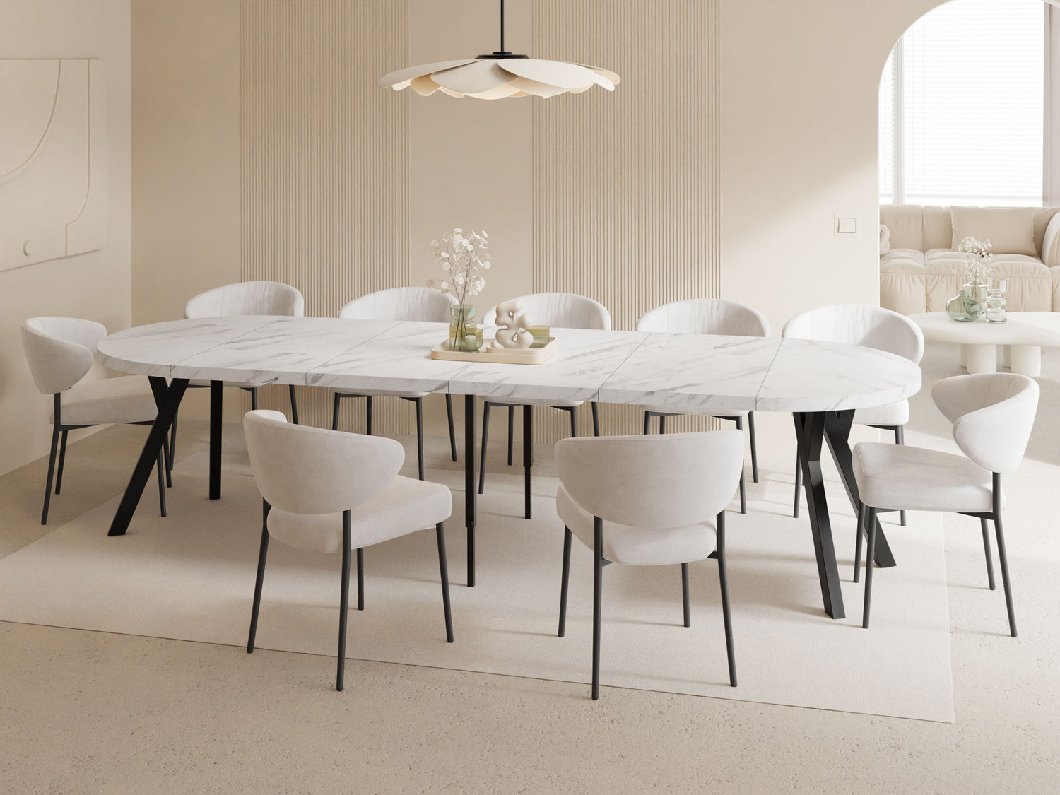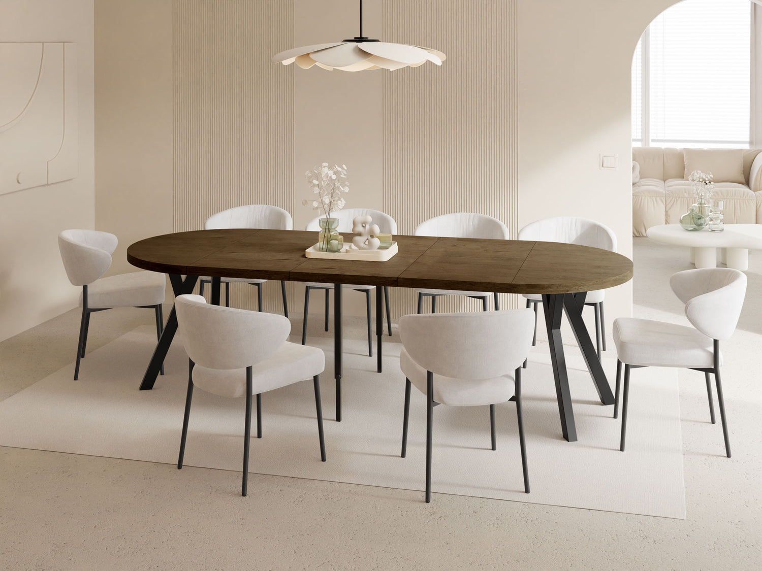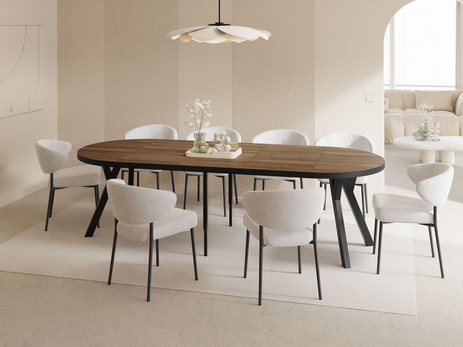 Der Esstisch Twixy bringt moderne Ruhe und klare Formsprache in Ihren Wohn- und Essbereich. Im kompakten Format fügt er sich harmonisch in den Raum ein und spart Platz; bei Bedarf wird er zur großzügigen, sanft ovalen Tafel – ideal für stilvolle Runden mit Familie und Freunden.