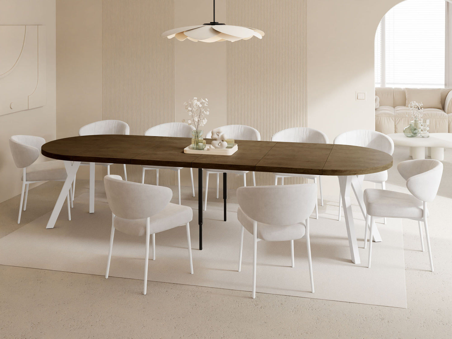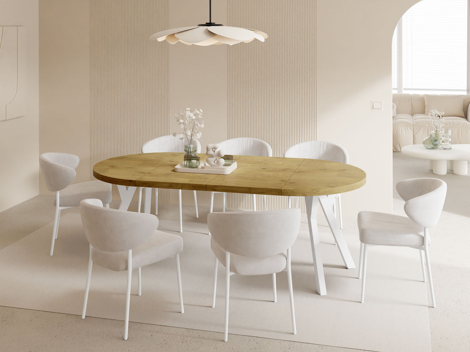 Der Esstisch Twixy bringt moderne Ruhe und klare Formsprache in Ihren Wohn- und Essbereich. Im kompakten Format fügt er sich harmonisch in den Raum ein und spart Platz; bei Bedarf wird er zur großzügigen, sanft ovalen Tafel – ideal für stilvolle Runden mit Familie und Freunden.