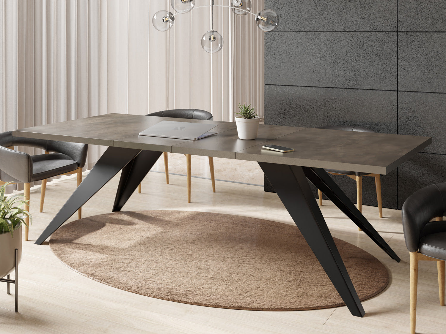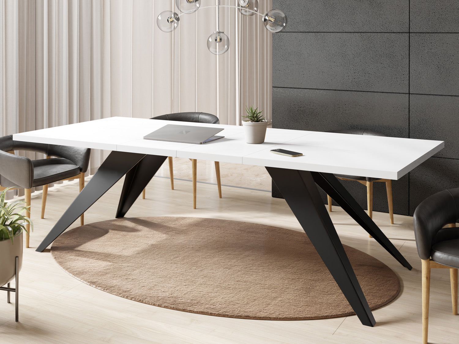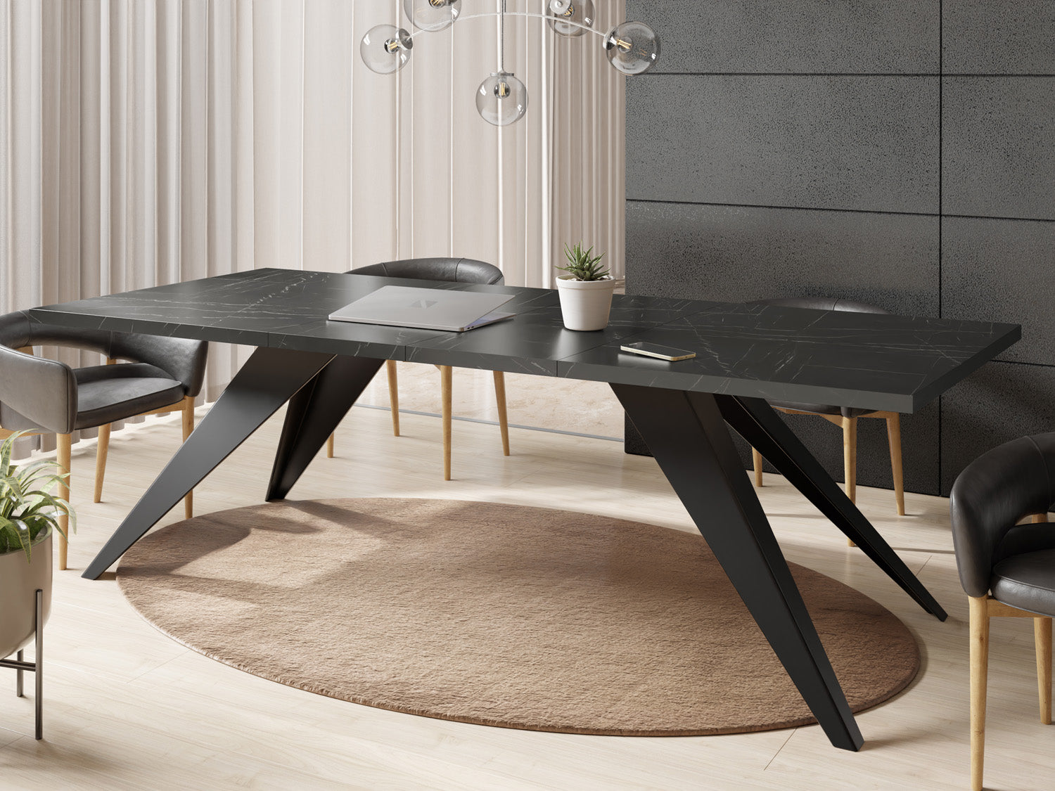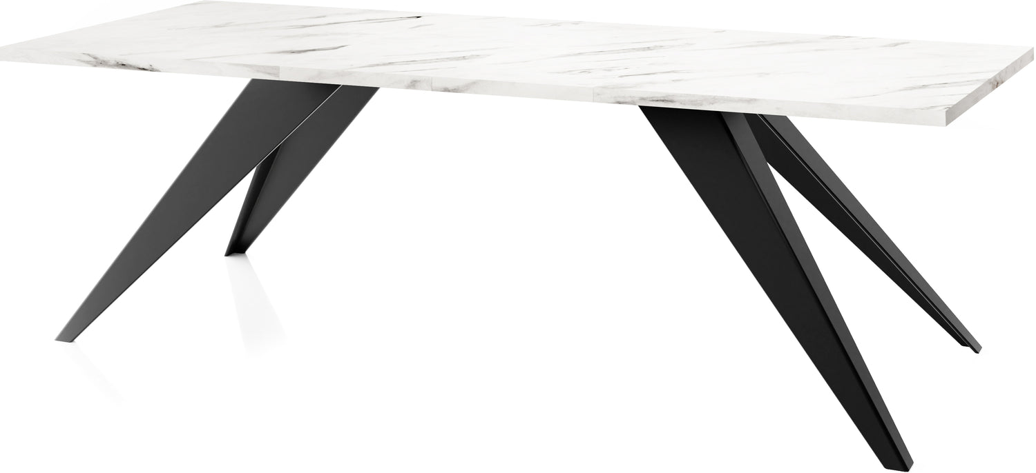 Unser vielseitiger ausziehbarer Esstisch ist eine Kombination aus Funktionalität und modernem Design, die zu Ihrem dynamischen Lebensstil passt. Die robusten Metallbeine sorgen für eine stabile Basis, so dass der Tisch problemlos von von einer gemütlichen Essensumgebung zu einem großzügigen Unterhaltungsbereich transformiert werden kann.