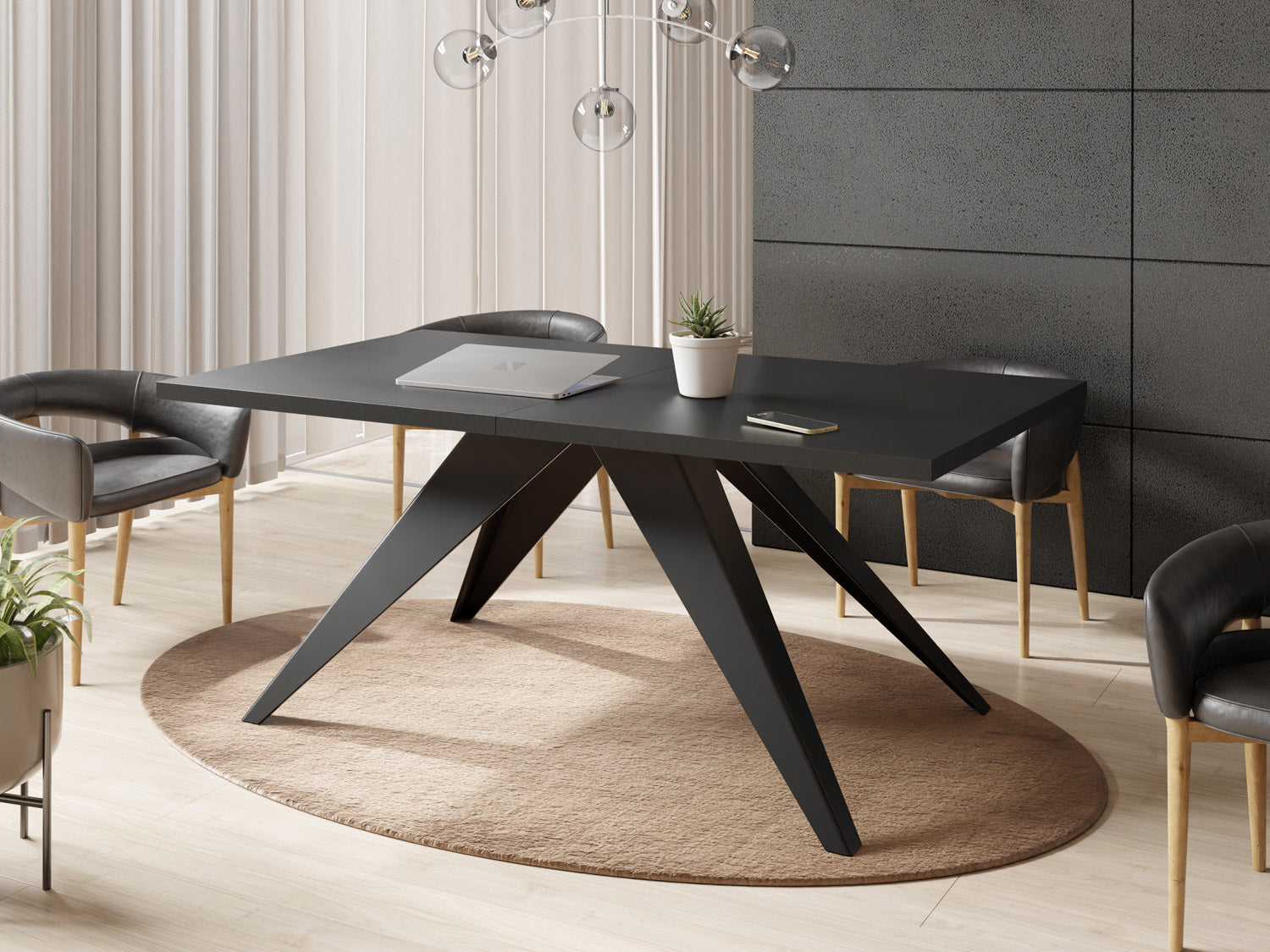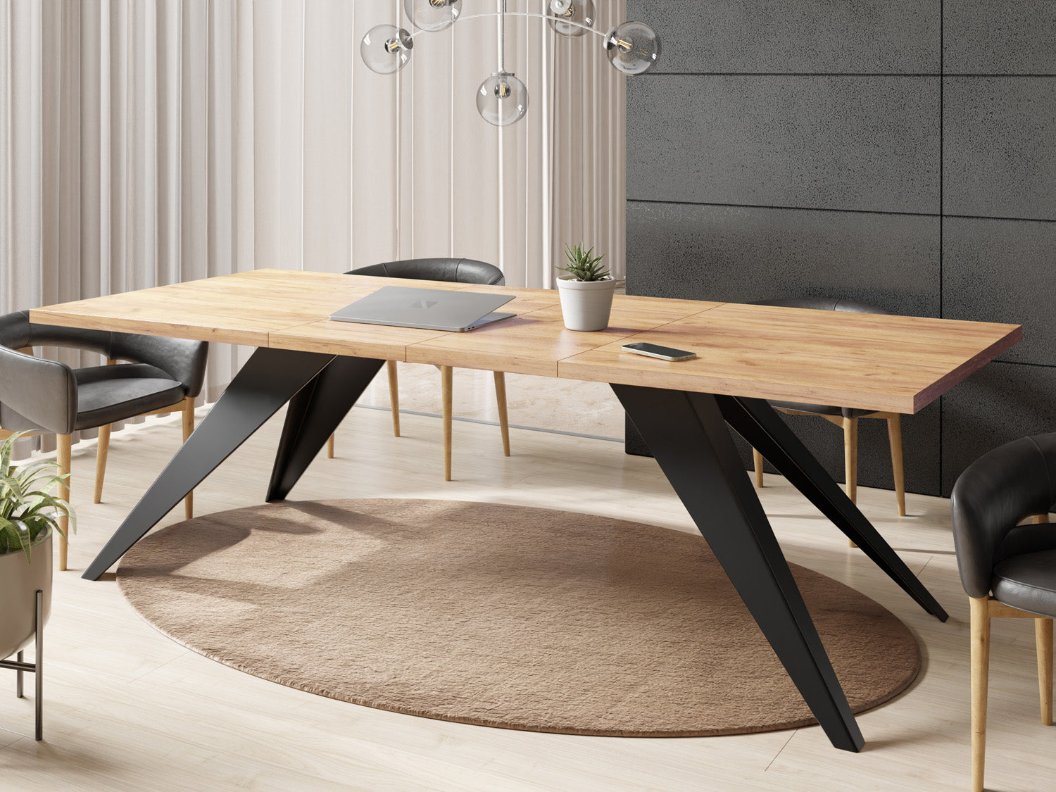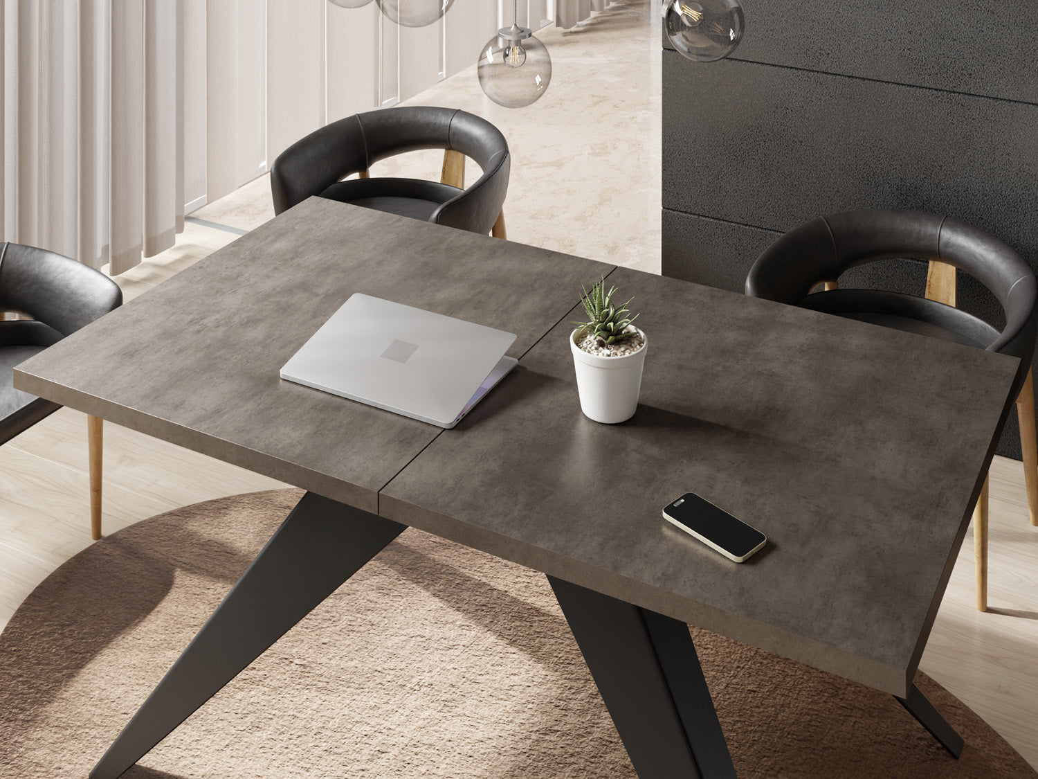 Unser vielseitiger ausziehbarer Esstisch ist eine Kombination aus Funktionalität und modernem Design, die zu Ihrem dynamischen Lebensstil passt. Die robusten Metallbeine sorgen für eine stabile Basis, so dass der Tisch problemlos von von einer gemütlichen Essensumgebung zu einem großzügigen Unterhaltungsbereich transformiert werden kann.