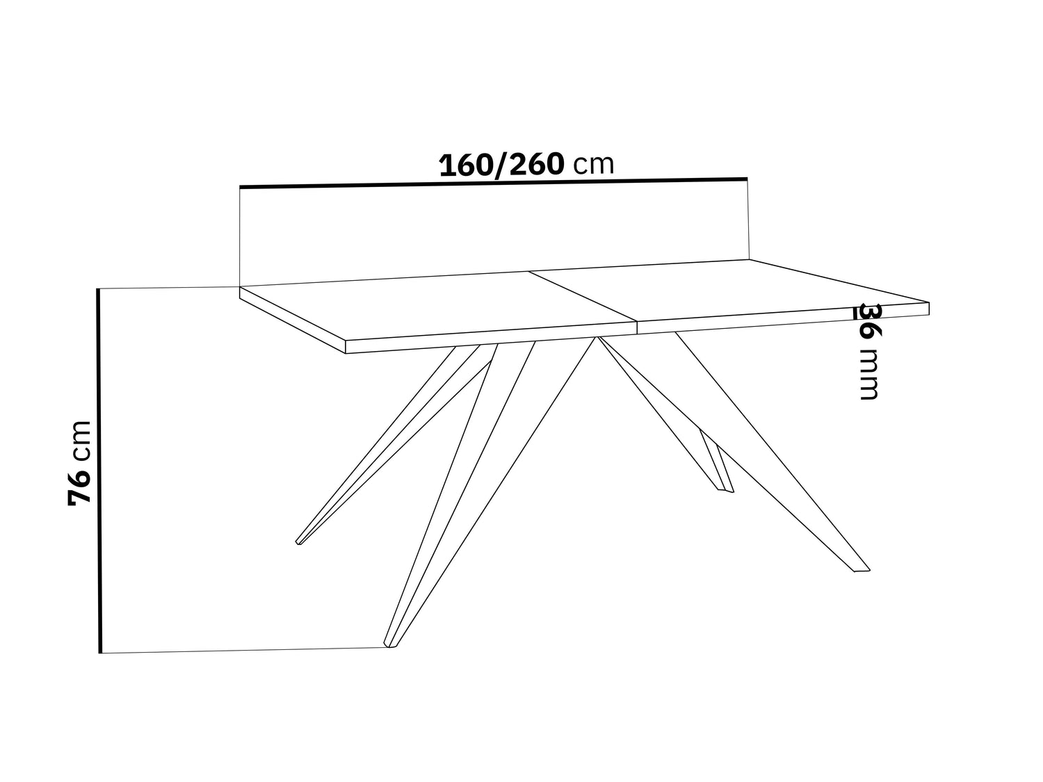 160 cm - 160 cm Breite, 90 cm Länge, Höhe 76 cm. Tischplatte auf 260 cm ausziehbar