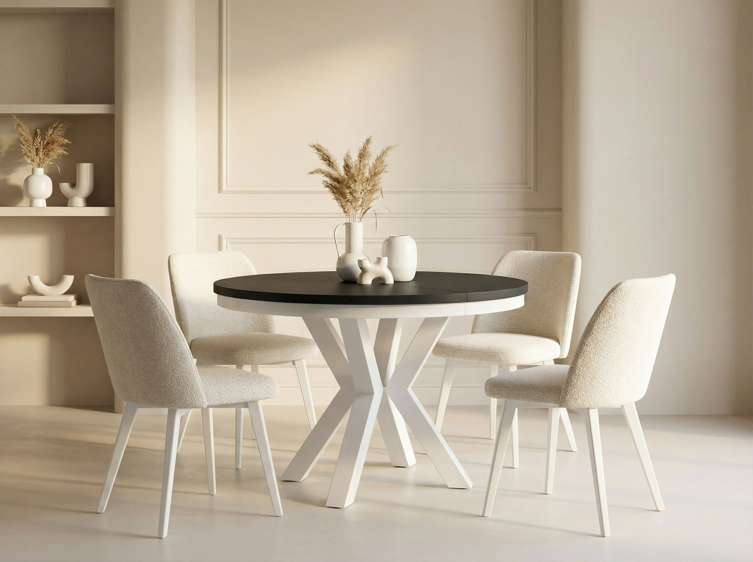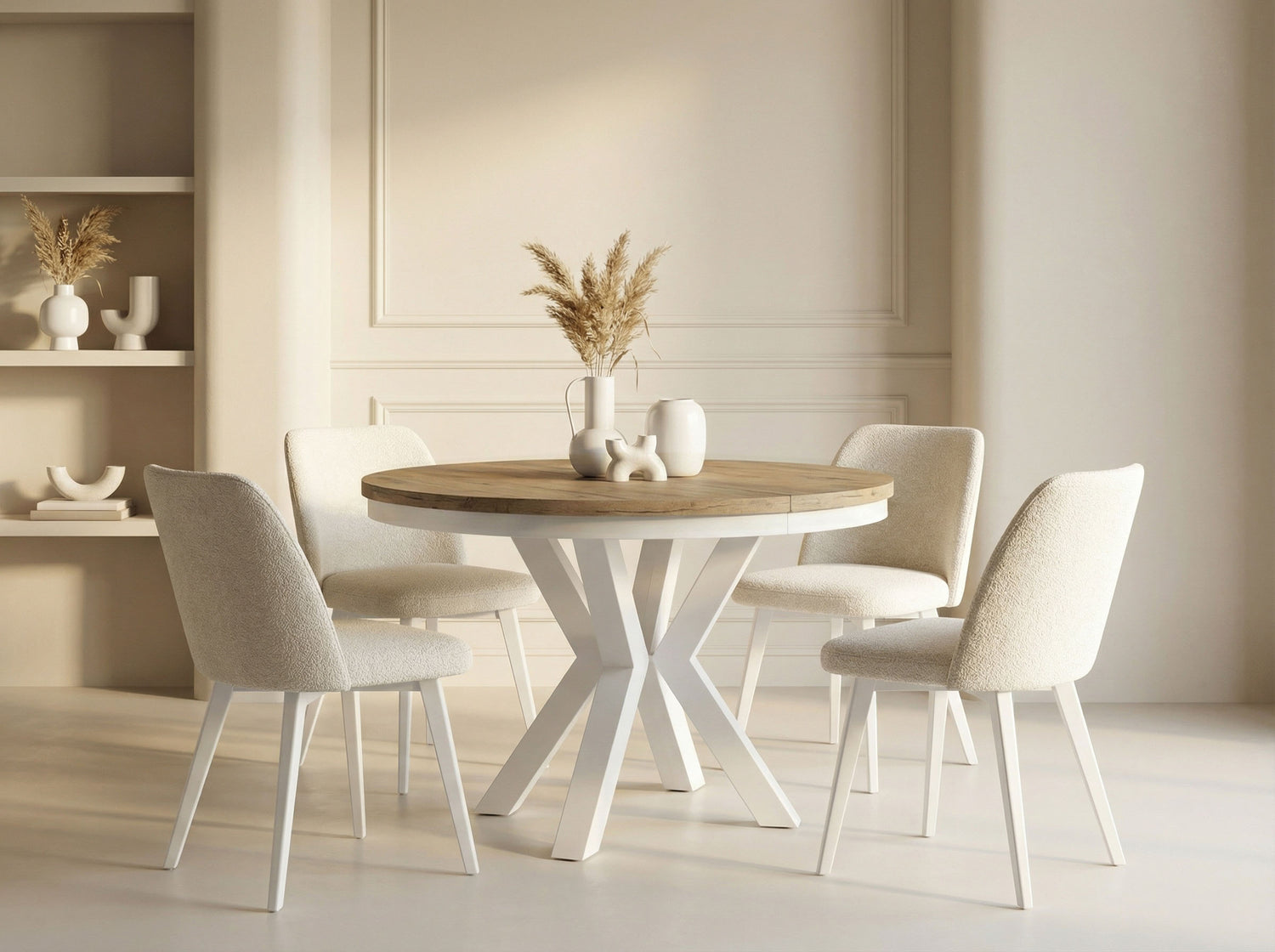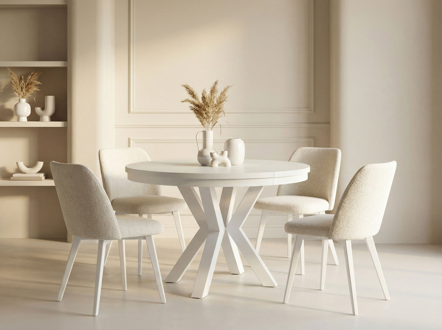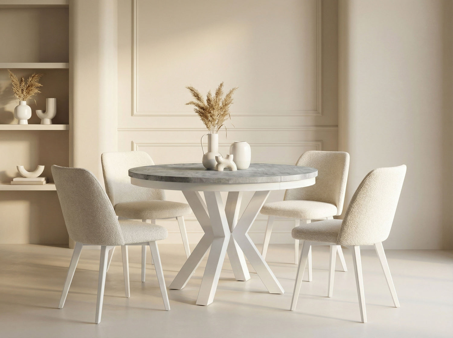 Eleganz und Funktionalität in einem Der Clara Esstisch vereint modernes Design mit praktischer Funktionalität. Die runde Form und das markante X-Gestell in Weißen schaffen einen zeitlosen Look, der sich harmonisch in Ihr Zuhause einfügt.