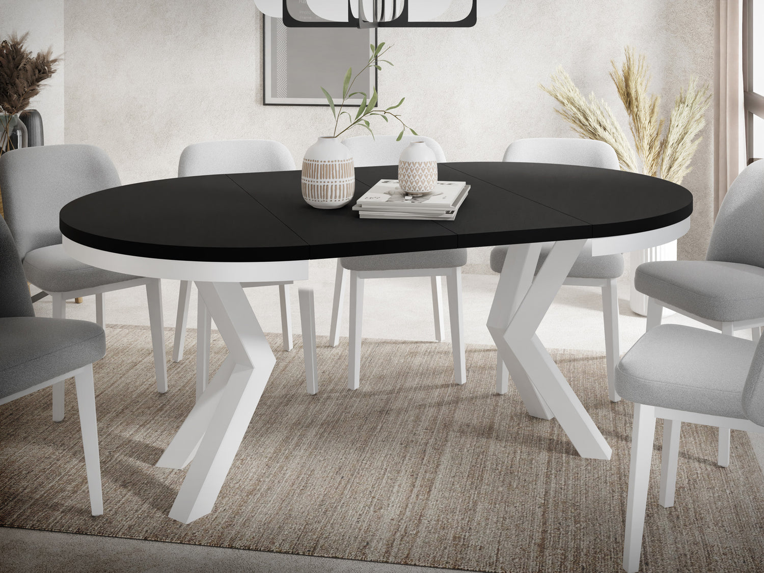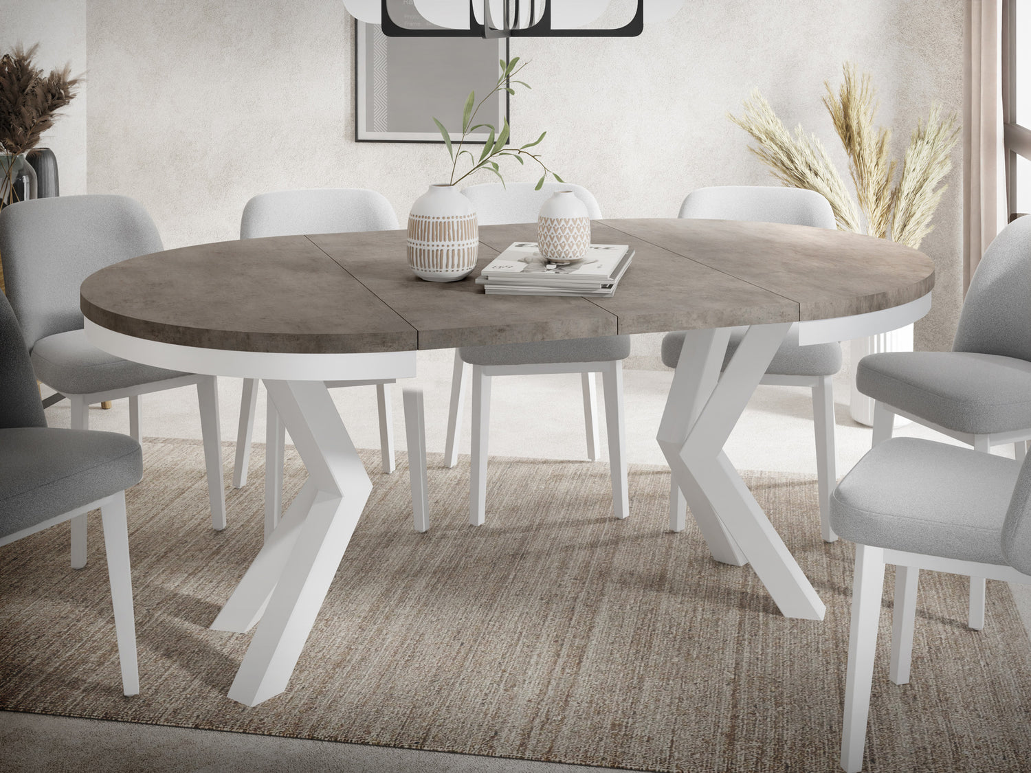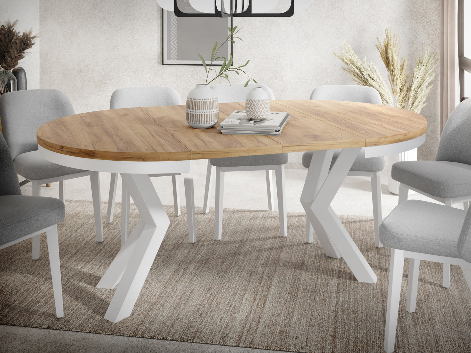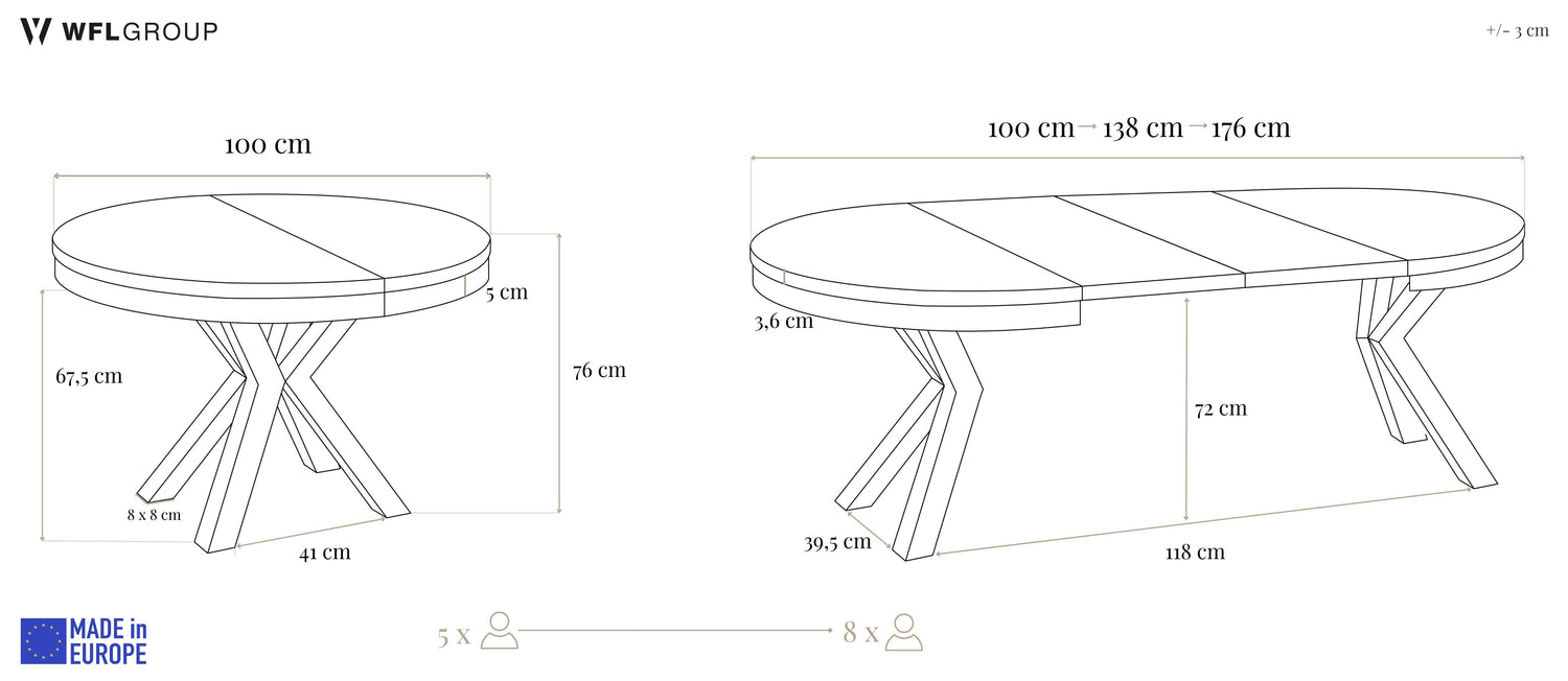 FLEXIBLES DESIGN – Runder Esstisch in zwei Grundgrößen erhältlich: Ø100 cm (ausziehbar bis 176 cm) für 5-8 Personen oder Ø120 cm (ausziehbar bis 196 cm) für 6-10 Personen. Die ovale Auszugsform bietet maximale Flexibilität