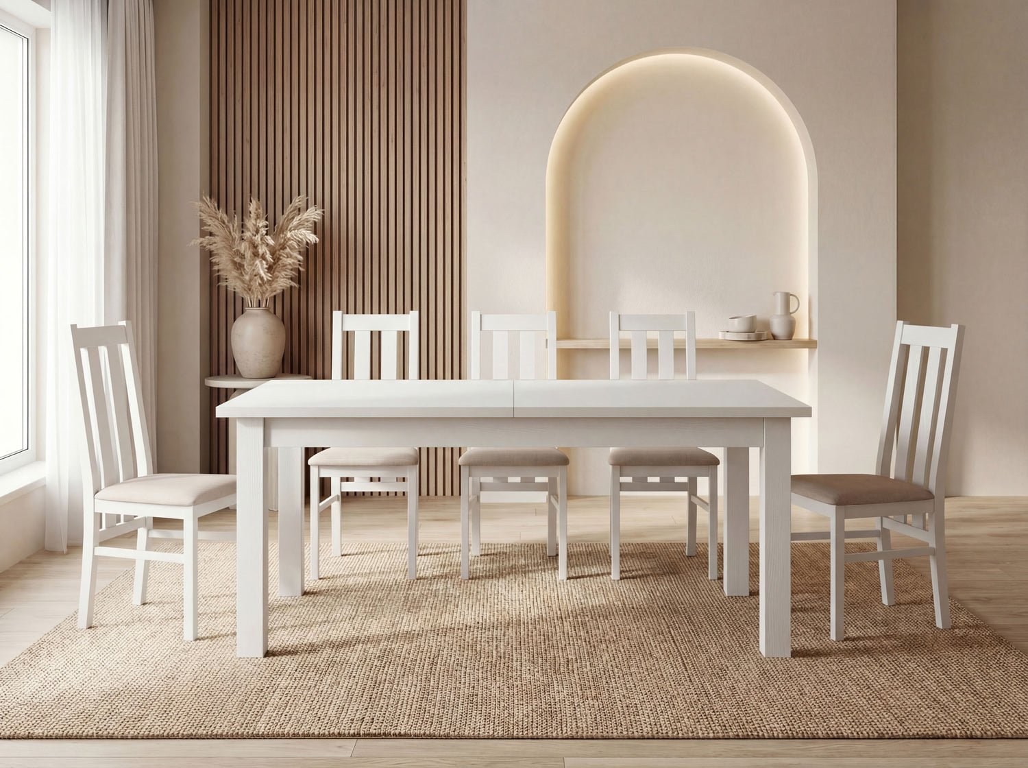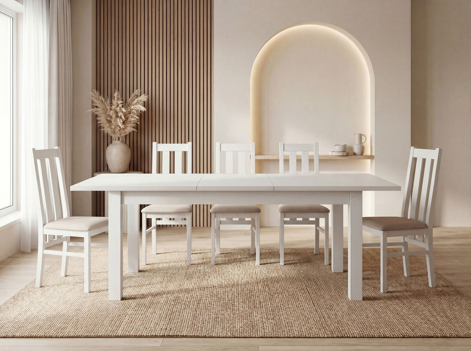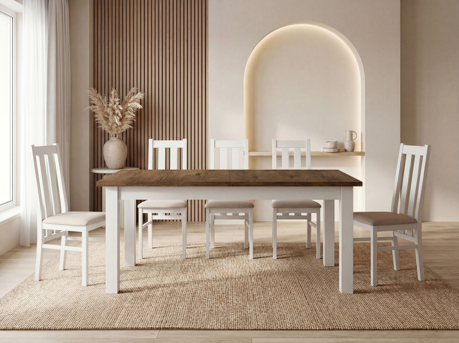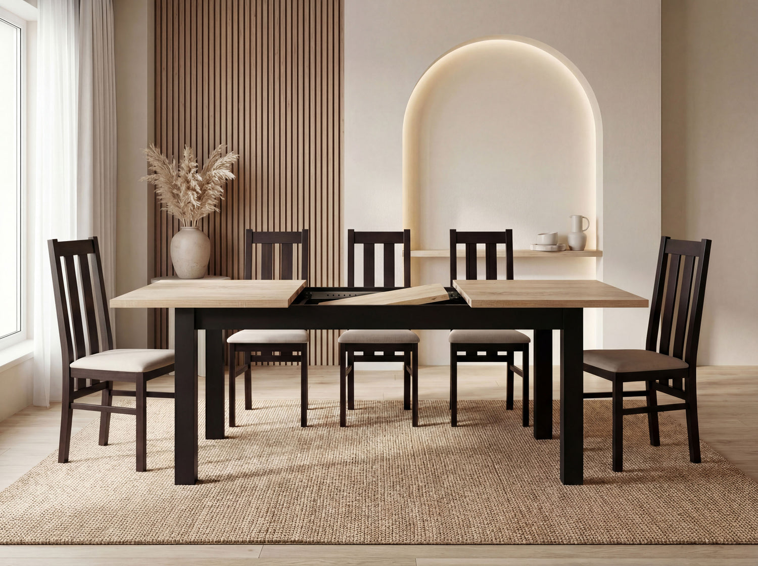 - Rechteckiger Esstisch in mehreren ausziehbaren Varianten: 120–160 cm, 140–160 cm, 150–190 cm, 160–240 cm oder 200–300 cm
