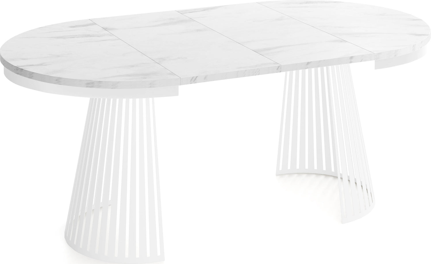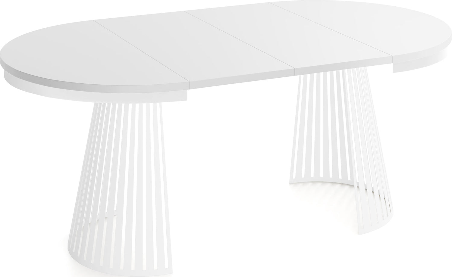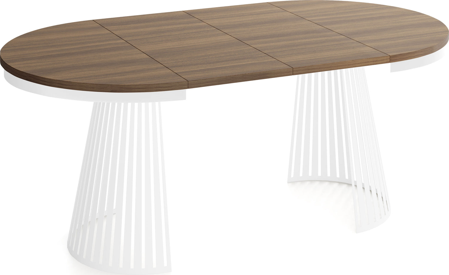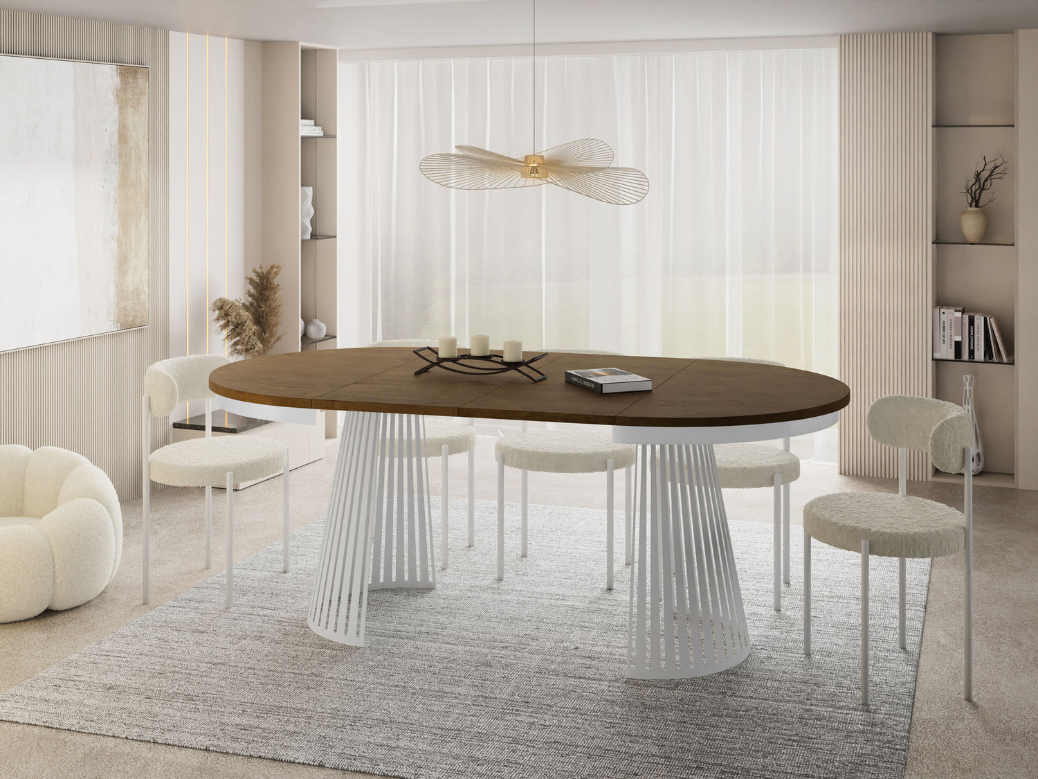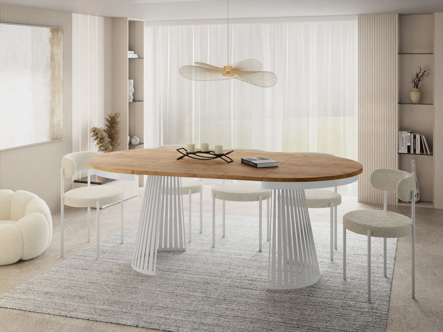 Der Esstisch Naro kombiniert zeitgemäßes Design mit praktischer Erweiterbarkeit. Die runde Tischplatte lässt sich im Handumdrehen zu einer großzügigen ovalen Tafel ausziehen – perfekt für gesellige Abende. Das auffällige, skulpturale Gestell aus weißen Metallstreben verleiht dem Tisch eine moderne, architektonische Note und sorgt gleichzeitig für Stabilität und Beinfreiheit.