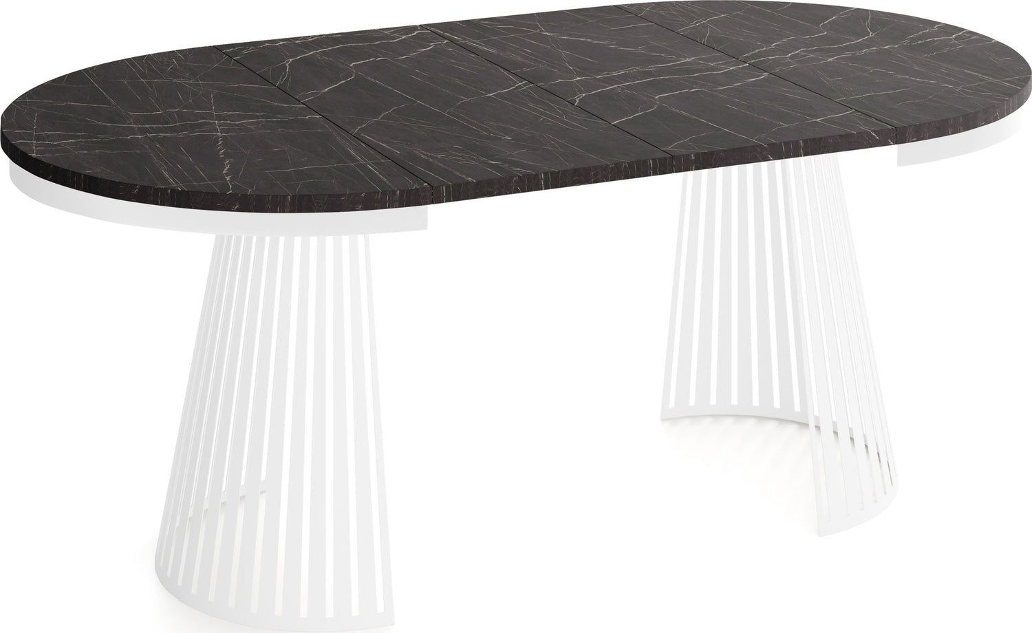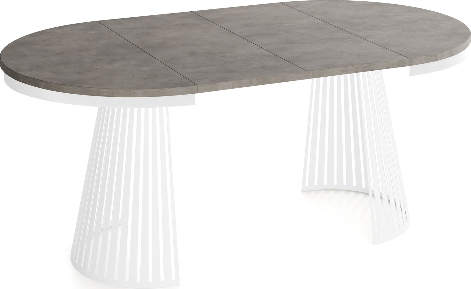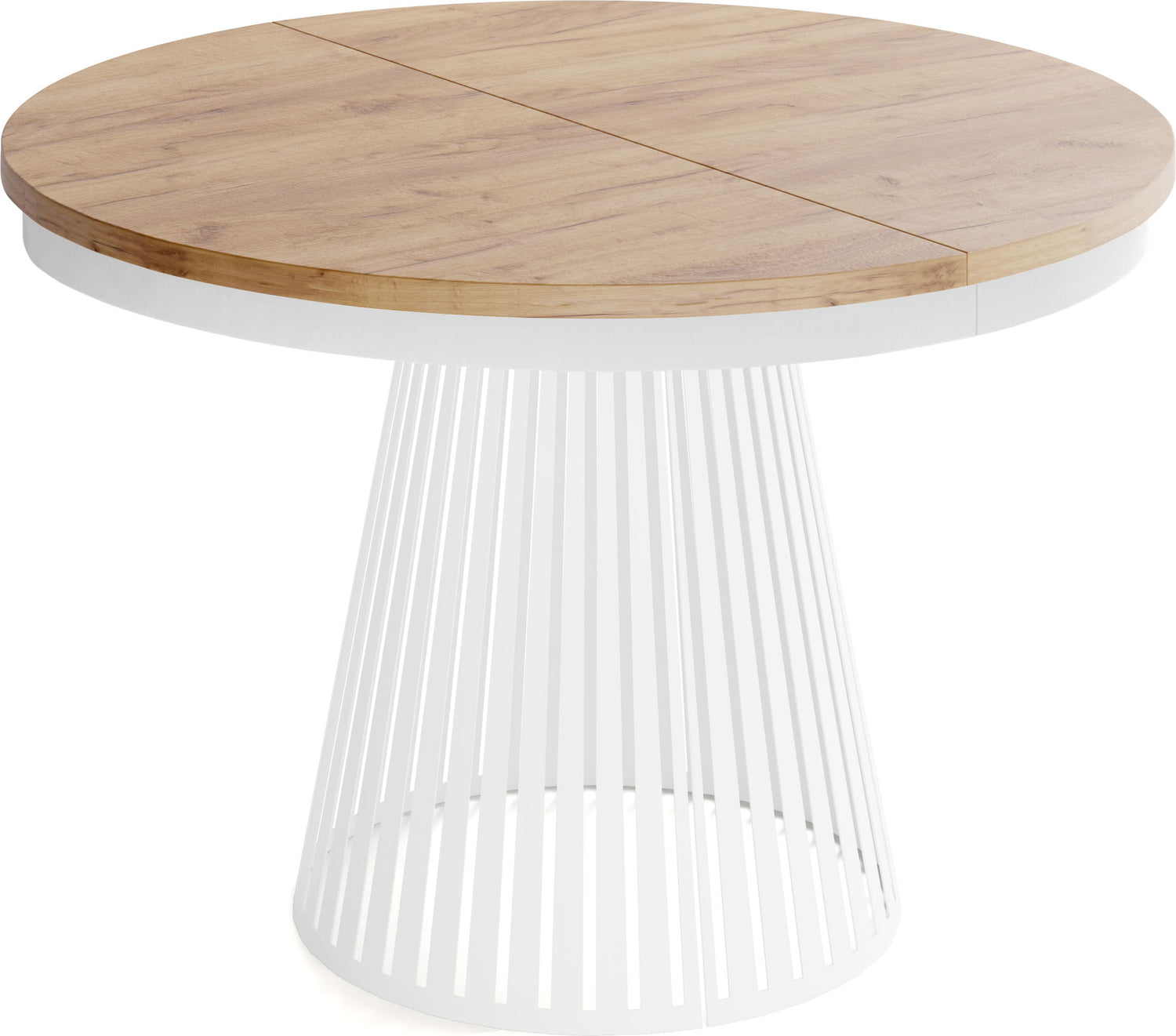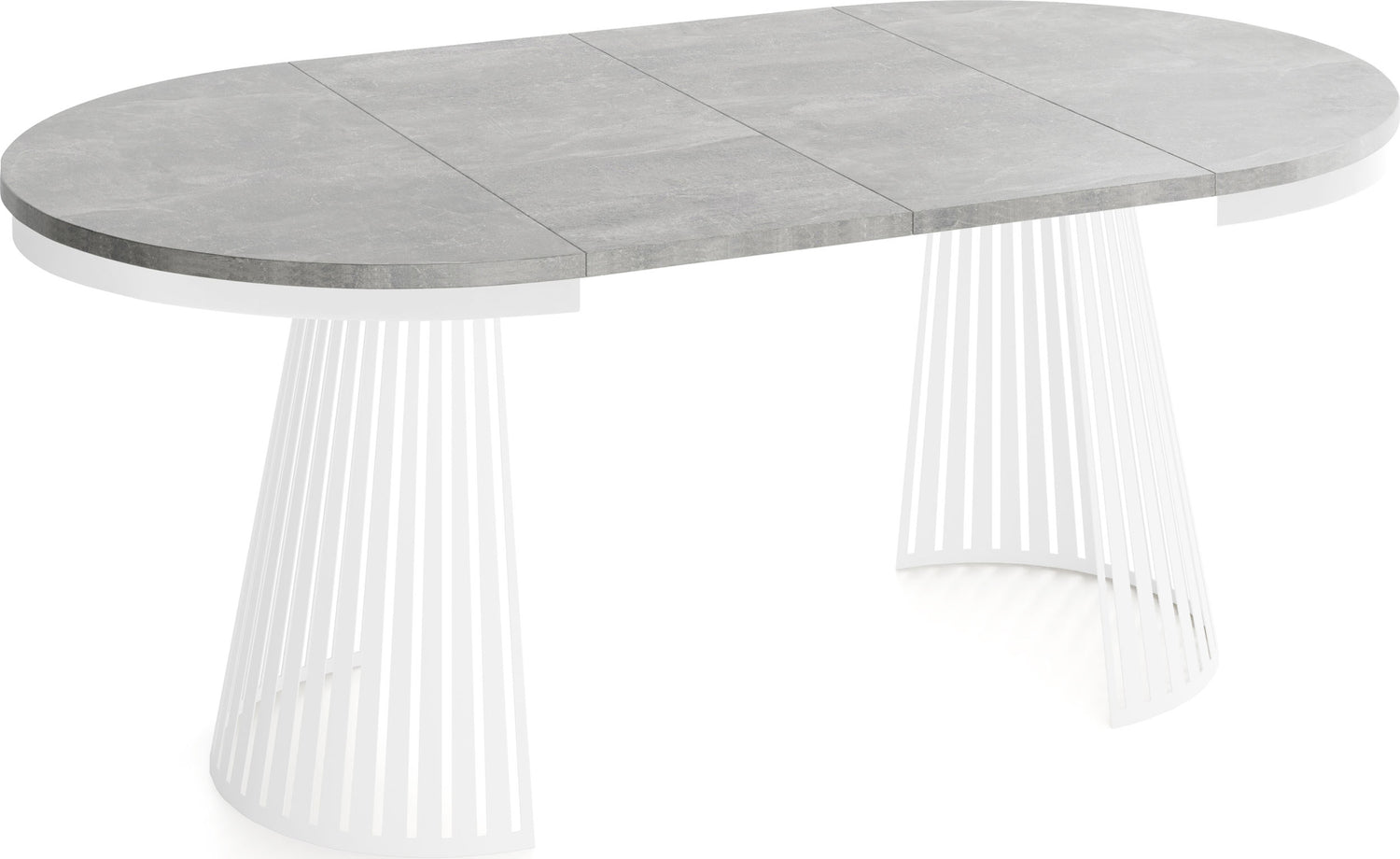 Der Esstisch Naro kombiniert zeitgemäßes Design mit praktischer Erweiterbarkeit. Die runde Tischplatte lässt sich im Handumdrehen zu einer großzügigen ovalen Tafel ausziehen – perfekt für gesellige Abende. Das auffällige, skulpturale Gestell aus weißen Metallstreben verleiht dem Tisch eine moderne, architektonische Note und sorgt gleichzeitig für Stabilität und Beinfreiheit.