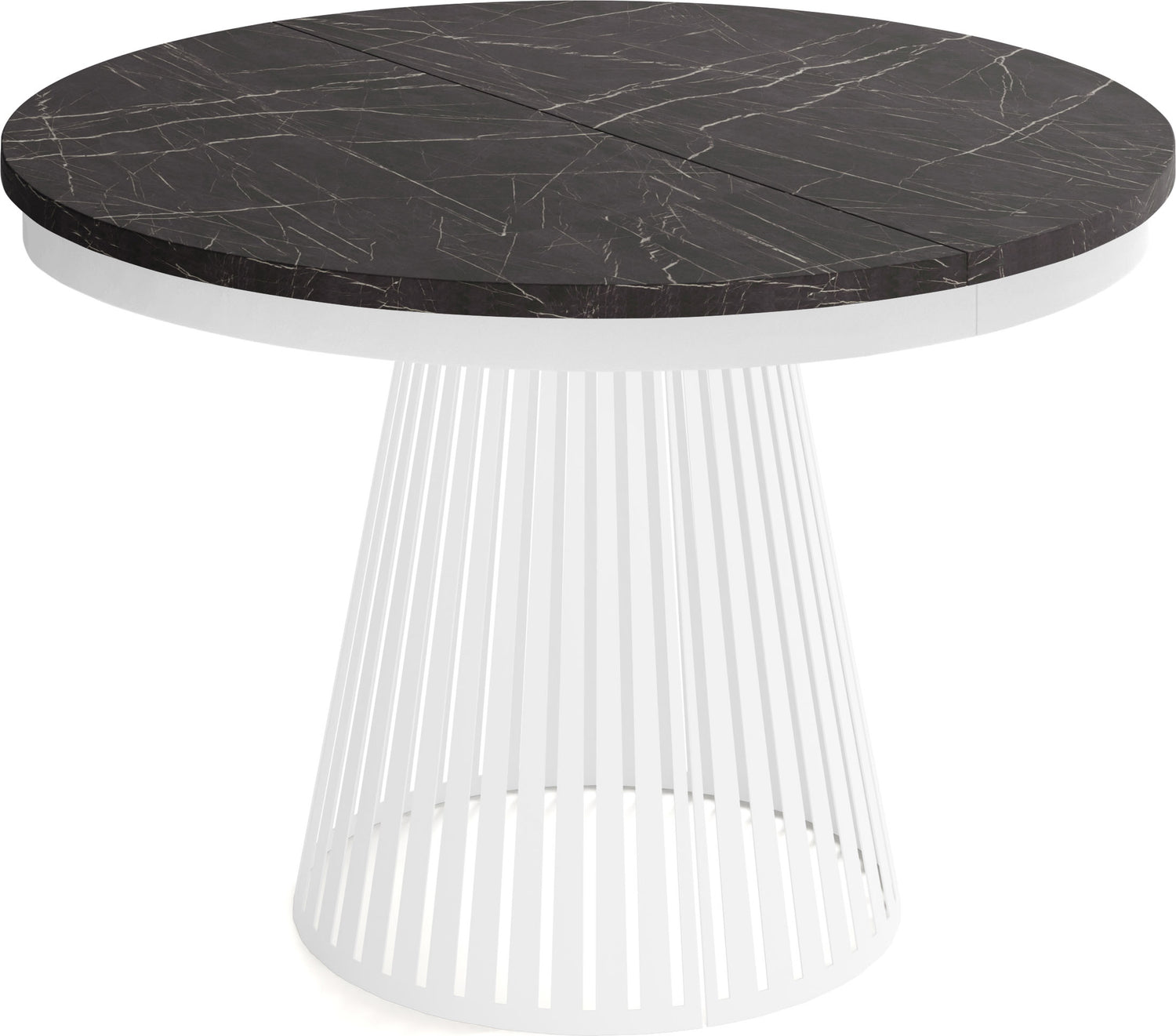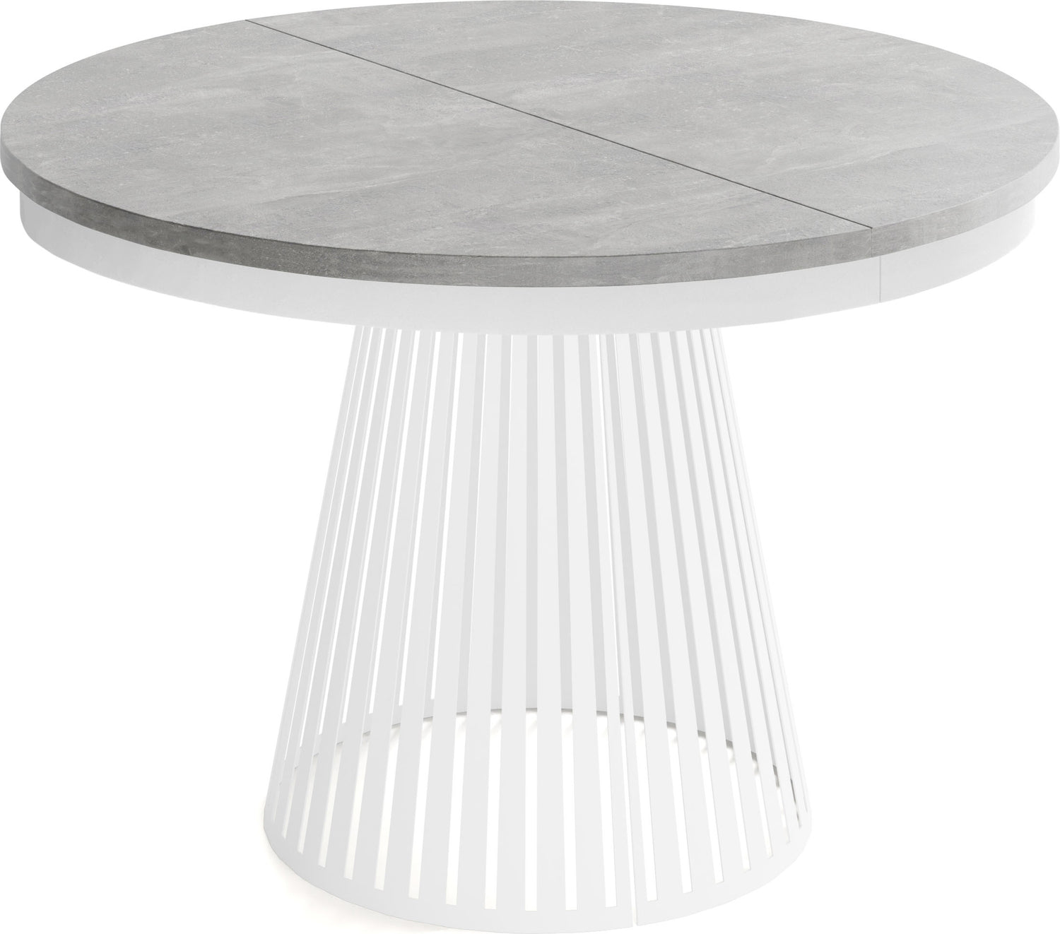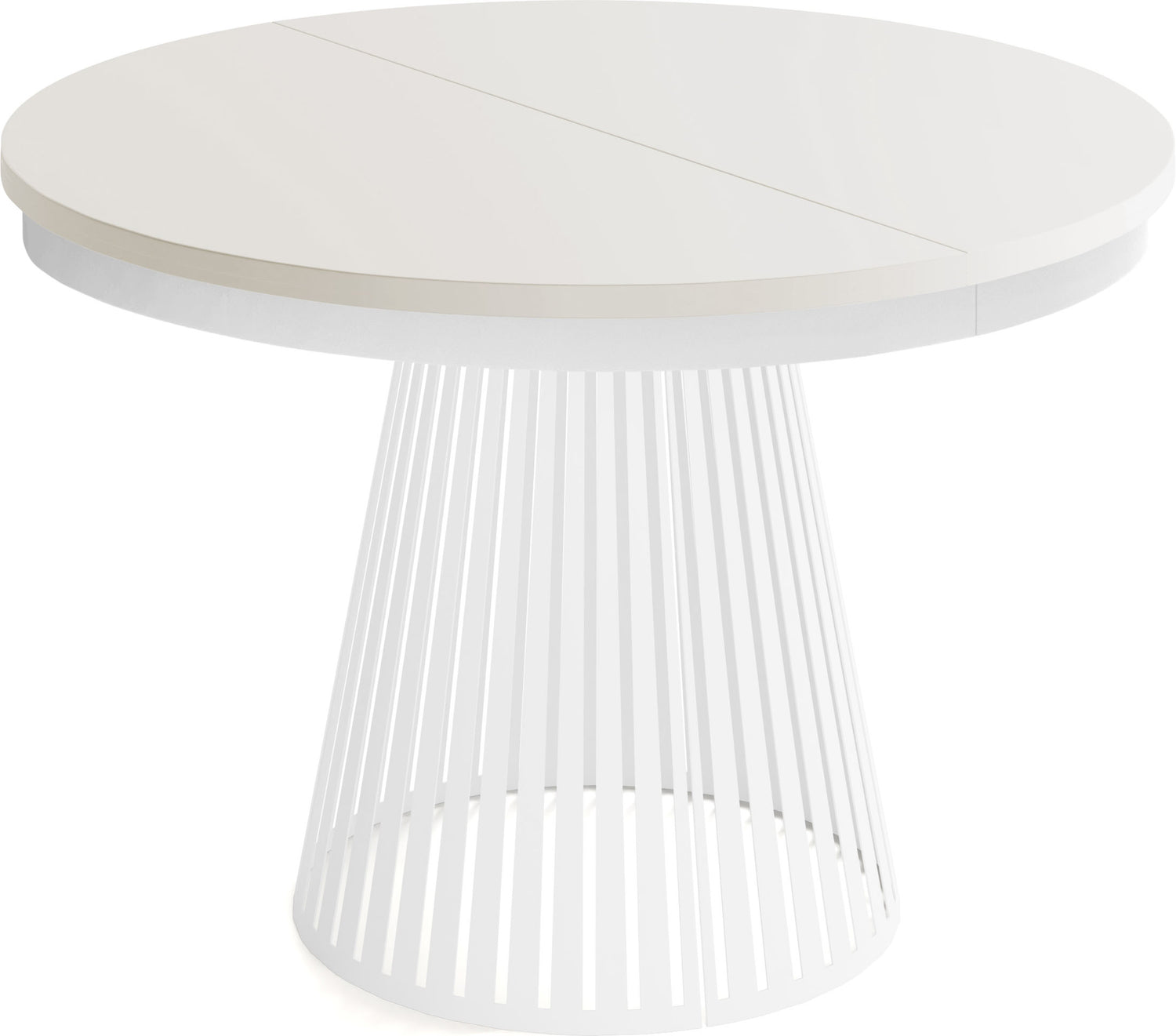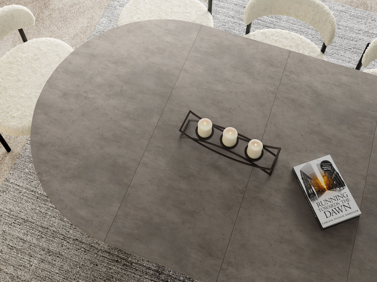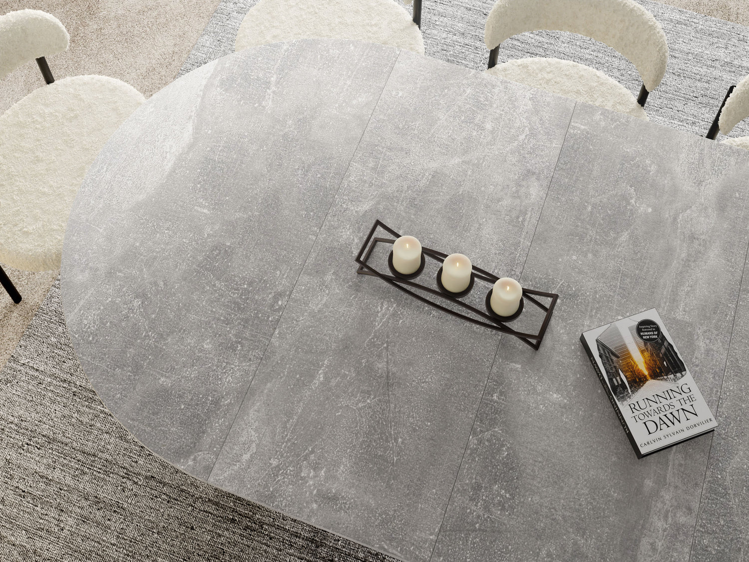 Der Esstisch Naro kombiniert zeitgemäßes Design mit praktischer Erweiterbarkeit. Die runde Tischplatte lässt sich im Handumdrehen zu einer großzügigen ovalen Tafel ausziehen – perfekt für gesellige Abende. Das auffällige, skulpturale Gestell aus weißen Metallstreben verleiht dem Tisch eine moderne, architektonische Note und sorgt gleichzeitig für Stabilität und Beinfreiheit.