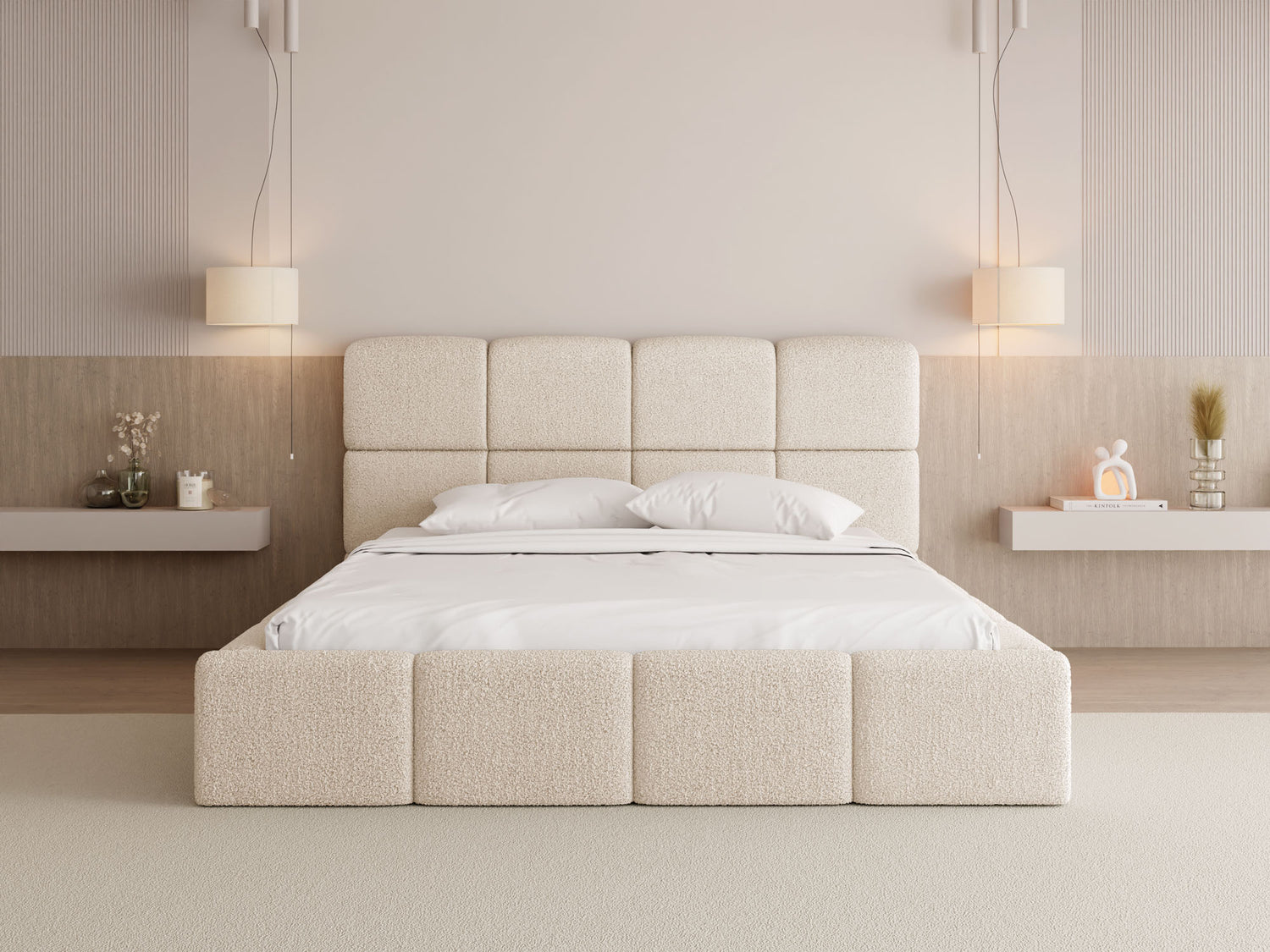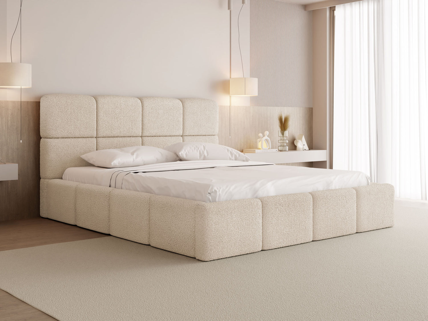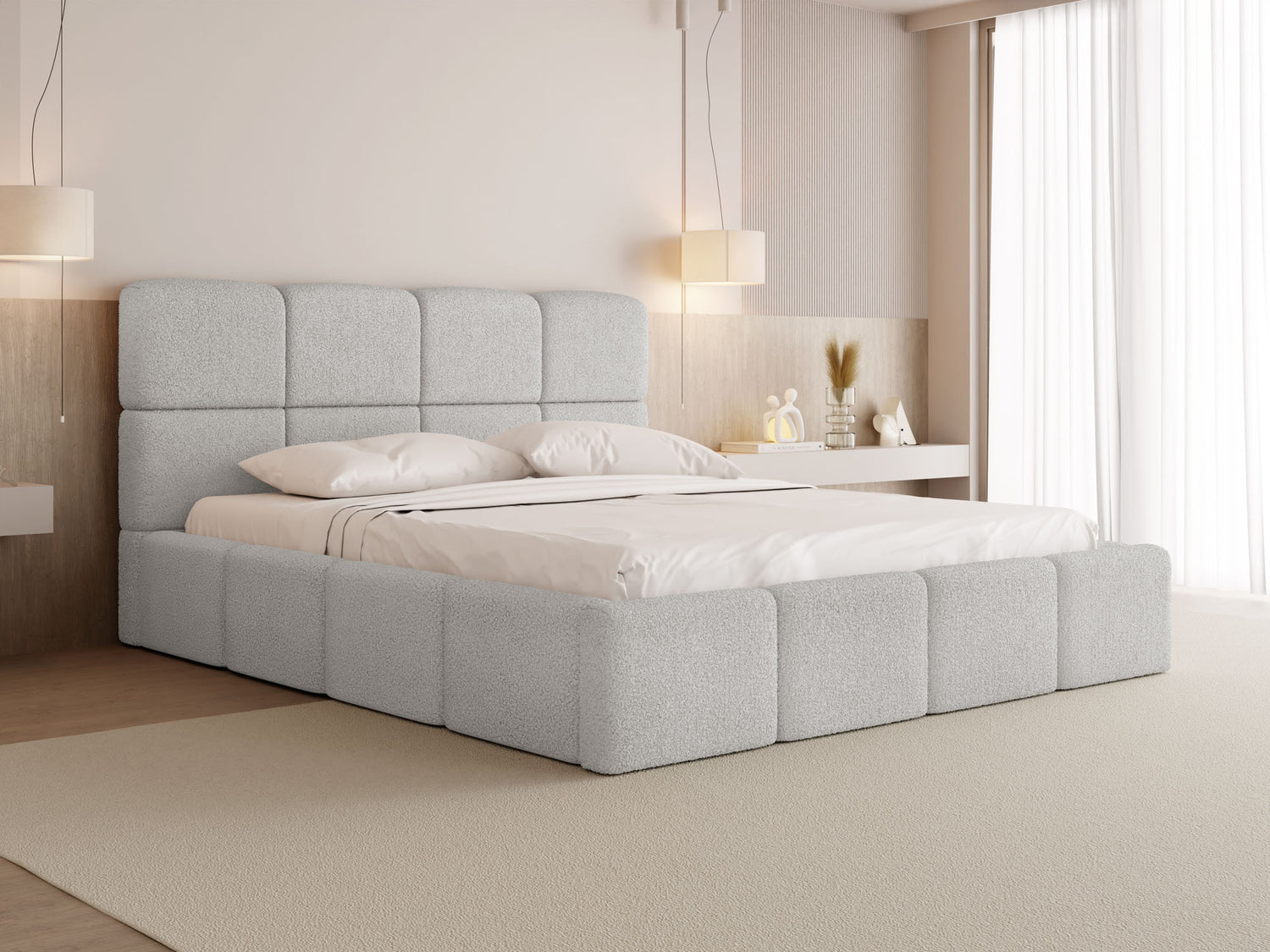 EIN BLICKFANG FÜR JEDES SCHLAFZIMMER – Mit seiner voluminösen Form, markanten Kastensteppung und rundum gepolsterten Elementen wird dieses Bett zum stilvollen Mittelpunkt jedes Schlafzimmers. Die weichen Konturen und das harmonische Design verleihen dem Raum eine moderne, gemütliche Atmosphäre – ideal für alle, die Design und Komfort stilvoll verbinden möchten