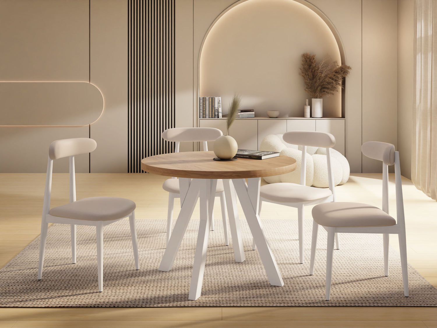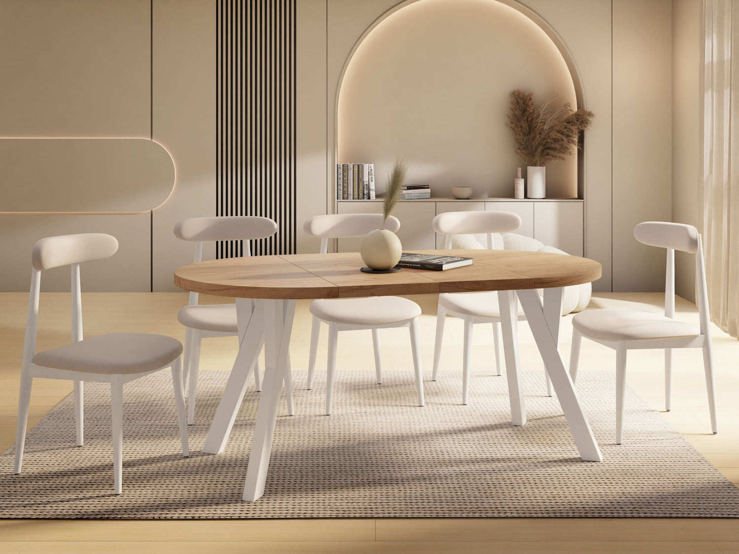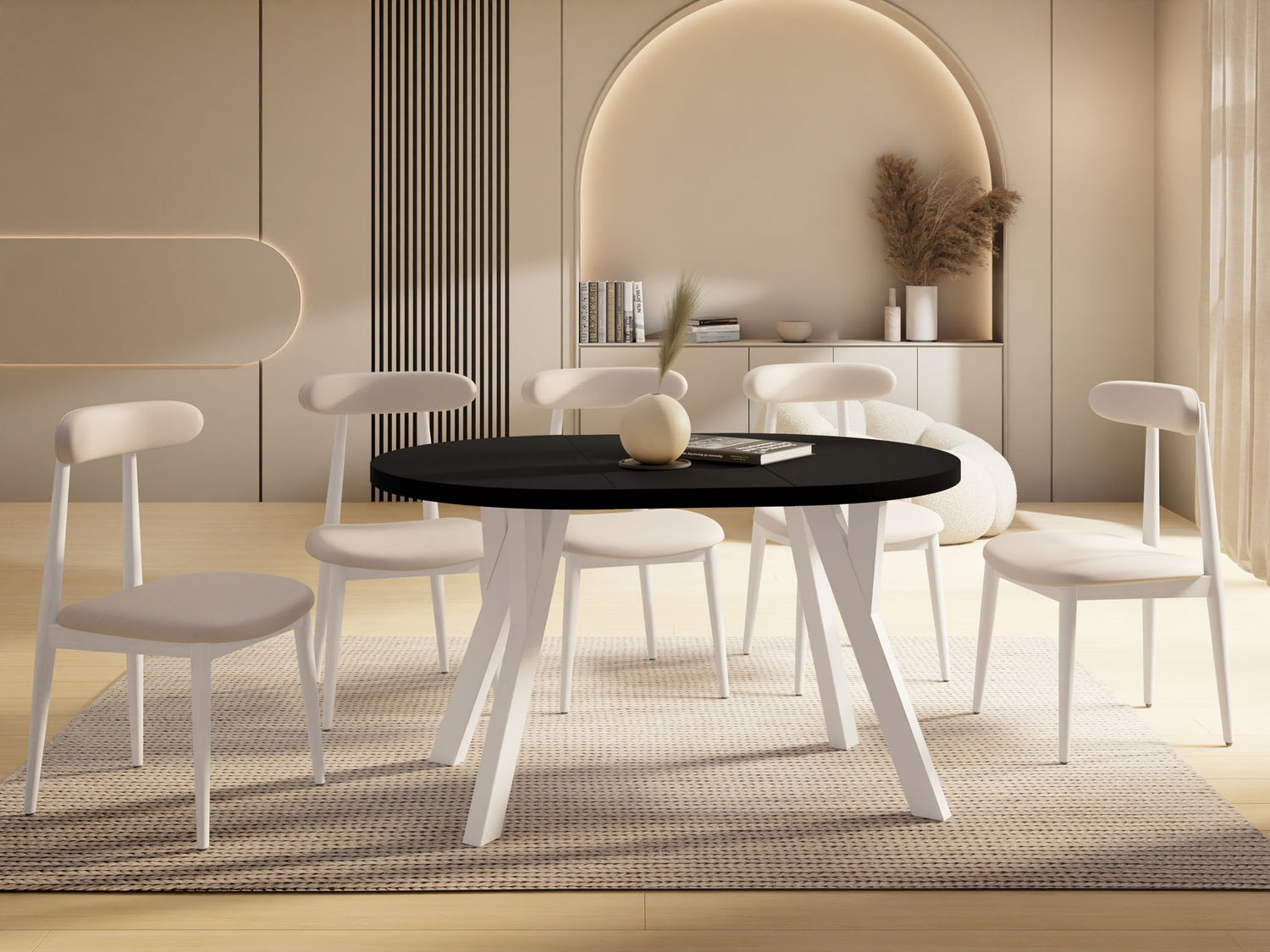 Dieser runde Tisch verbindet minimalistisches Design mit maximaler Funktionalität. Je nach gewählter Variante lässt er sich mühelos ausziehen: von 80 auf 160 cm (bietet damit ausreichend Platz für 4–8 Personen), 90 auf 190 cm (für 5–9 Personen), 100 auf 140 cm (für 5–7 Personen) oder 100 auf 200 cm (für 5–10 Personen). Perfekt für den Alltag, spontane Gäste, Familienfeiern oder entspannte Dinnerabende.