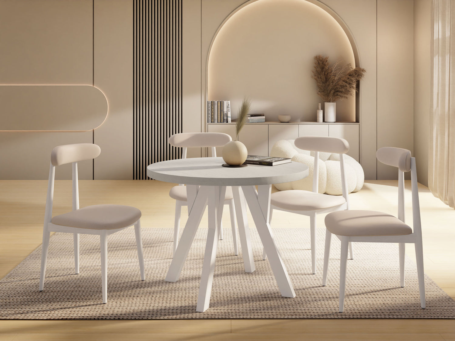Das klare Design mit den weißen Massivholzbeinen und der eleganten Tischplatte macht ihn zu einem echten Blickfang in jedem Raum. Ob in der Küche, im Esszimmer, im Wohnzimmer oder im Homeoffice – dieser Tisch fügt sich harmonisch in verschiedenste Einrichtungsstile ein, von modern bis skandinavisch.