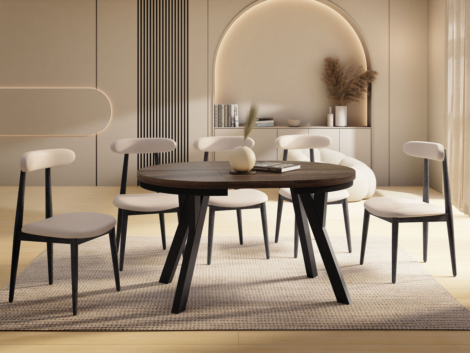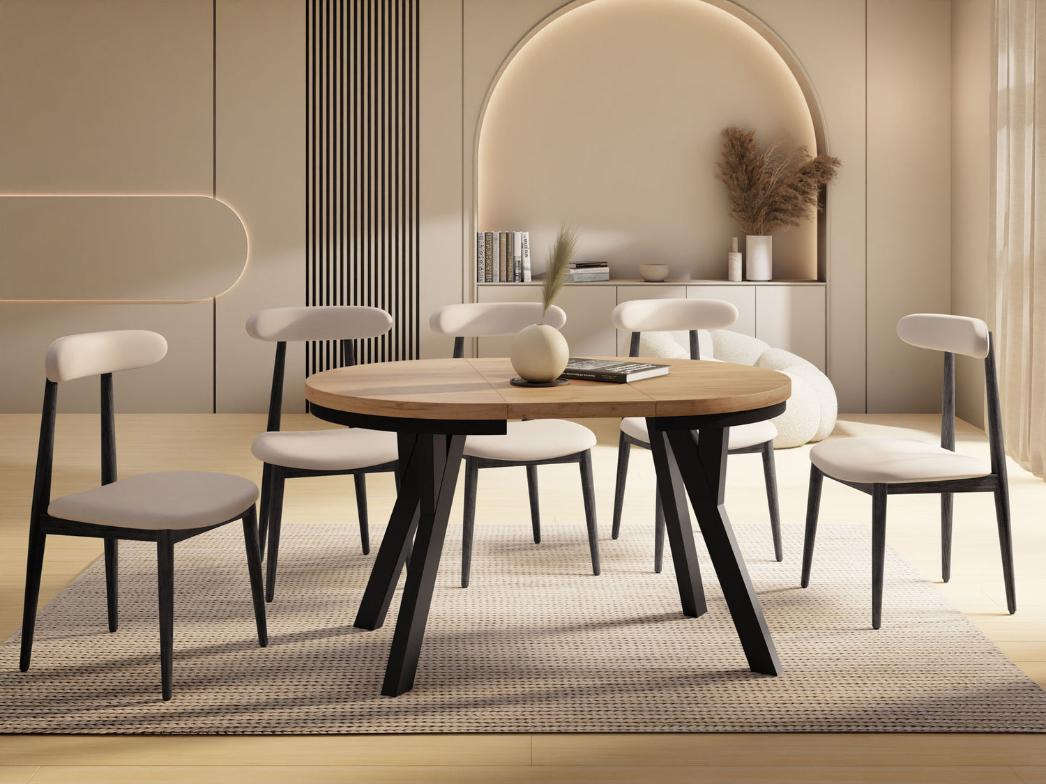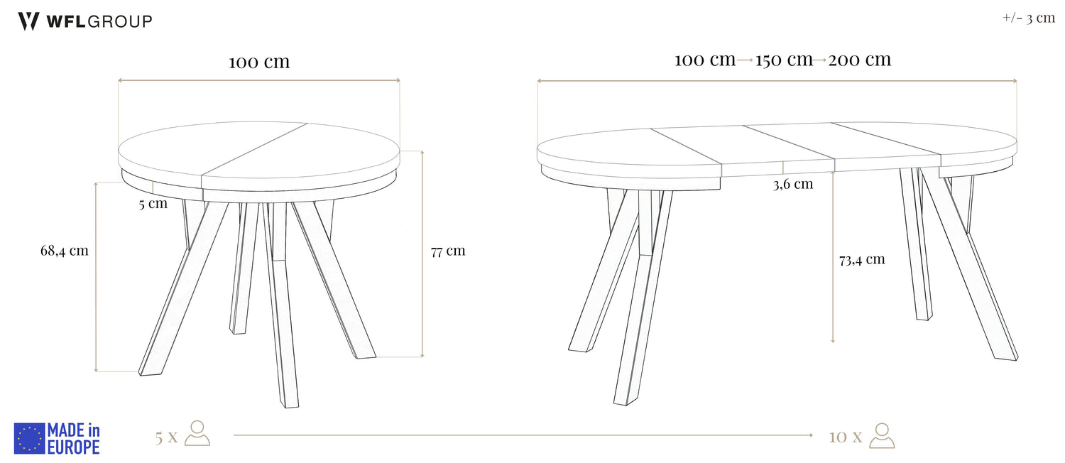 Dieser runde Tisch verbindet minimalistisches Design mit maximaler Funktionalität. Je nach gewählter Variante lässt er sich mühelos ausziehen: von 80 auf 160 cm (bietet damit ausreichend Platz für 4–8 Personen), 90 auf 190 cm (für 5–9 Personen), 100 auf 140 cm (für 5–7 Personen) oder 100 auf 200 cm (für 5–10 Personen). Perfekt für den Alltag, spontane Gäste, Familienfeiern oder entspannte Dinnerabende.