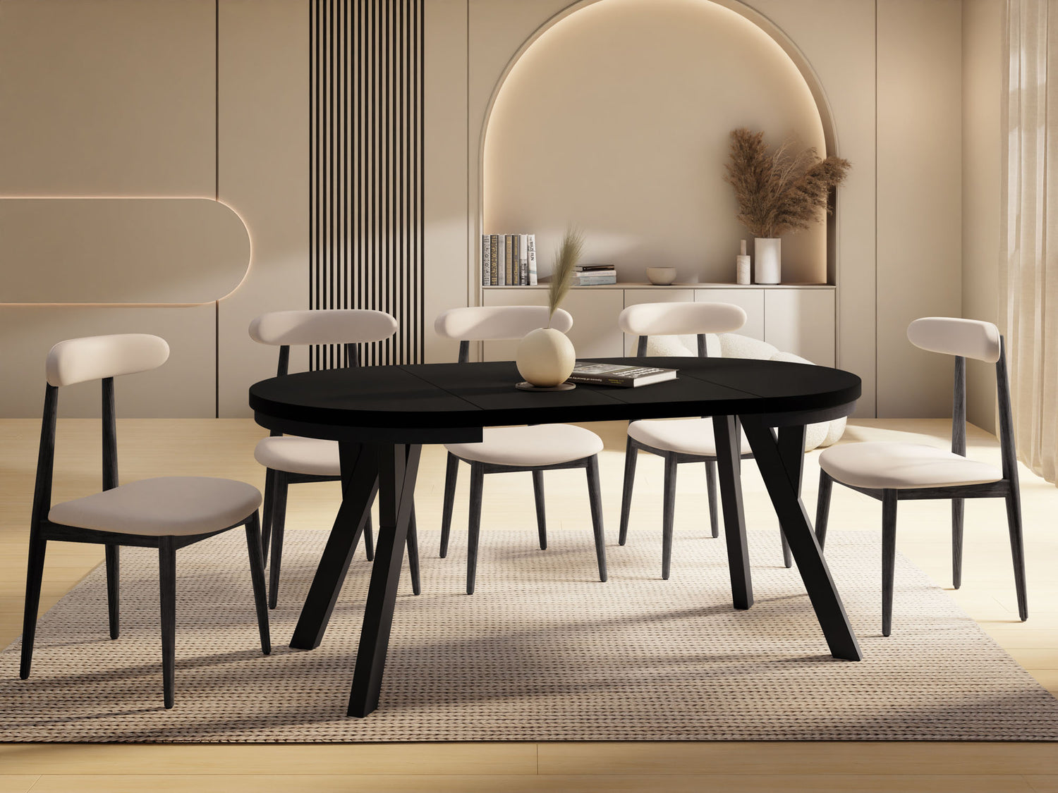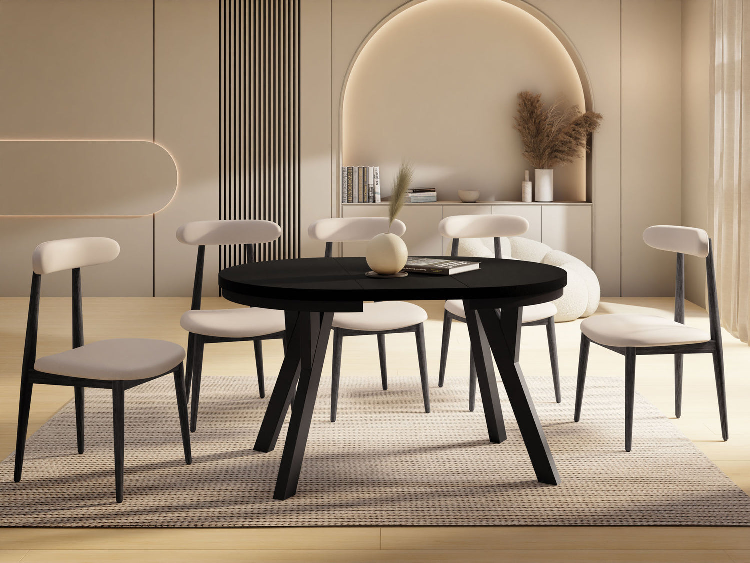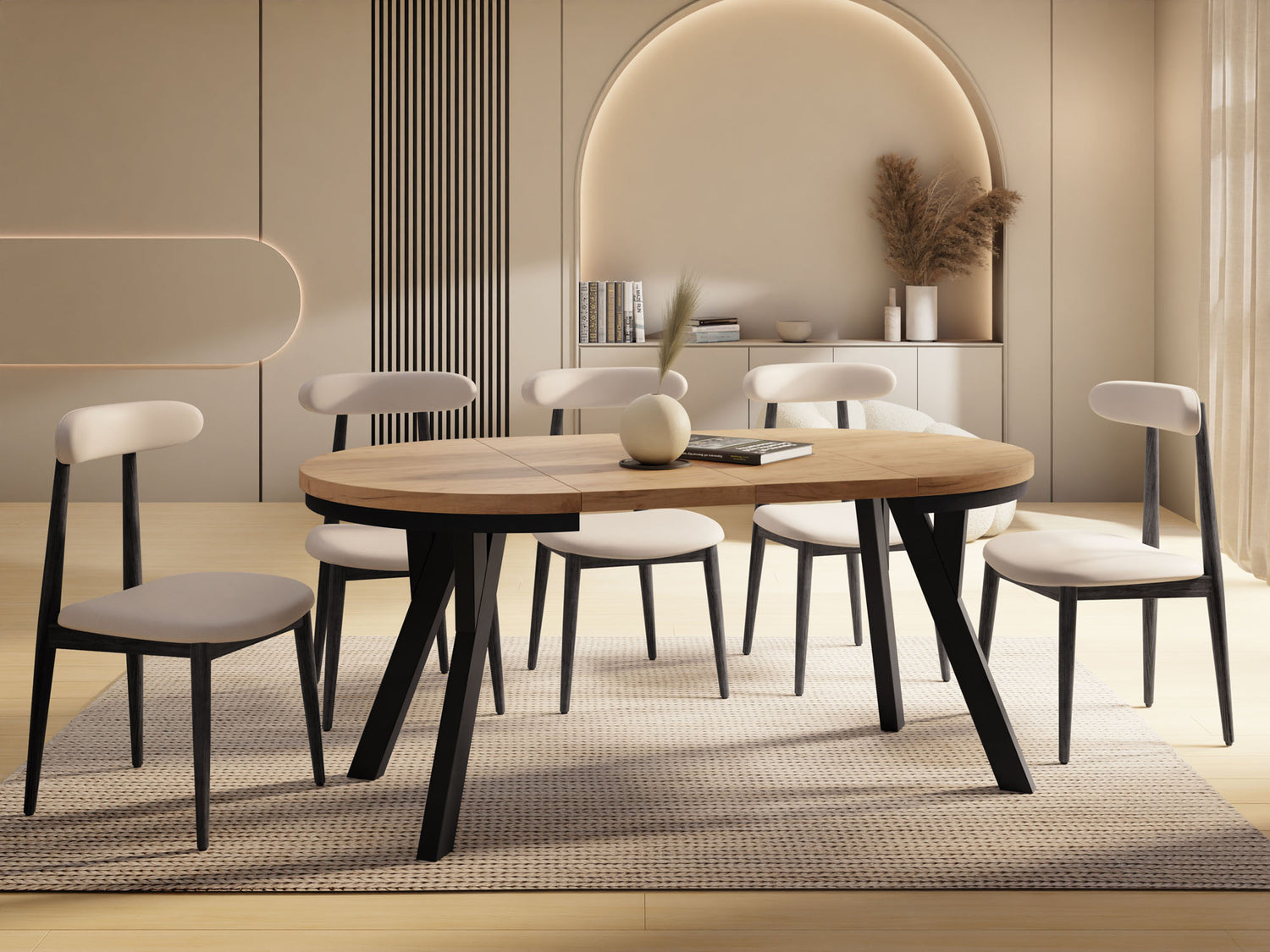 Dieser runde Tisch verbindet minimalistisches Design mit maximaler Funktionalität. Je nach gewählter Variante lässt er sich mühelos ausziehen: von 80 auf 160 cm (bietet damit ausreichend Platz für 4–8 Personen), 90 auf 190 cm (für 5–9 Personen), 100 auf 140 cm (für 5–7 Personen) oder 100 auf 200 cm (für 5–10 Personen). Perfekt für den Alltag, spontane Gäste, Familienfeiern oder entspannte Dinnerabende.