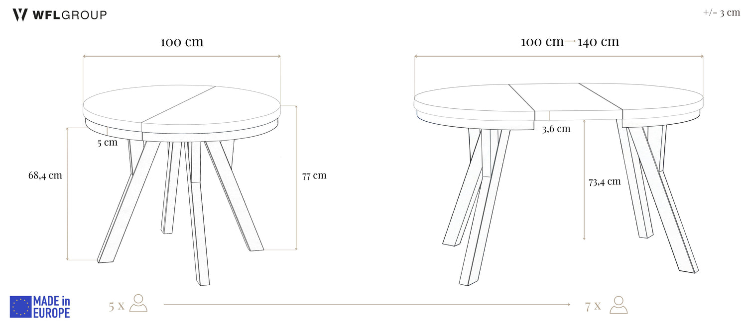 100 cm – Durchmesser: 100 cm, Höhe: 77 cm (Platte ausziehbar auf 140 cm, zusätzliche Tischplatte 1 x 40 cm)