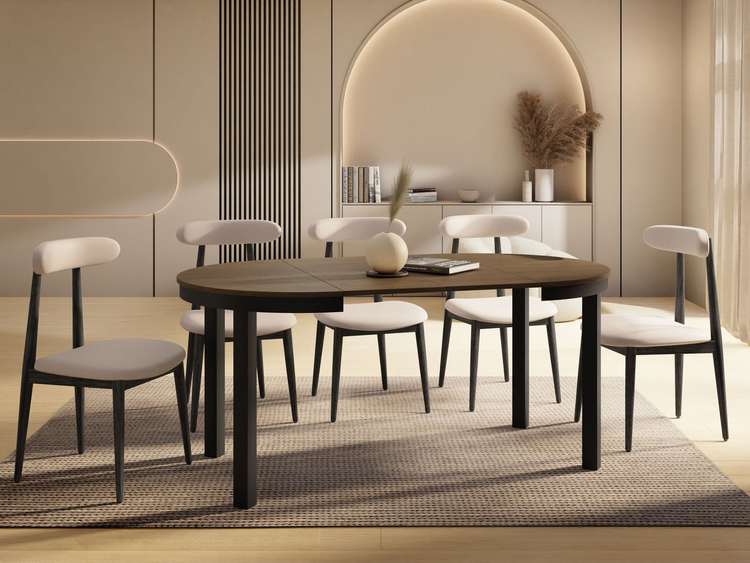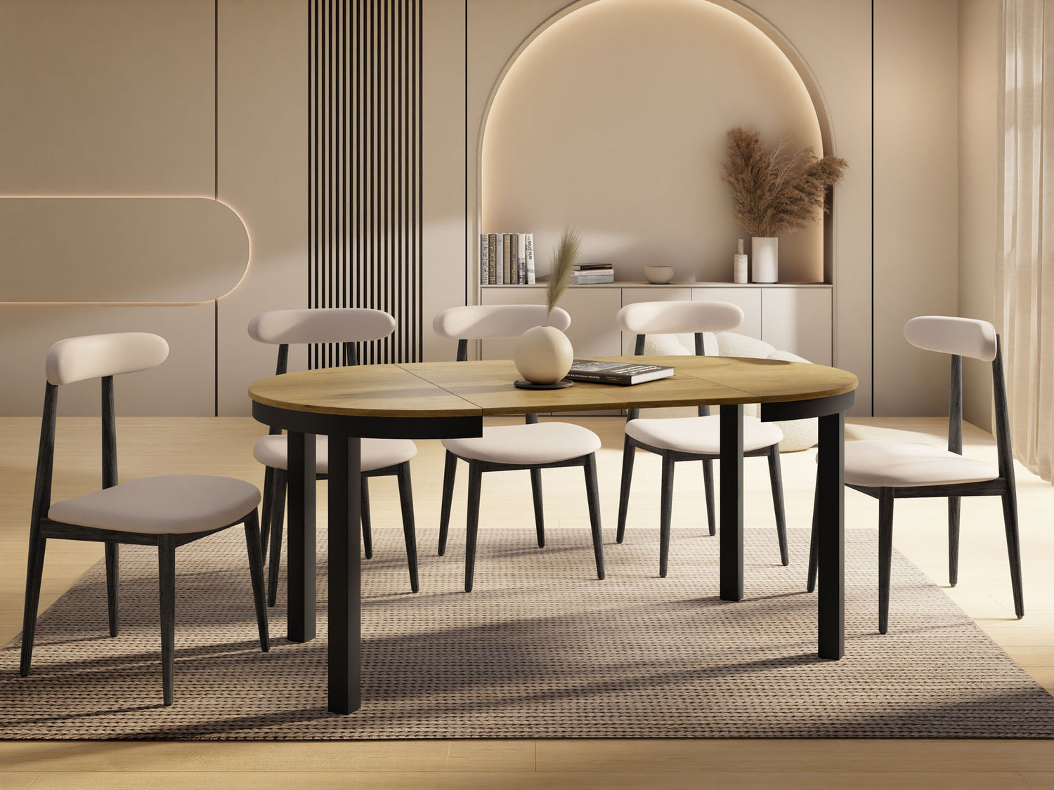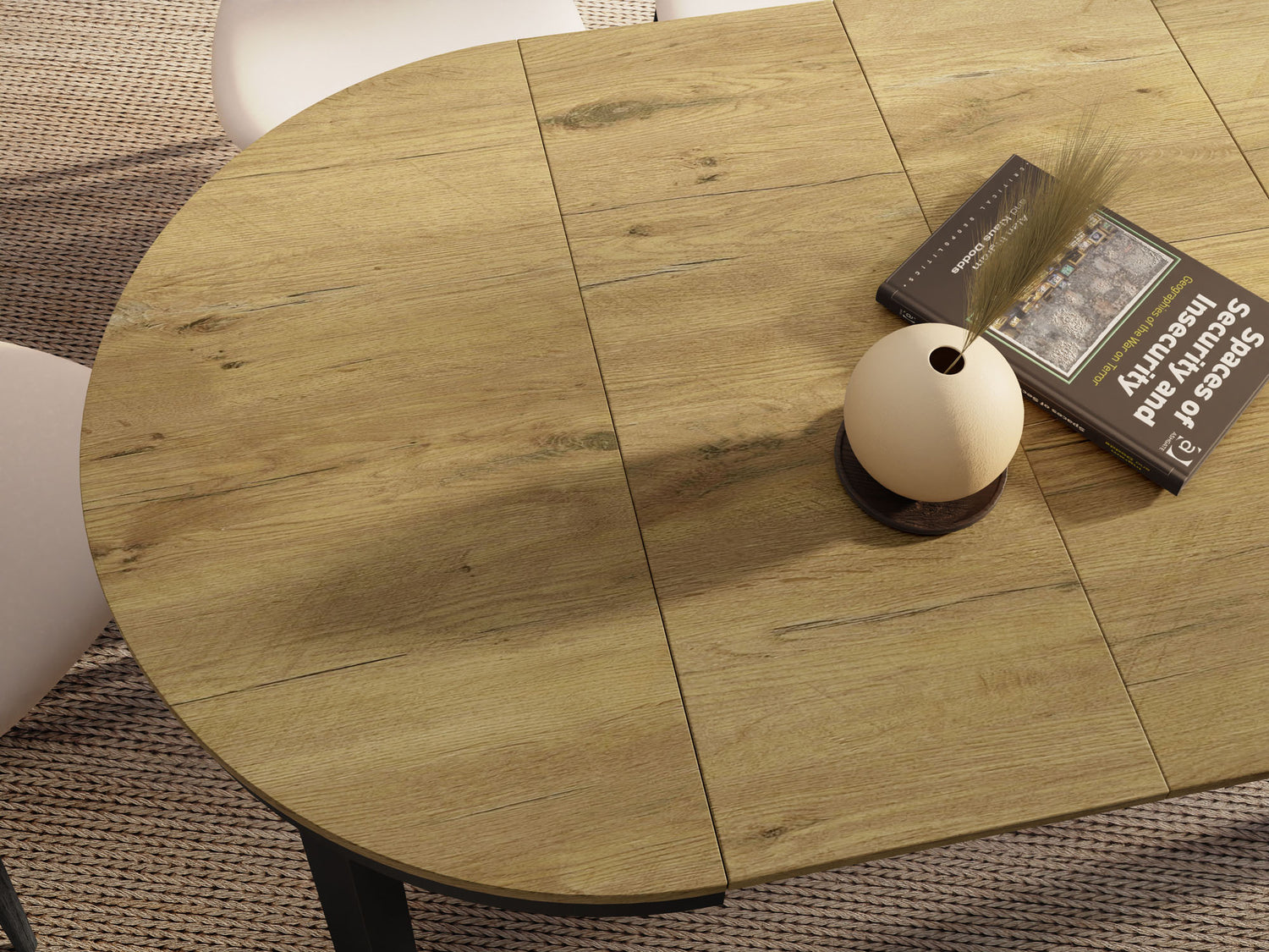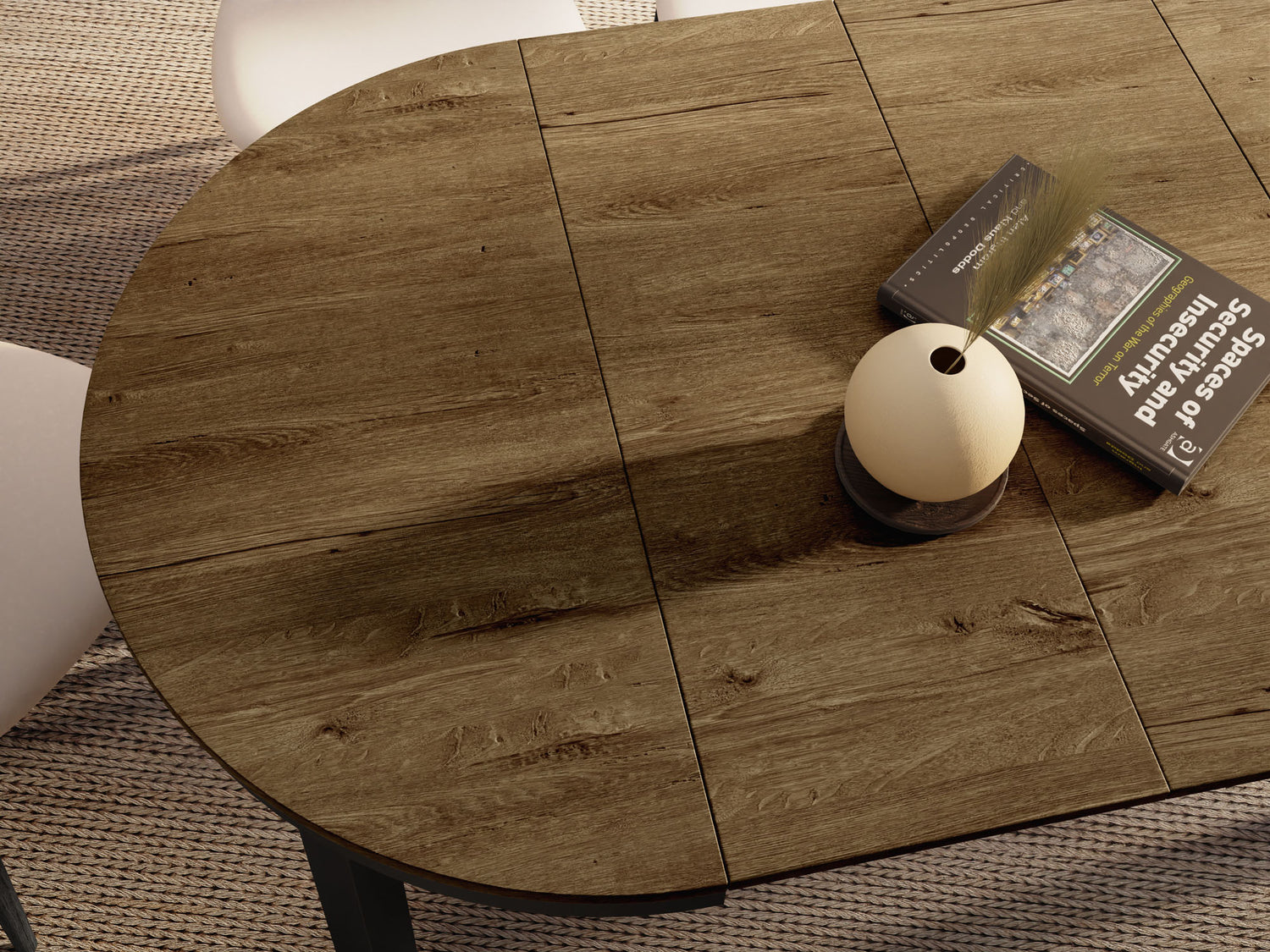 Corin ist ein eleganter, runder Esstisch mit durchdachtem Design und praktischer Ausziehfunktion. Die Kombination aus stilvoller Tischplatte und stabilem Metallgestell macht ihn zum funktionalen Highlight für moderne Essbereiche – ob skandinavisch, industriell oder klassisch.