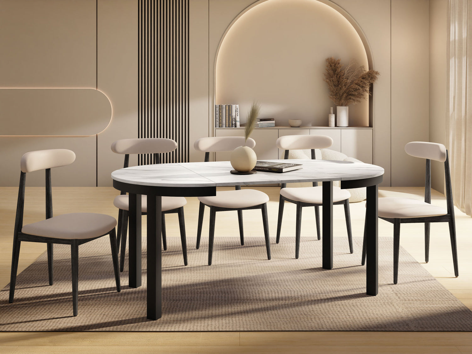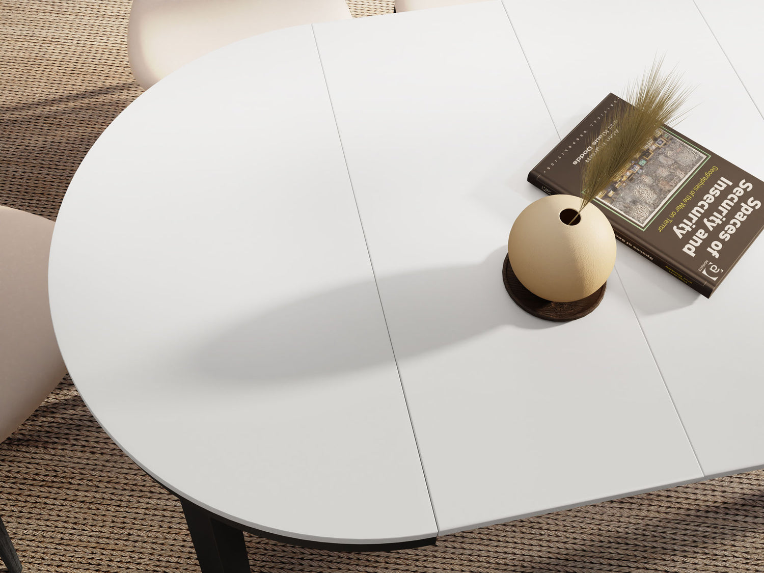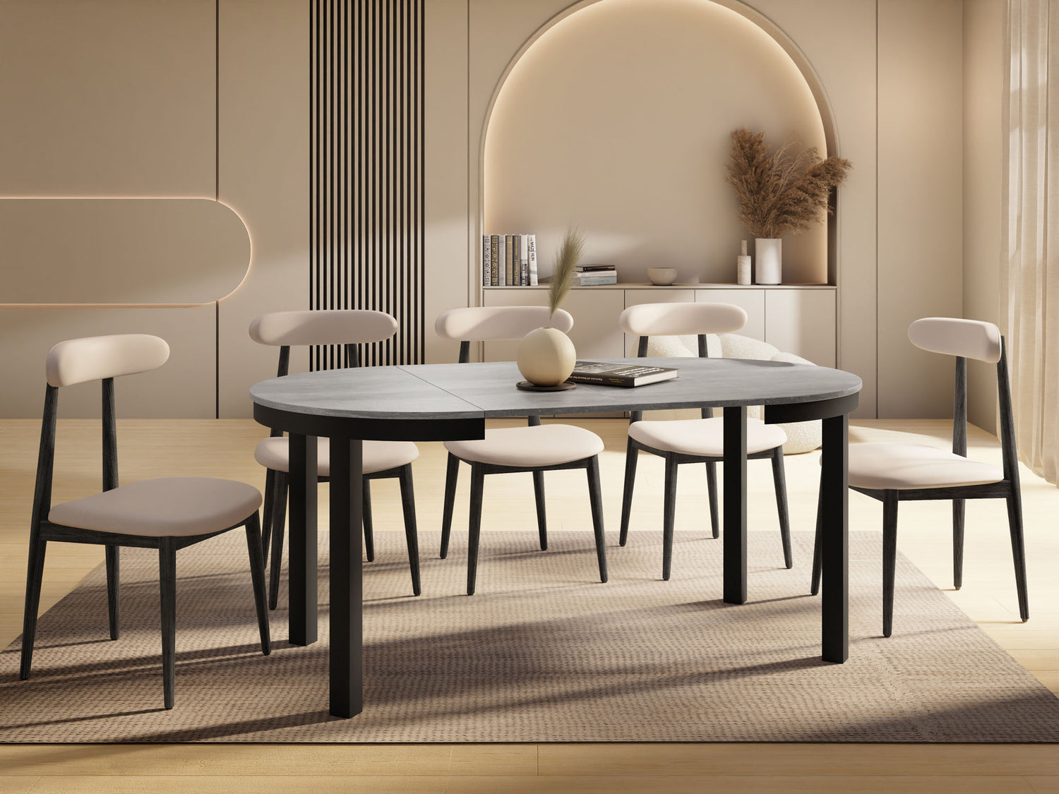 Corin ist ein eleganter, runder Esstisch mit durchdachtem Design und praktischer Ausziehfunktion. Die Kombination aus stilvoller Tischplatte und stabilem Metallgestell macht ihn zum funktionalen Highlight für moderne Essbereiche – ob skandinavisch, industriell oder klassisch.