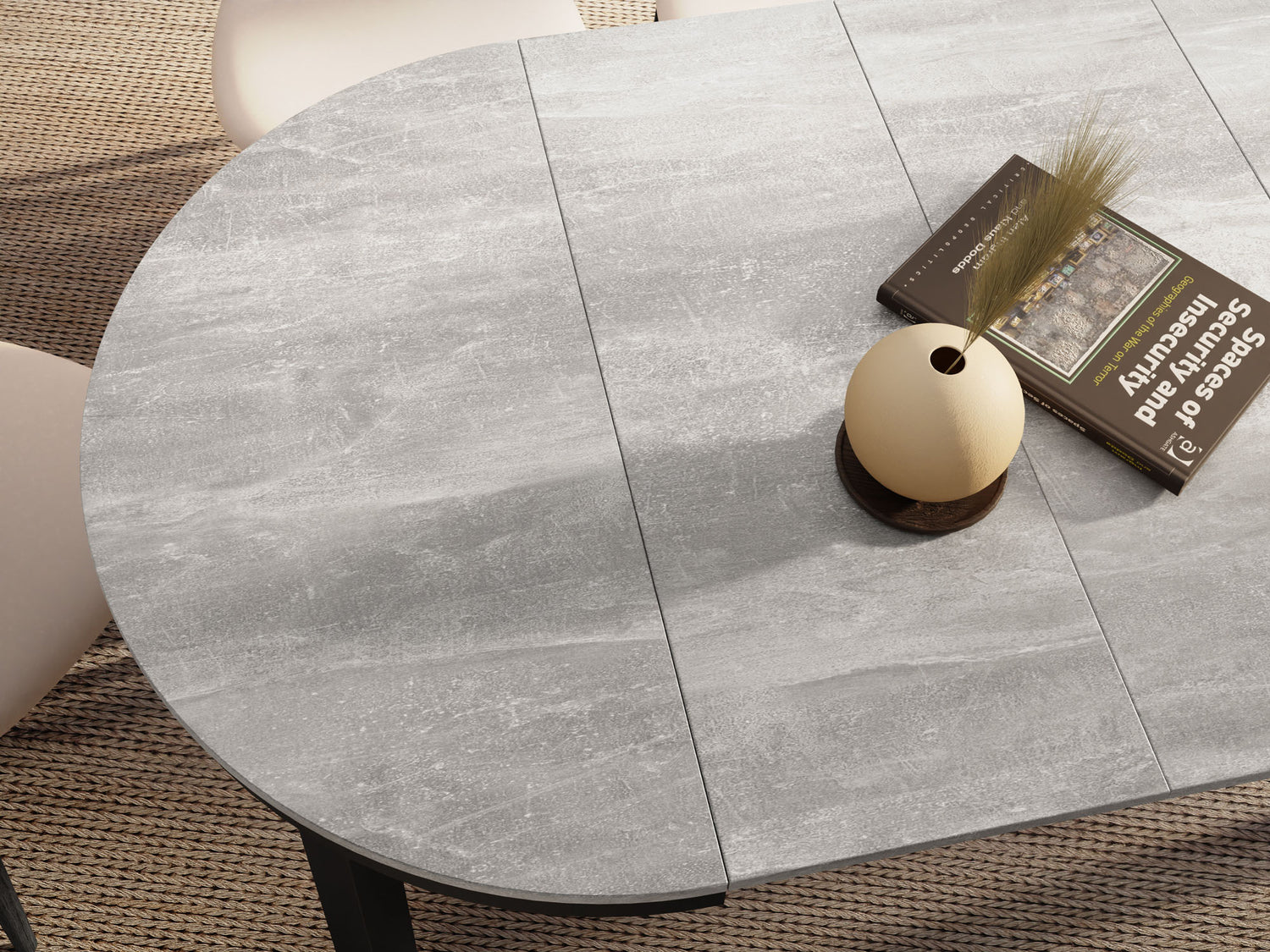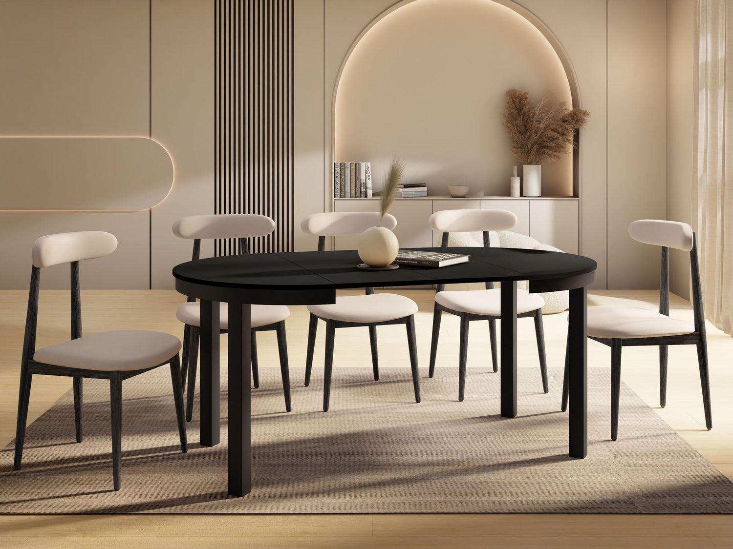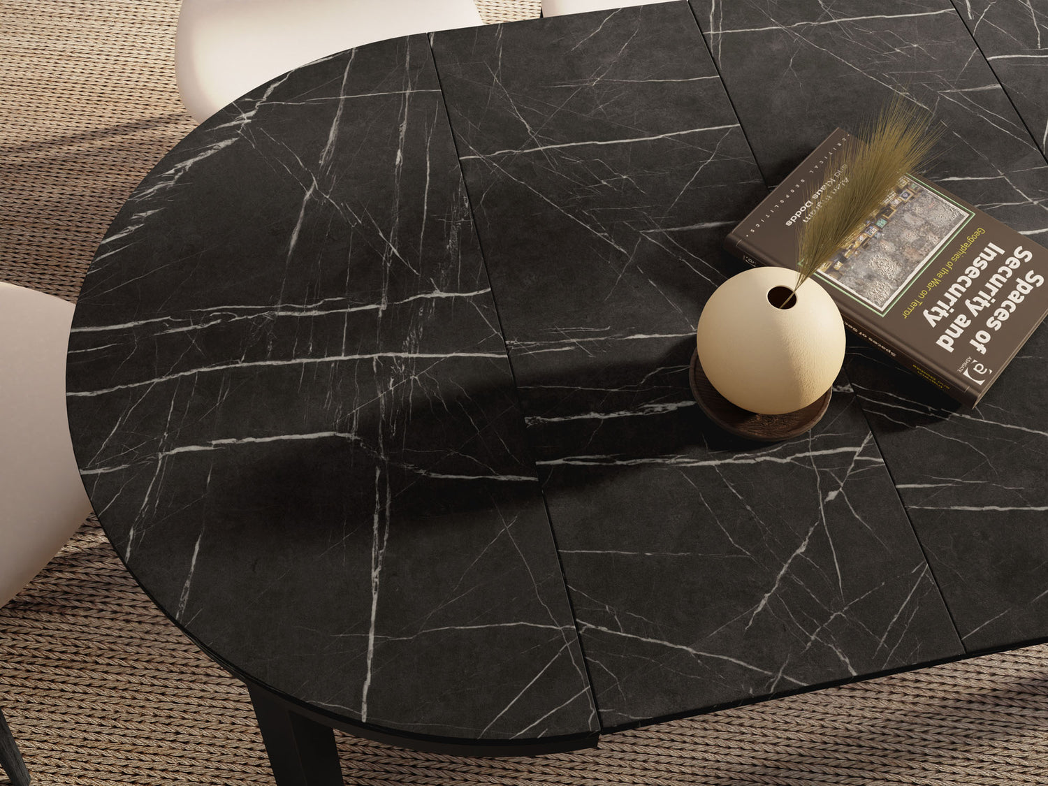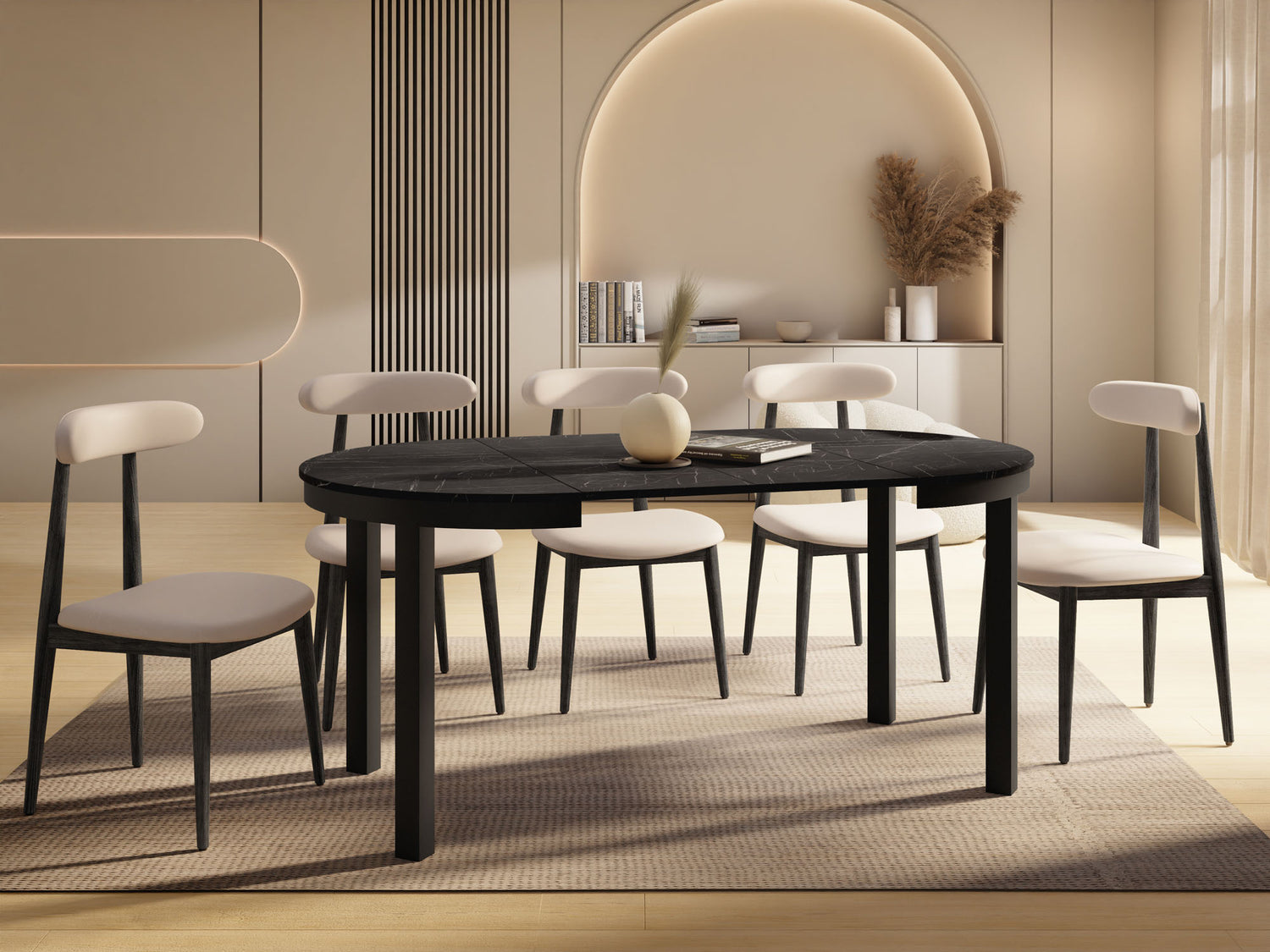 Corin ist ein eleganter, runder Esstisch mit durchdachtem Design und praktischer Ausziehfunktion. Die Kombination aus stilvoller Tischplatte und stabilem Metallgestell macht ihn zum funktionalen Highlight für moderne Essbereiche – ob skandinavisch, industriell oder klassisch.