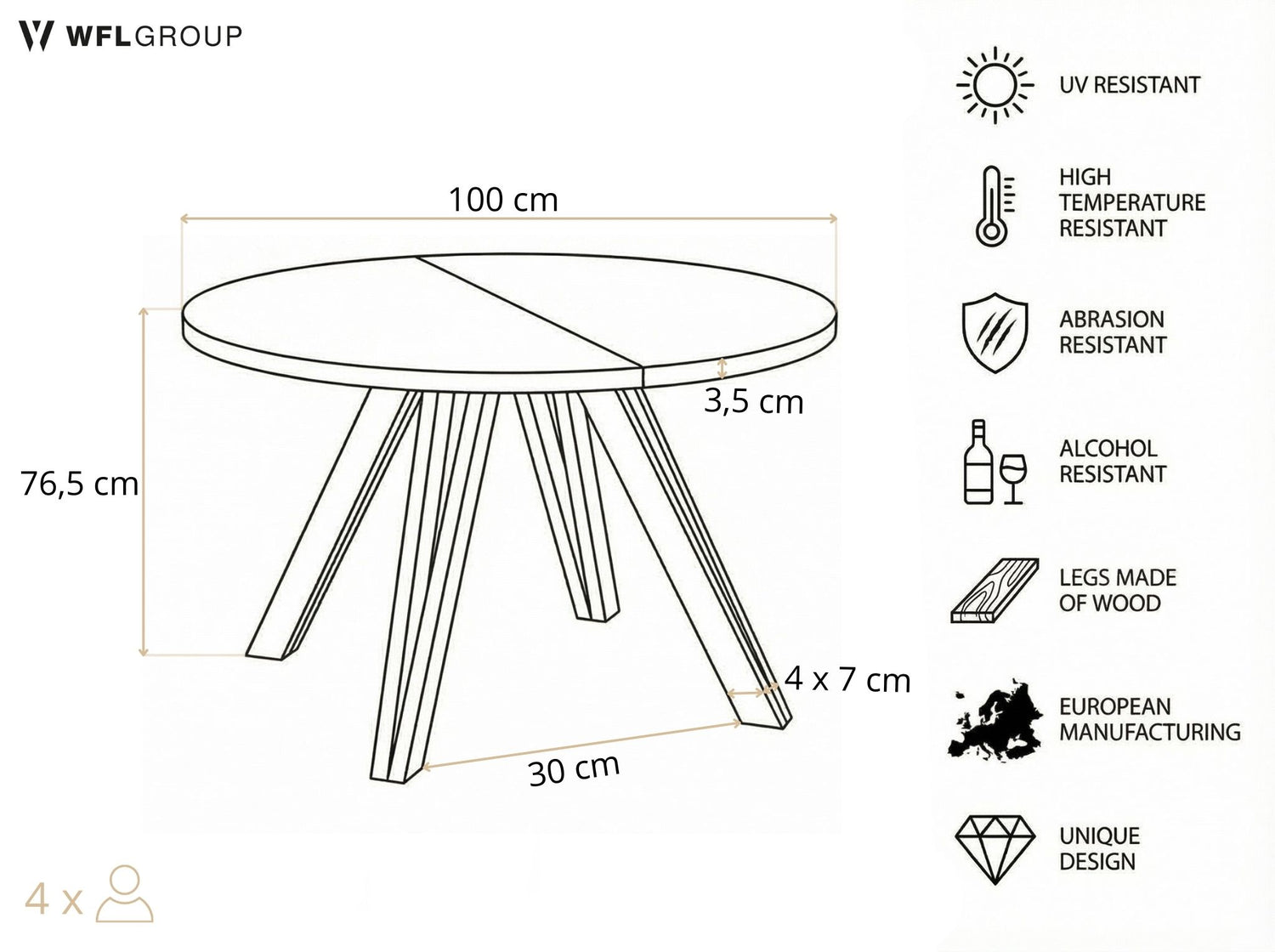 100 cm – Runder Tisch, nicht ausziehbar, Durchmesser: 100 cm, Höhe: ca. 77 cm