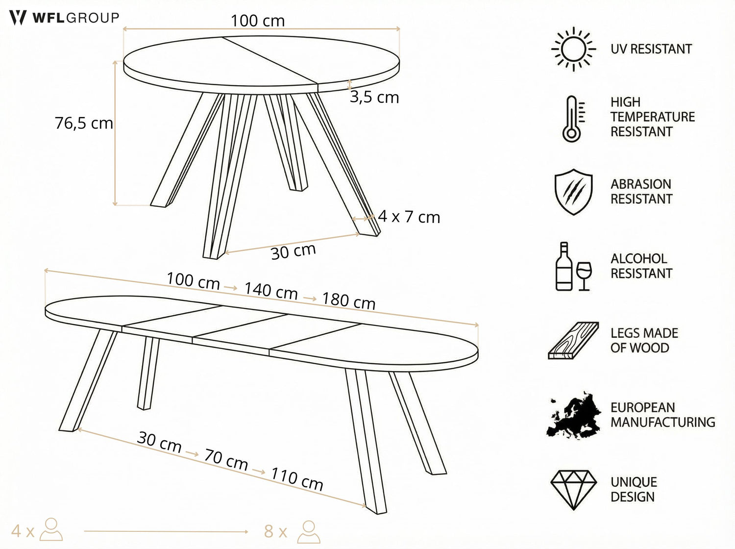 FLEXIBEL & FUNKTIONAL – Erhältlich in 3 Varianten: 100 cm (nicht ausziehbar, ideal für 4 Personen), 100–140 cm und 100–180 cm (ausziehbar, für bis zu 6 bzw. 8 Personen) – mehr Platz im Handumdrehen für Alltag, Familienessen und Gäste