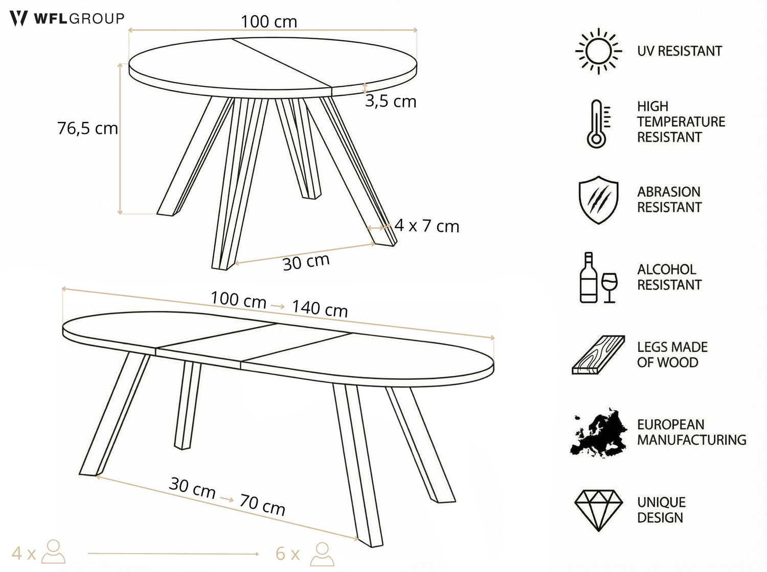 - Stabile Konstruktion mit massiven Holzbeinen für sicheren Stand, auch in ausgezogenem Zustand