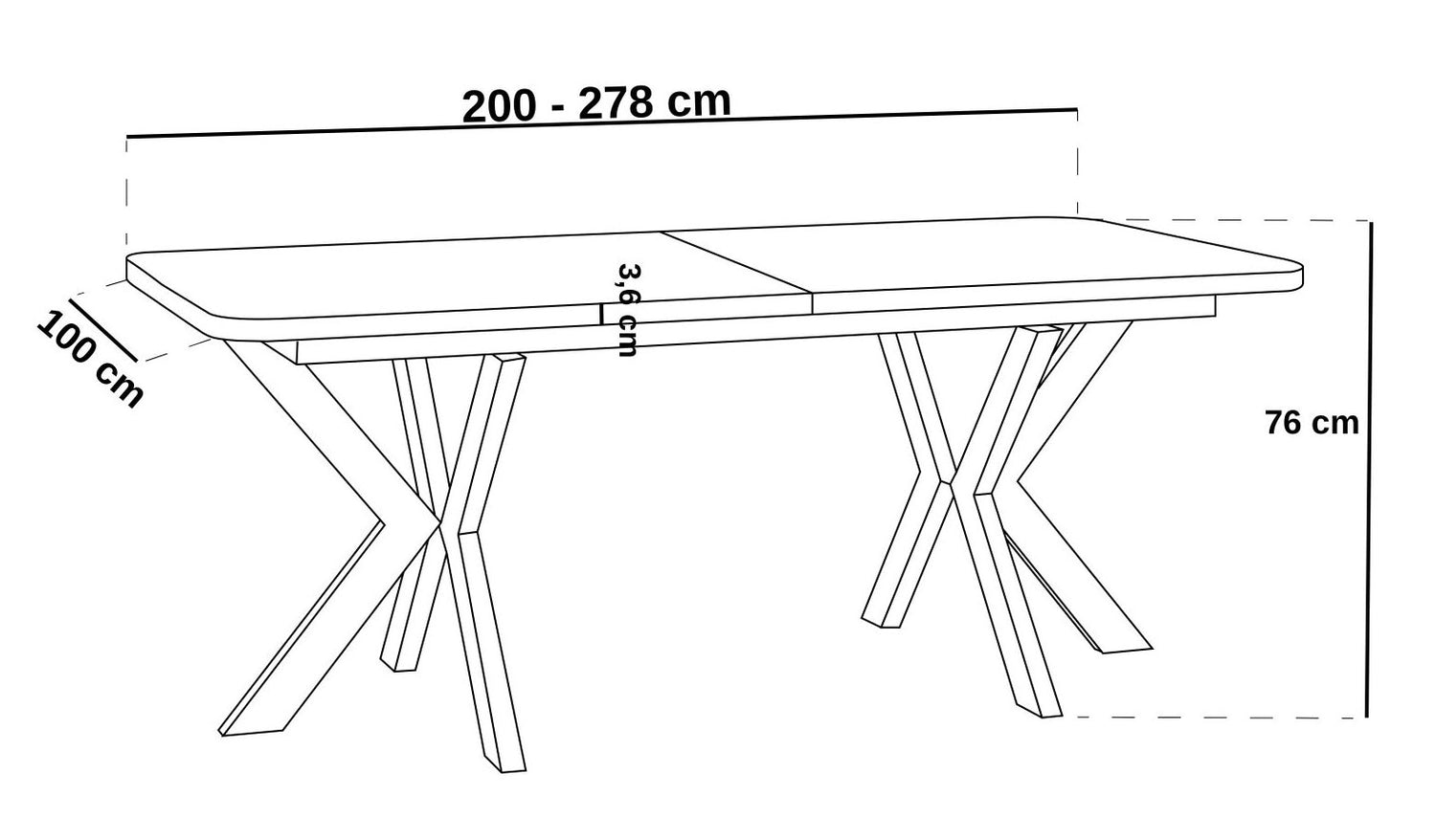 Breite 100 cm, Länge 200cm, Höhe 76 cm. - Die Tischplatte lässt sich auf 276 cm ausziehen.