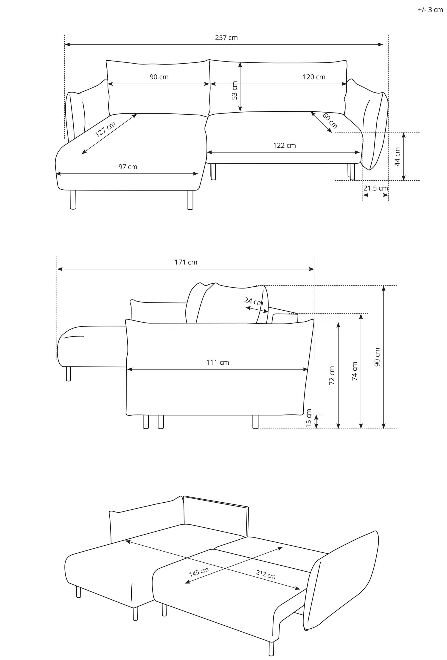 - 257 cm Breite x 171 cm Länge x 90 cm Höhe