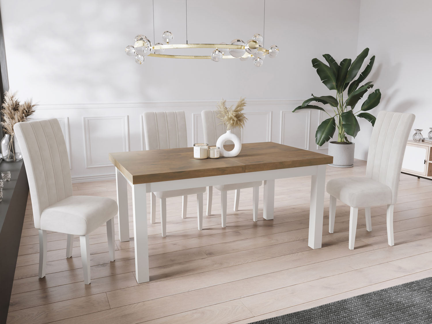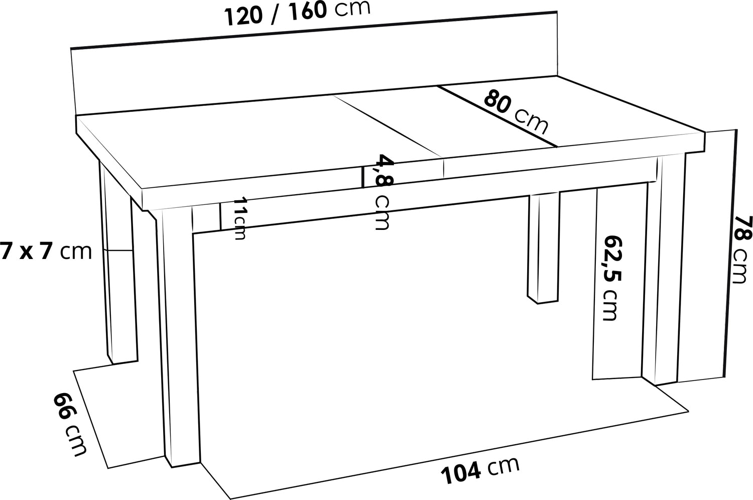120 x 80 cm, Höhe 75 cm, Tischplatte bis 160 cm ausziehbar (1x Einlegeplatte 40 cm)