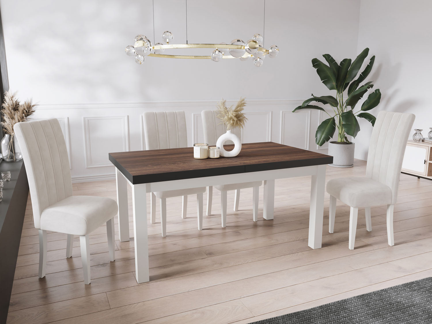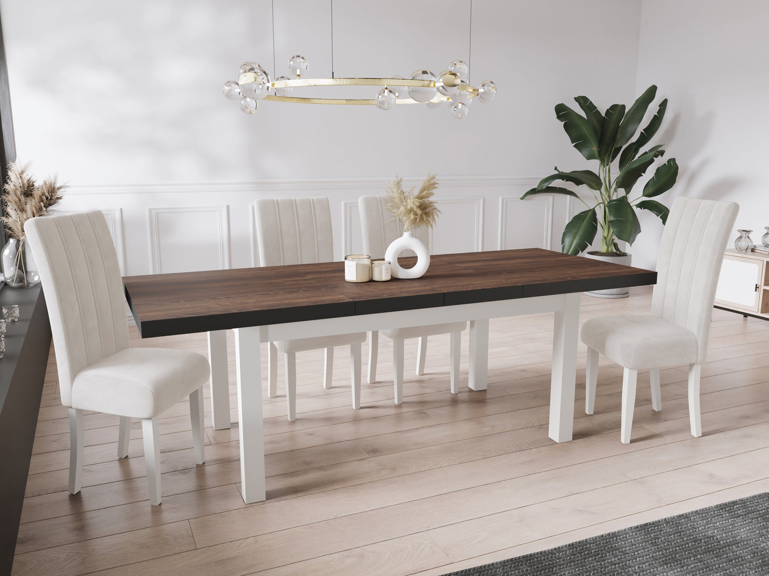 160 x 90 cm, Höhe 75 cm, Tischplatte bis 210 cm ausziehbar (1x Einlegeplatte 50 cm)