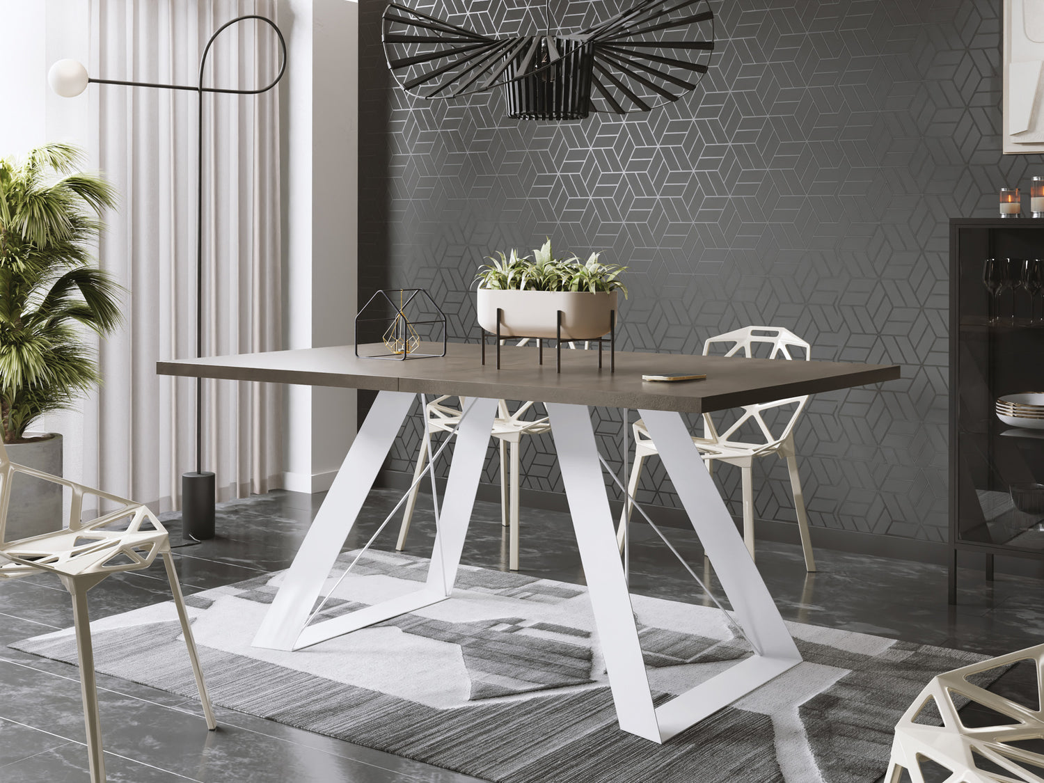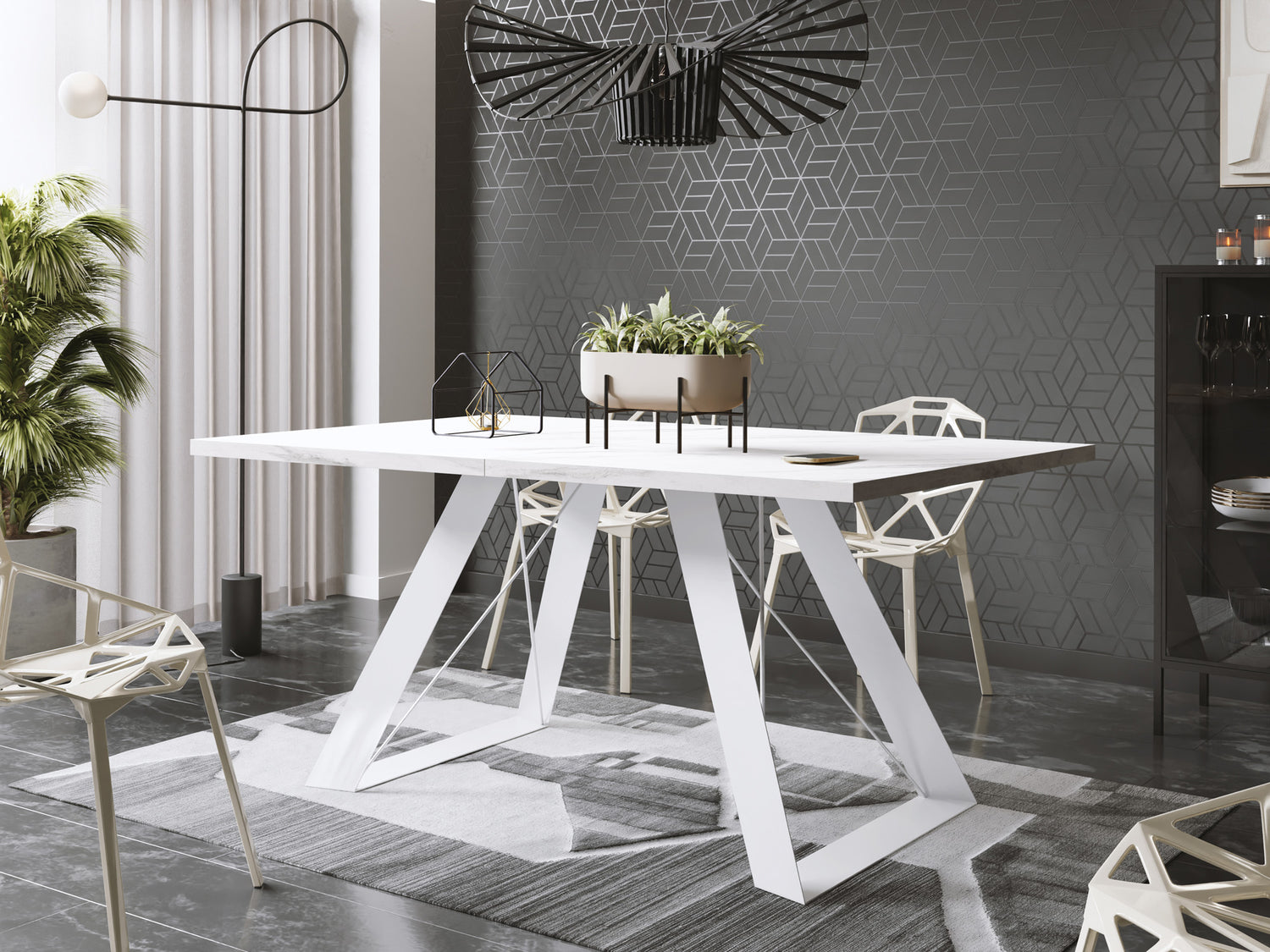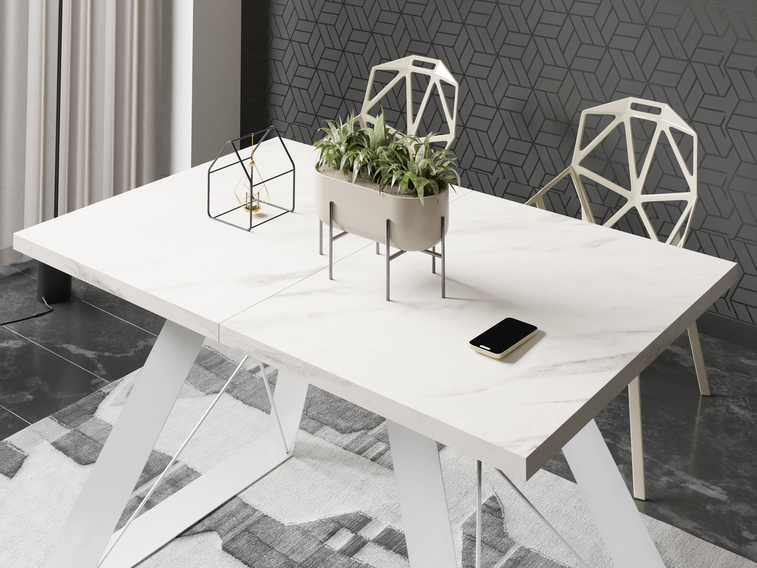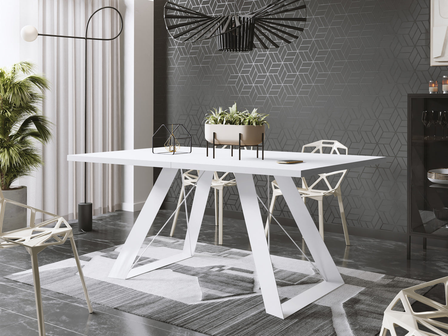 Esstisch Colter Weiß im Modern Stil, Rechteckiger Tisch – Ausziehbar – Pulverbeschichtete Weiße Metallbeine – Made in EU