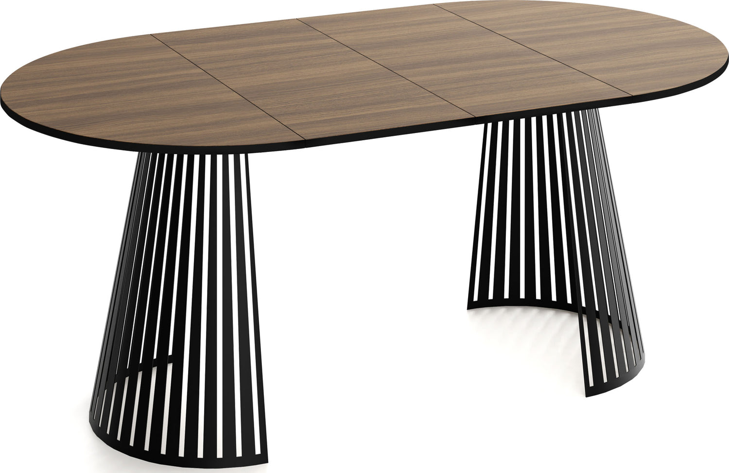 Der Esstisch Naro kombiniert zeitgemäßes Design mit praktischer Erweiterbarkeit. Die runde Tischplatte lässt sich im Handumdrehen zu einer großzügigen ovalen Tafel ausziehen – perfekt für gesellige Abende. Das auffällige, skulpturale Gestell aus schwarzen Metallstreben verleiht dem Tisch eine moderne, architektonische Note und sorgt gleichzeitig für Stabilität und Beinfreiheit.