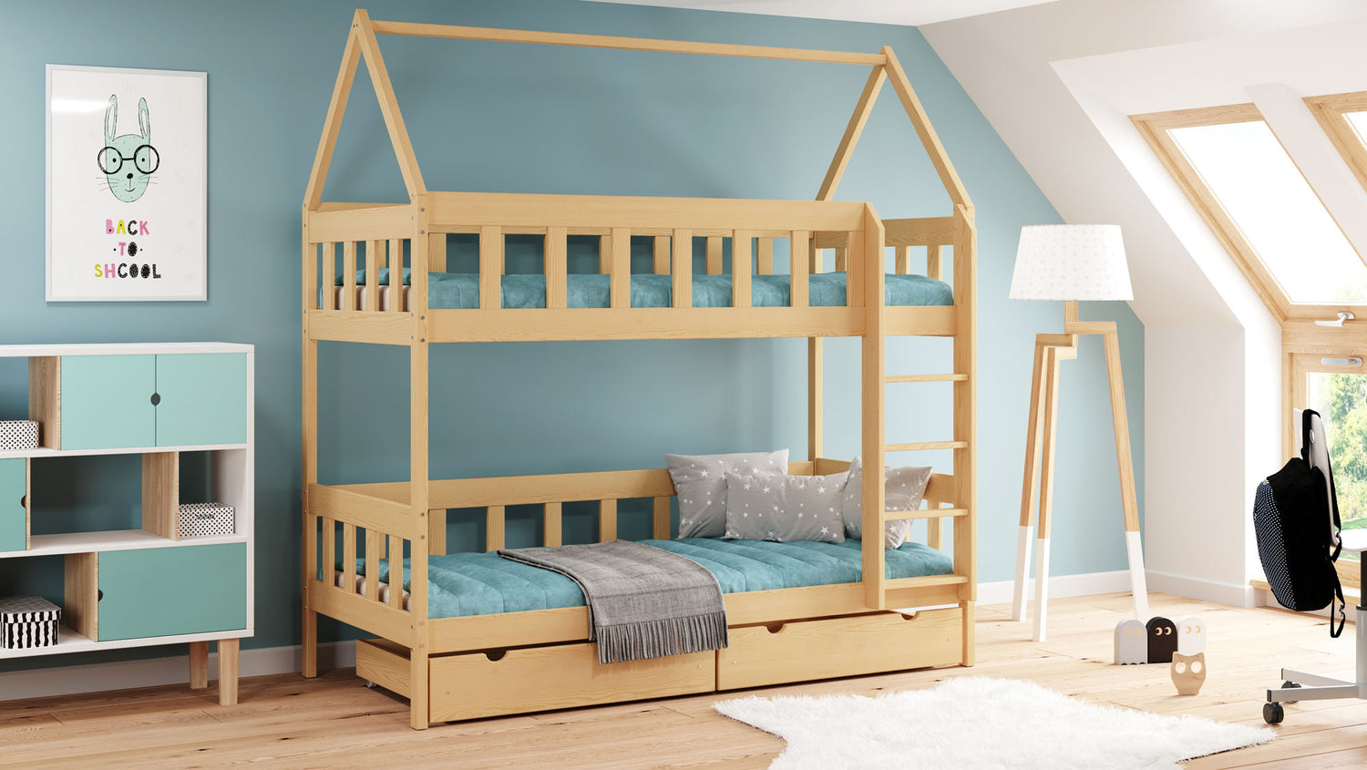 ROBUSTES ETAGENBETT FÜR KINDER – Ein bezauberndes Hochbett in Form eines Hauses – perfekt für fantasievolle Kinderzimmer! Gefertigt aus massivem Holz, überzeugt es durch Stabilität und zeitloses Design. Die offene Dachkonstruktion schafft eine gemütliche Schlafumgebung und regt gleichzeitig zum Spielen an. Passend für Matratzen in 80x160, 80x180, 90x190 oder 90x200 cm