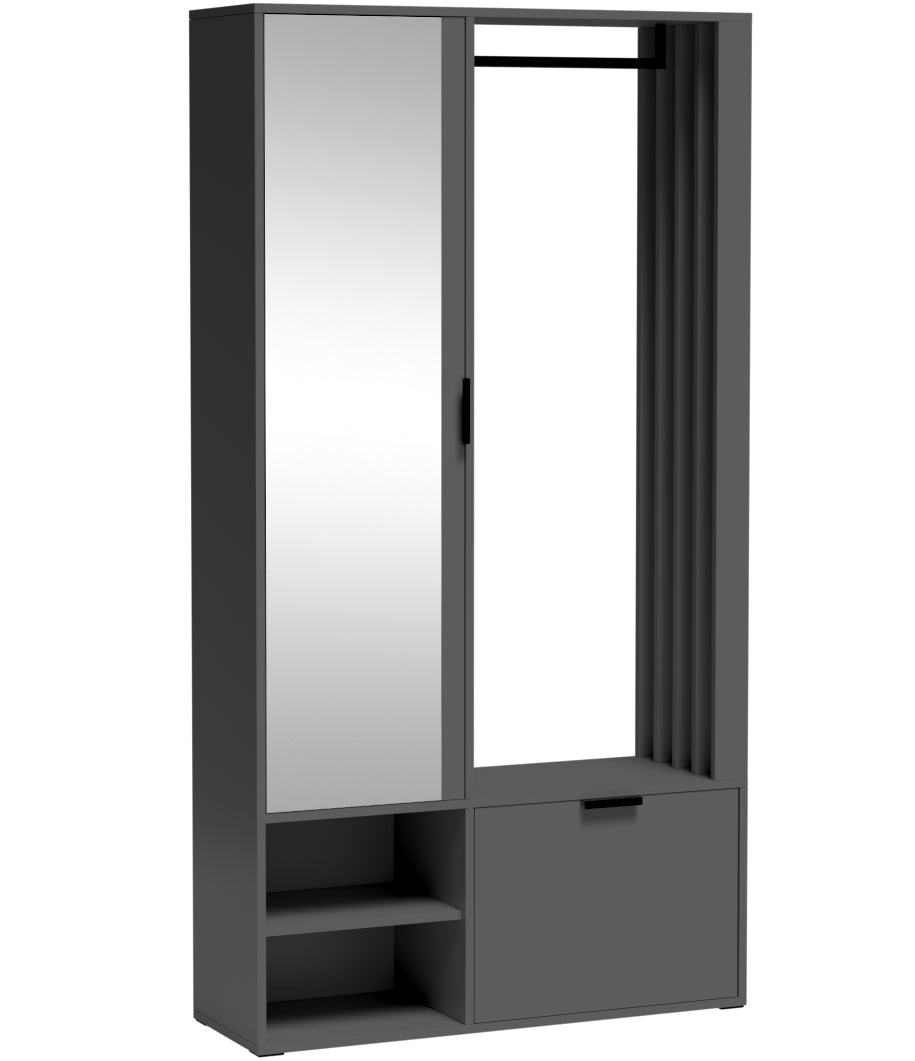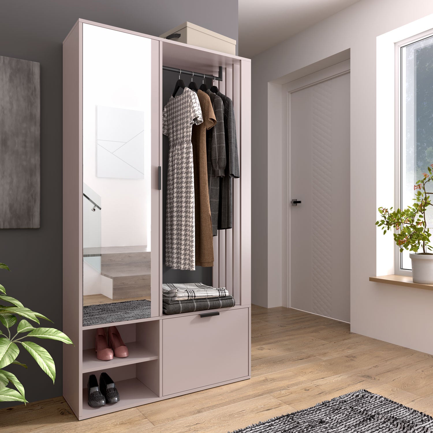 Dank der integrierten Stauraumelemente wie Spiegel, Sitzbank, Schuhablage und Kleiderstange ist das Möbelstück nicht nur optisch ein Highlight, sondern auch eine praktische Lösung für den Alltag.