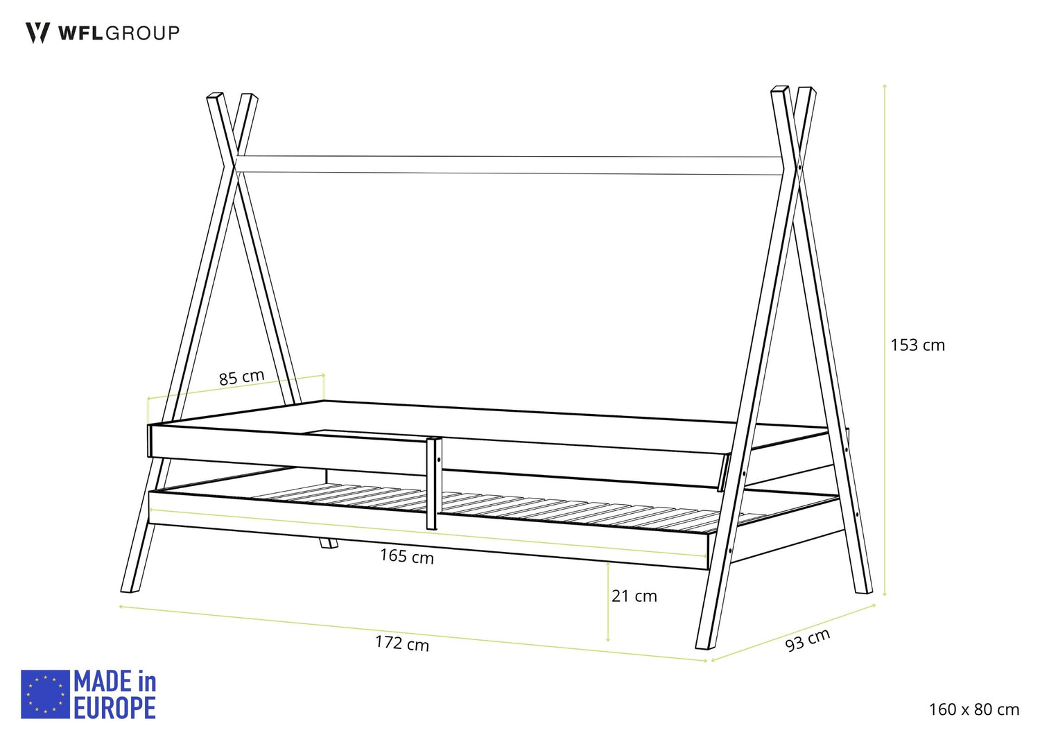 - 160 x 80 cm – Länge: 172 cm, Breite: 93 cm, Höhe: 153 cm
