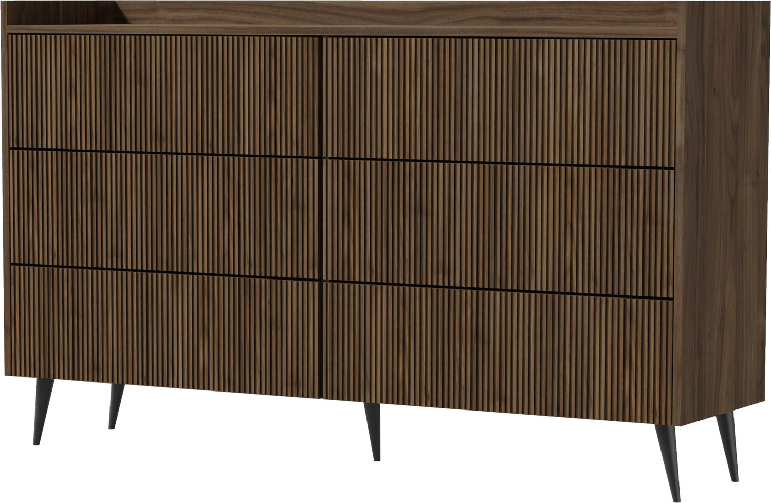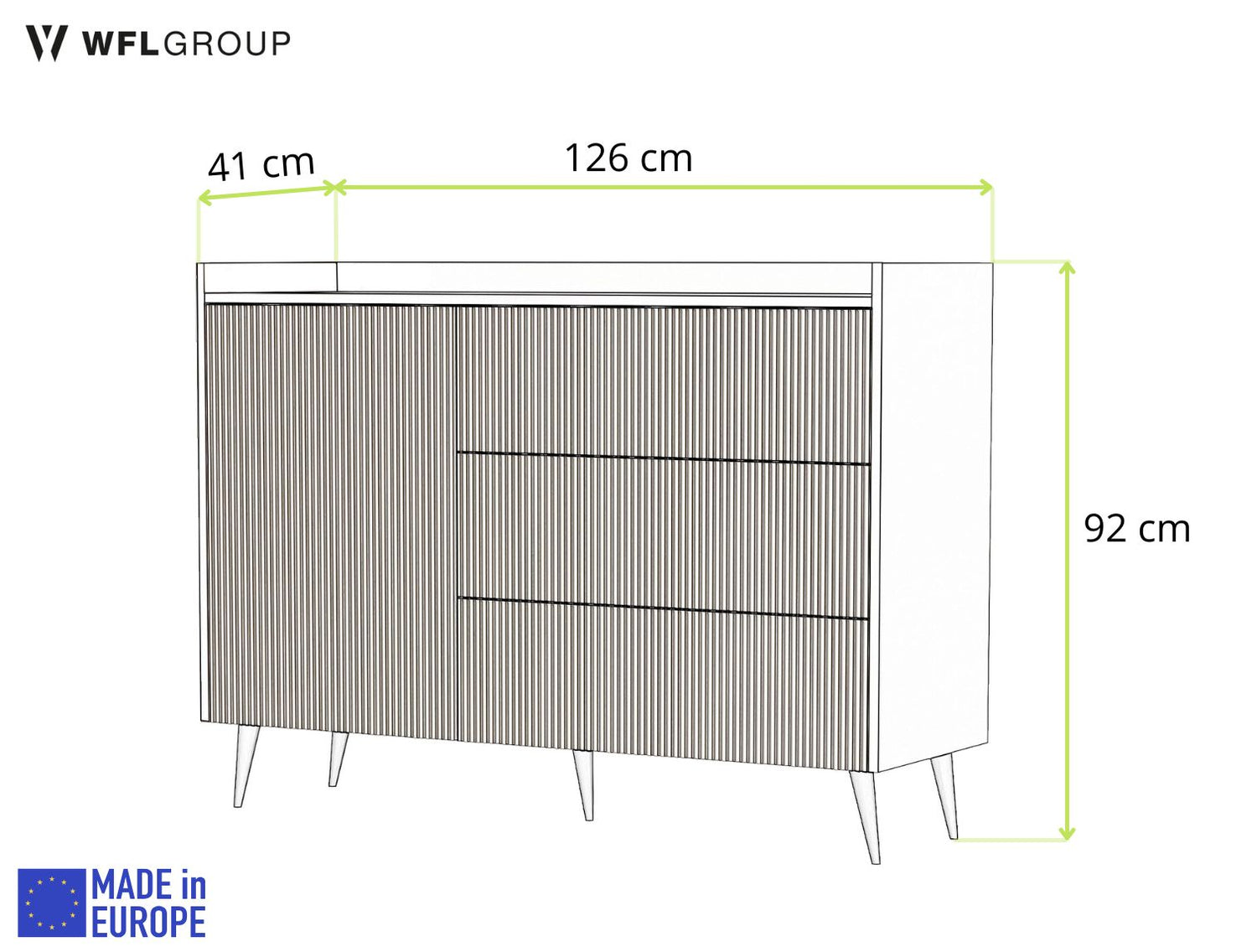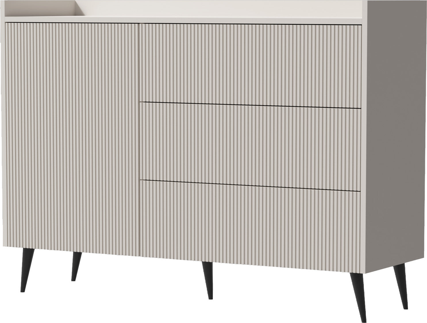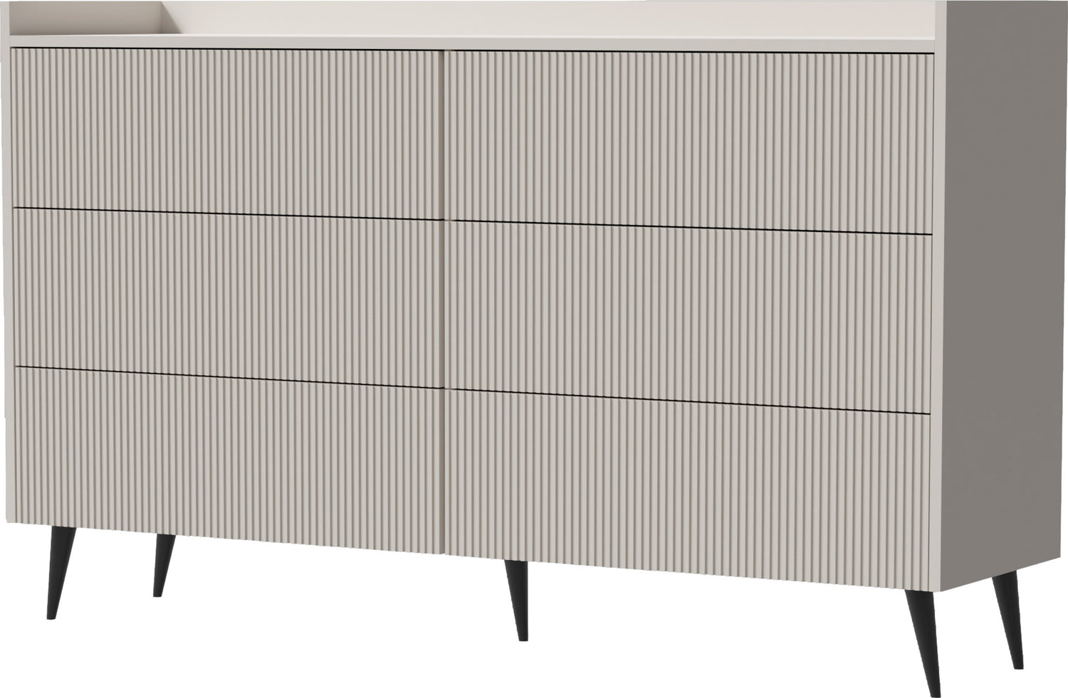 Vertikale Rillenfronten, grifflose Push-to-Open-Türen und 15 cm hohe Metallfüße verleihen den Kommoden eine klare Industrial-Skandi-Optik. Zwei Trendfarben – warmes Walnuss-Braun und sanftes Beige-Cashmere – fügen sich harmonisch in Loft-, skandinavische und minimalistische Einrichtungen ein.