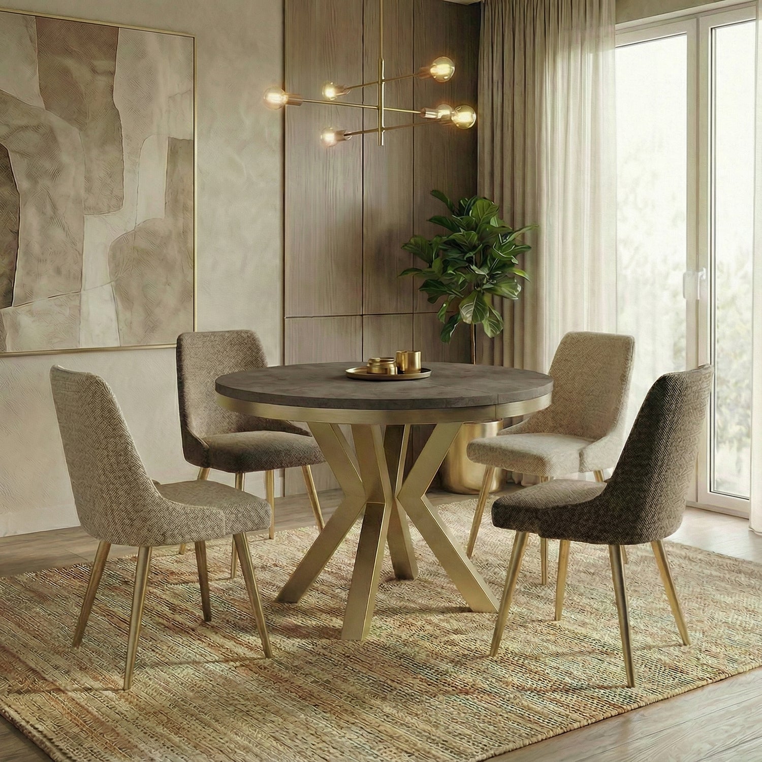 Eleganz und Funktionalität in einem Der Clara Esstisch vereint modernes Design mit praktischer Funktionalität. Die runde Form und das markante X-Gestell in Goldenen schaffen einen zeitlosen Look, der sich harmonisch in Ihr Zuhause einfügt.