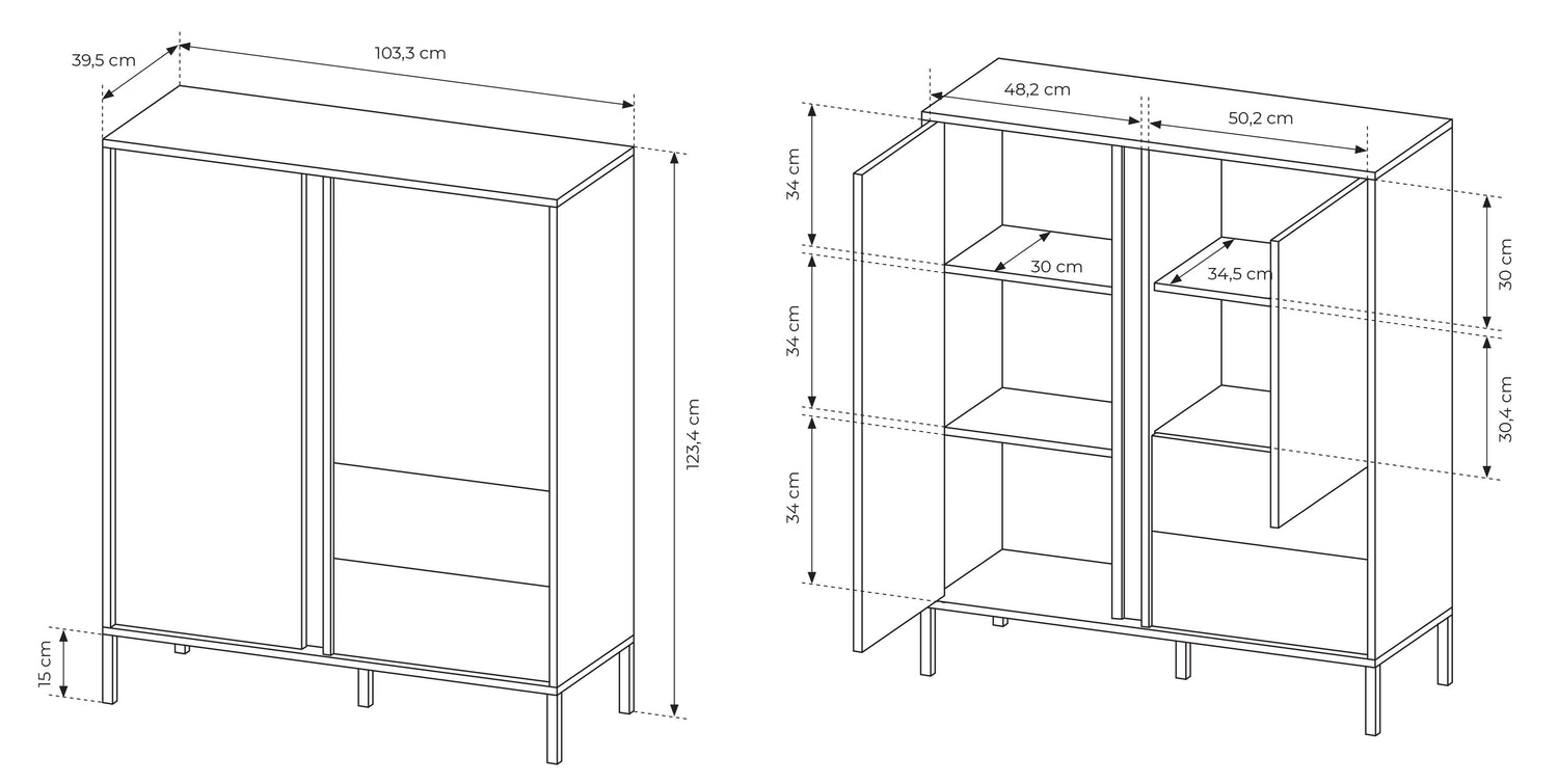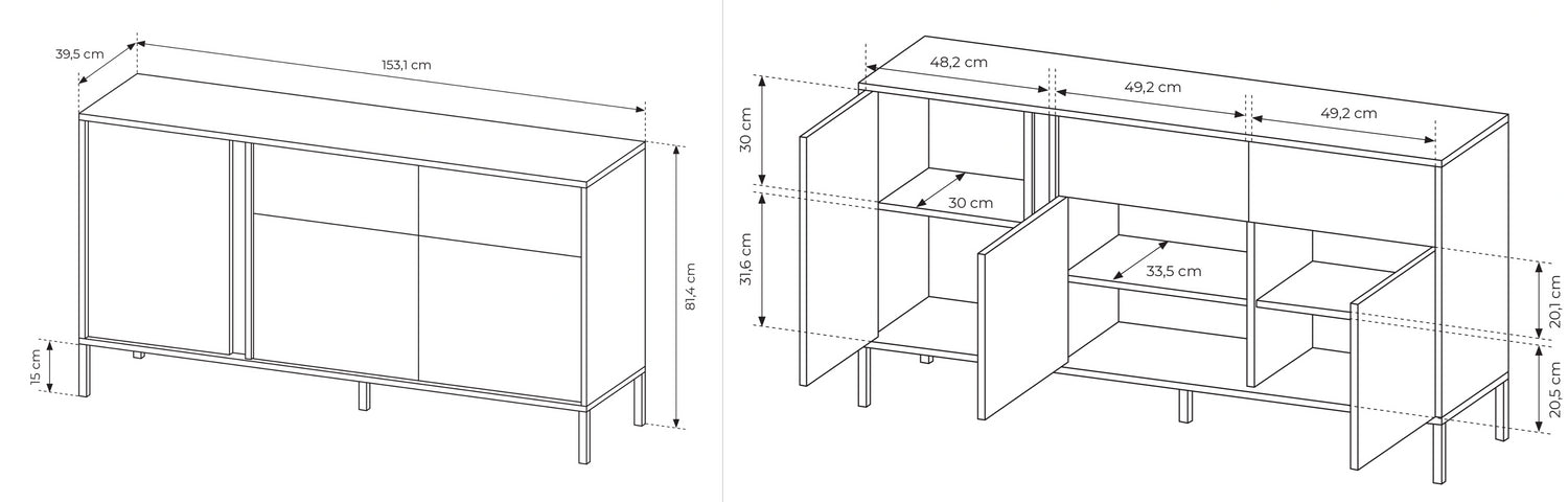 Je nach Modell bieten die Möbel eine durchdachte Kombination aus Türen, Schubladen oder beidem – ideal für Geschirr, Deko, Technik oder Textilien. Schwarze Metallbeine sorgen für optische Leichtigkeit und Stabilität.