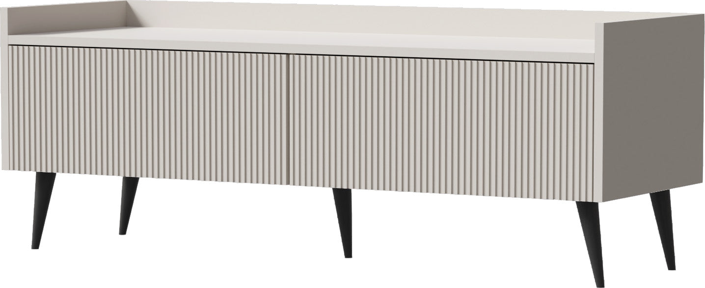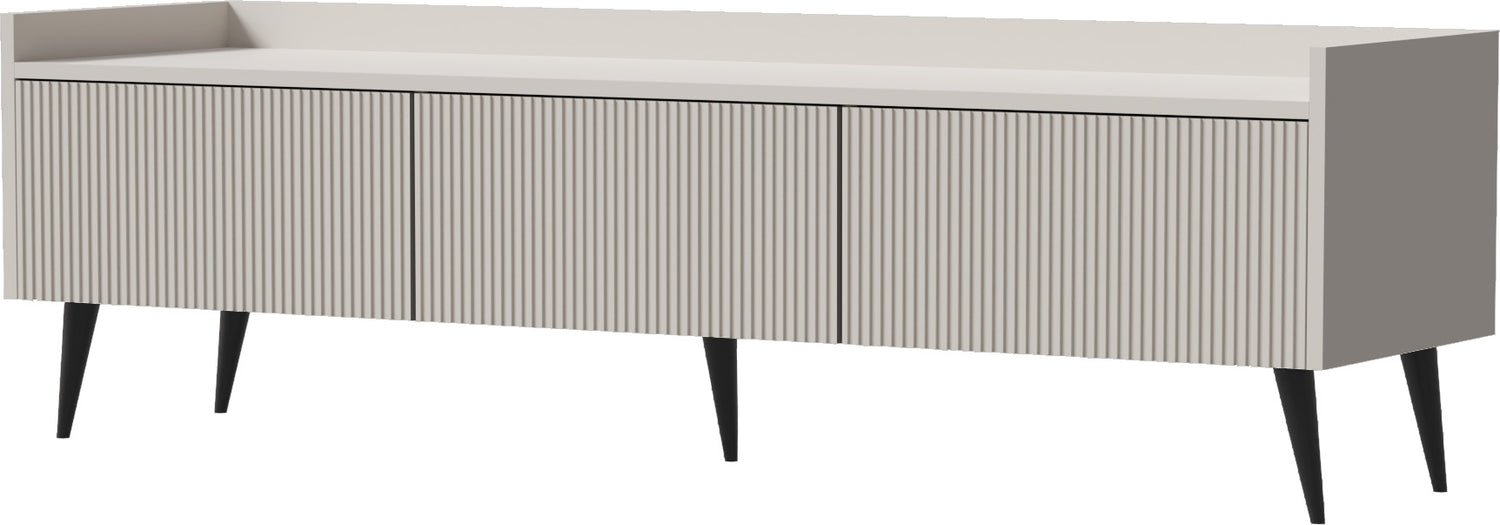 Vertikale Rillenfronten, grifflose Push-to-Open-Türen und 15 cm hohe Metallfüße verleihen den TV-Lowboards eine klare Industrial-Skandi-Optik. Zwei Trendfarben – warmes Walnuss-Braun und sanftes Beige-Cashmere – fügen sich harmonisch in moderne, skandinavische und minimalistische Wohnbereiche ein.