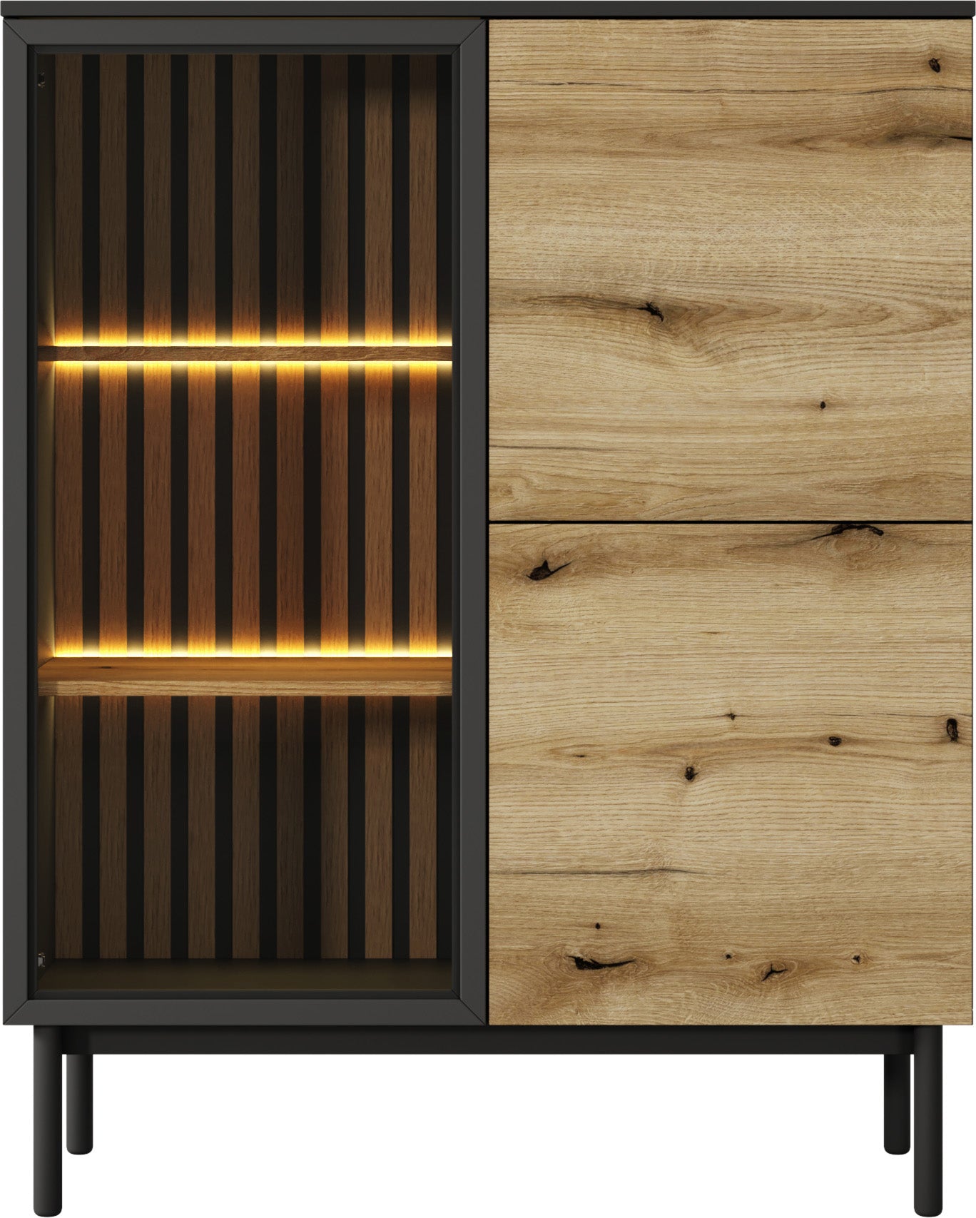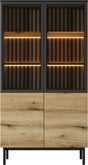 Die Vitrinen der Holmric-Serie vereinen modernes Design mit ausdrucksstarken Materialien – perfekt für stilvolle Wohnkonzepte mit Charakter. Die Kombination aus mattschwarzem Korpus, Evoke Eiche-Lamellen und Glasfronten mit schwarzem MDF-Rahmen sorgt für eine hochwertige, kontrastreiche Optik.