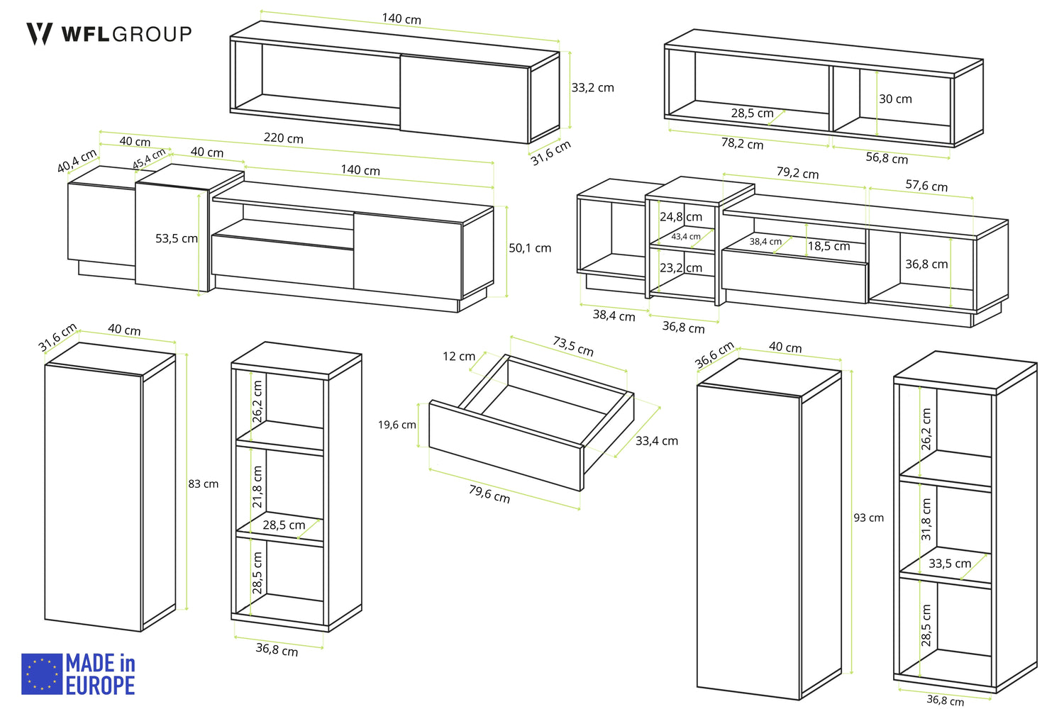 - Lowboard: B 220 × H 53,5 × T 45 cm